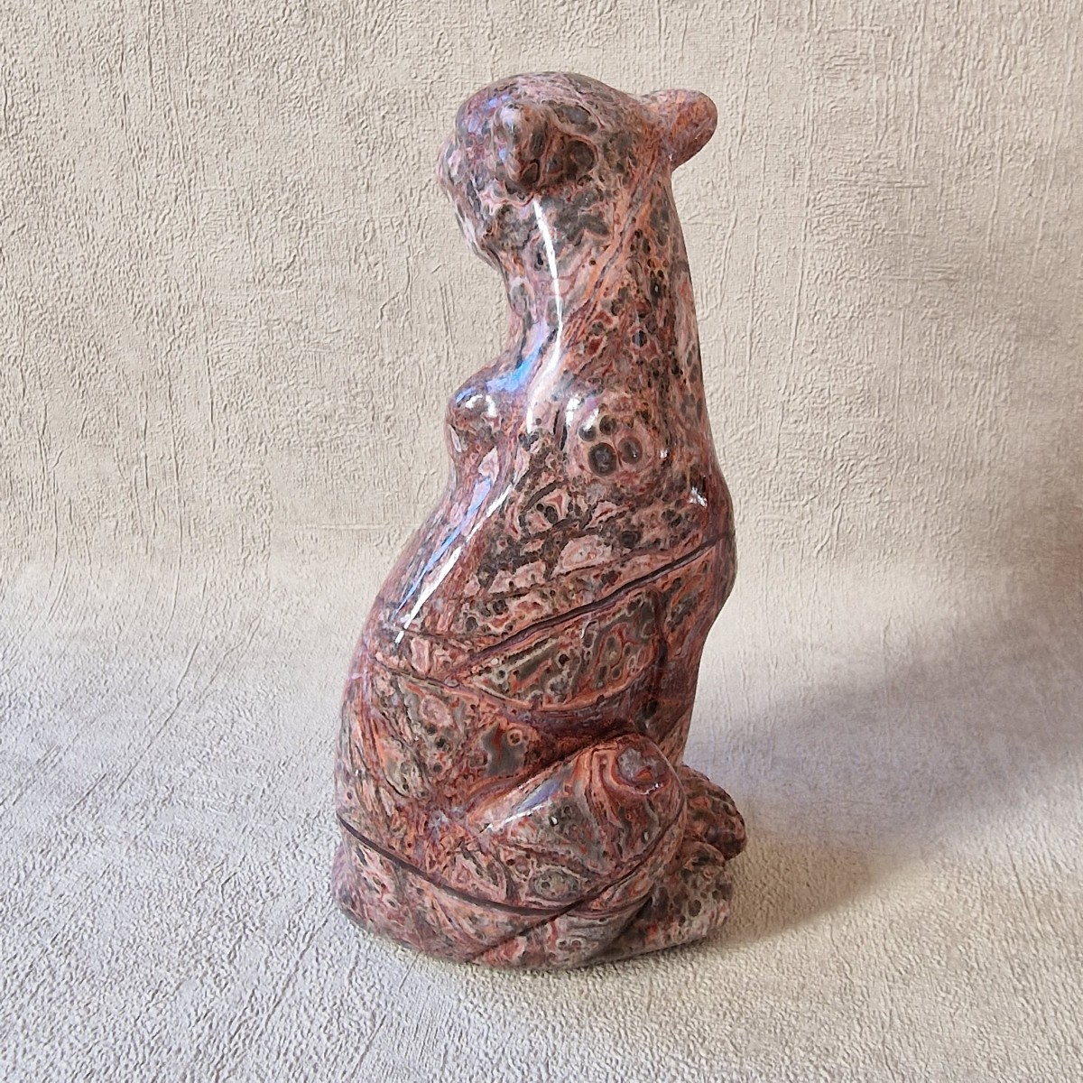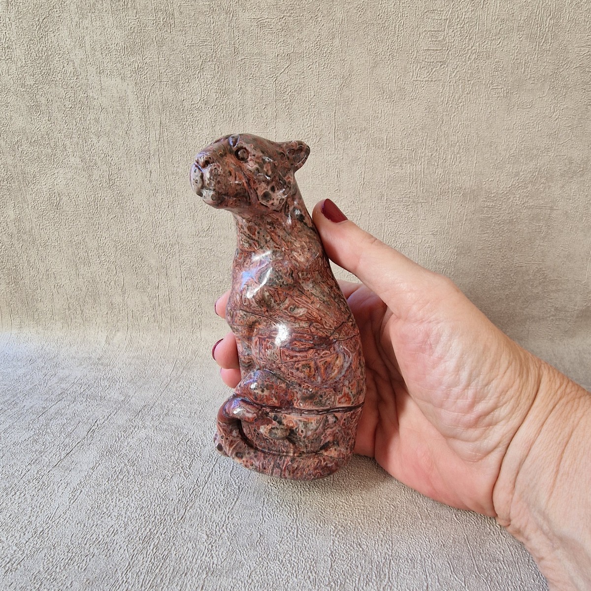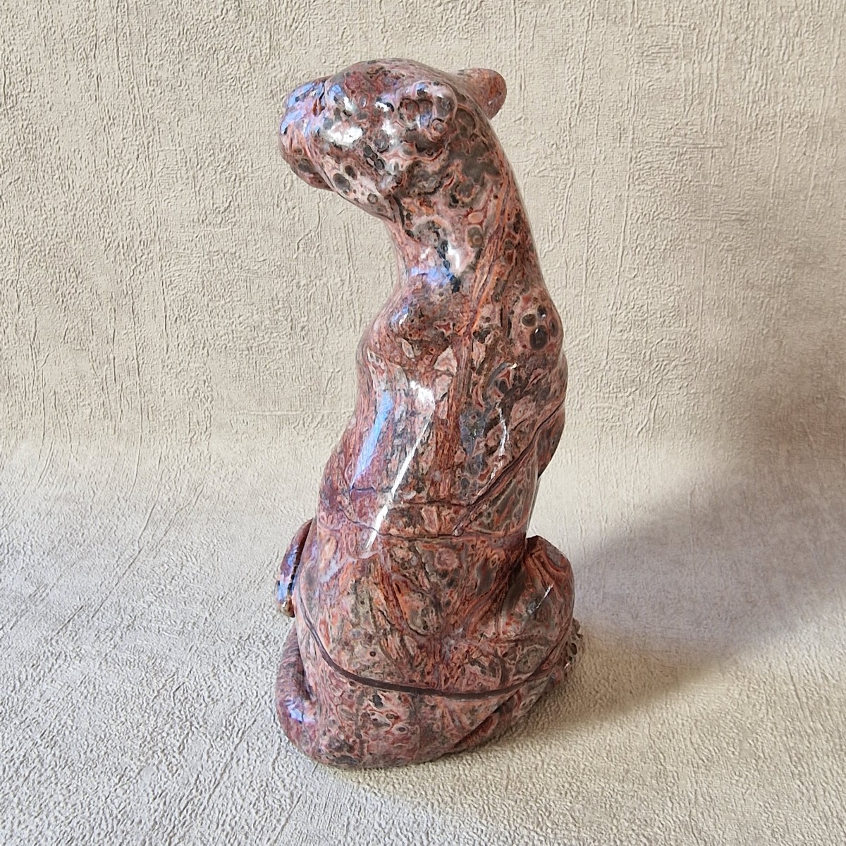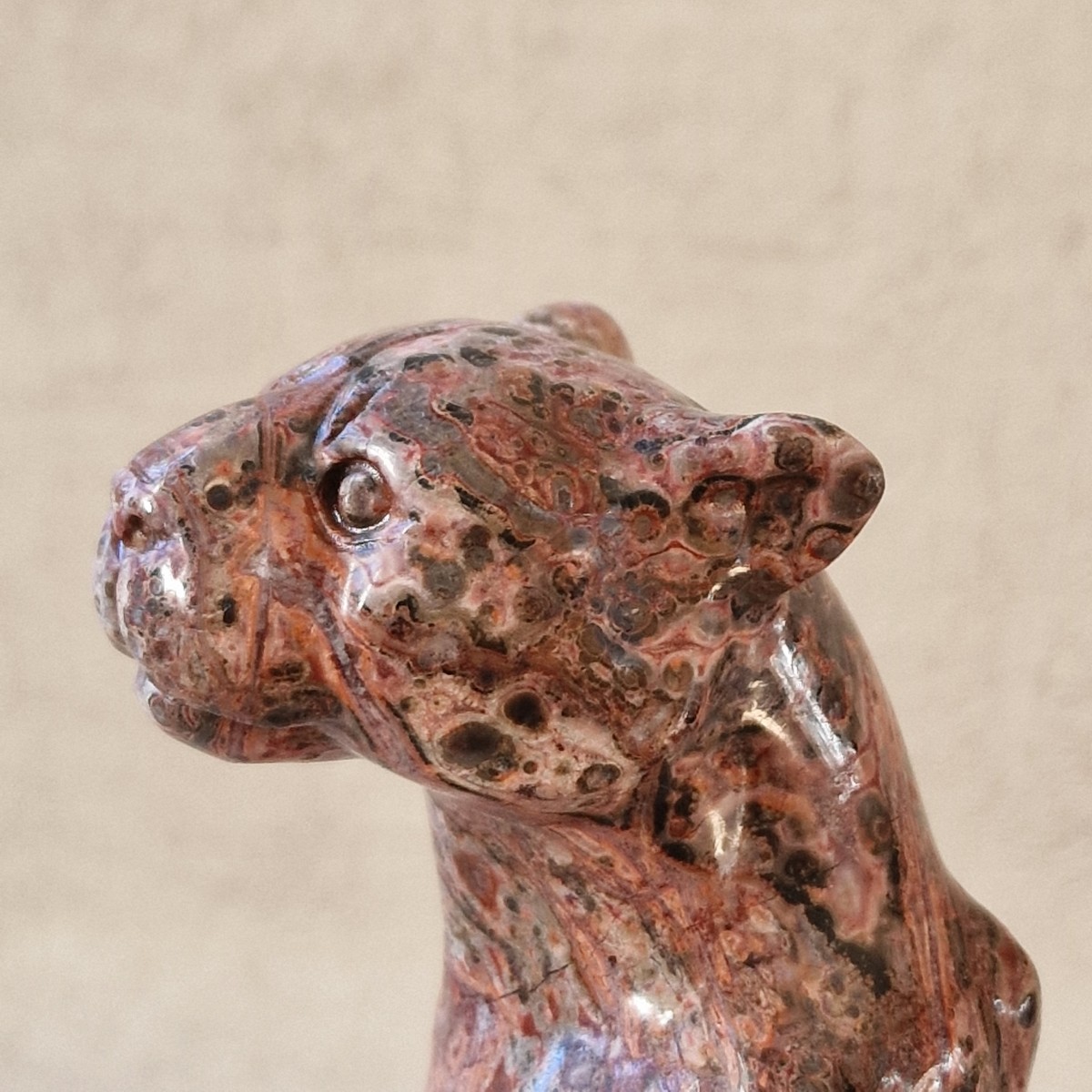 Léopard en jaspe léopard/ rhyolite, +/- 13 cm. Le léopard symbolise la puissance, le courage, la force tranquille et protectrice.(AN19)