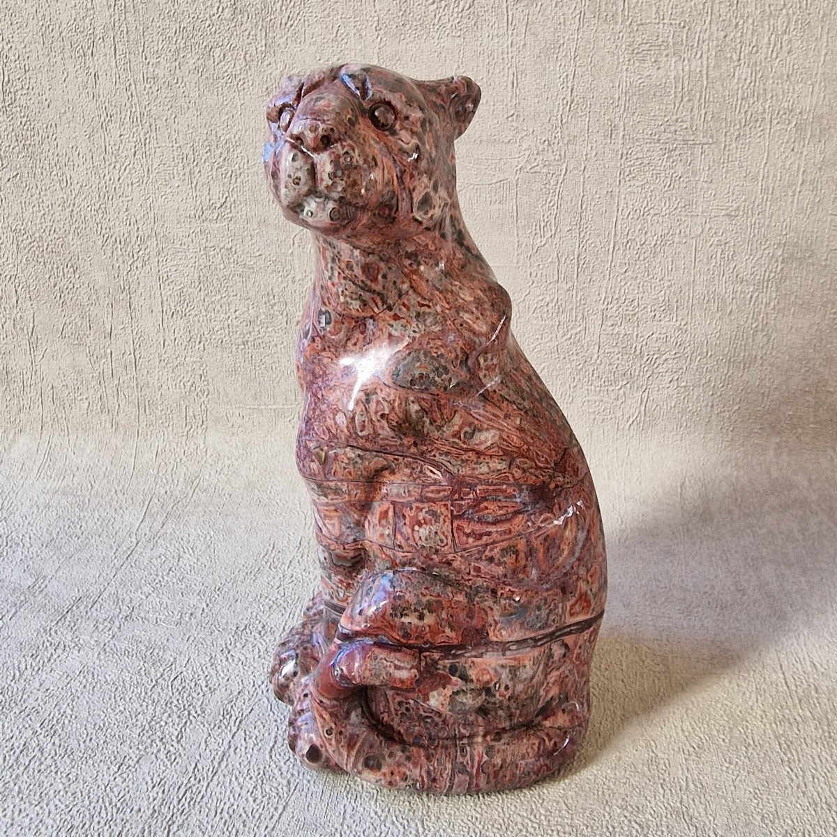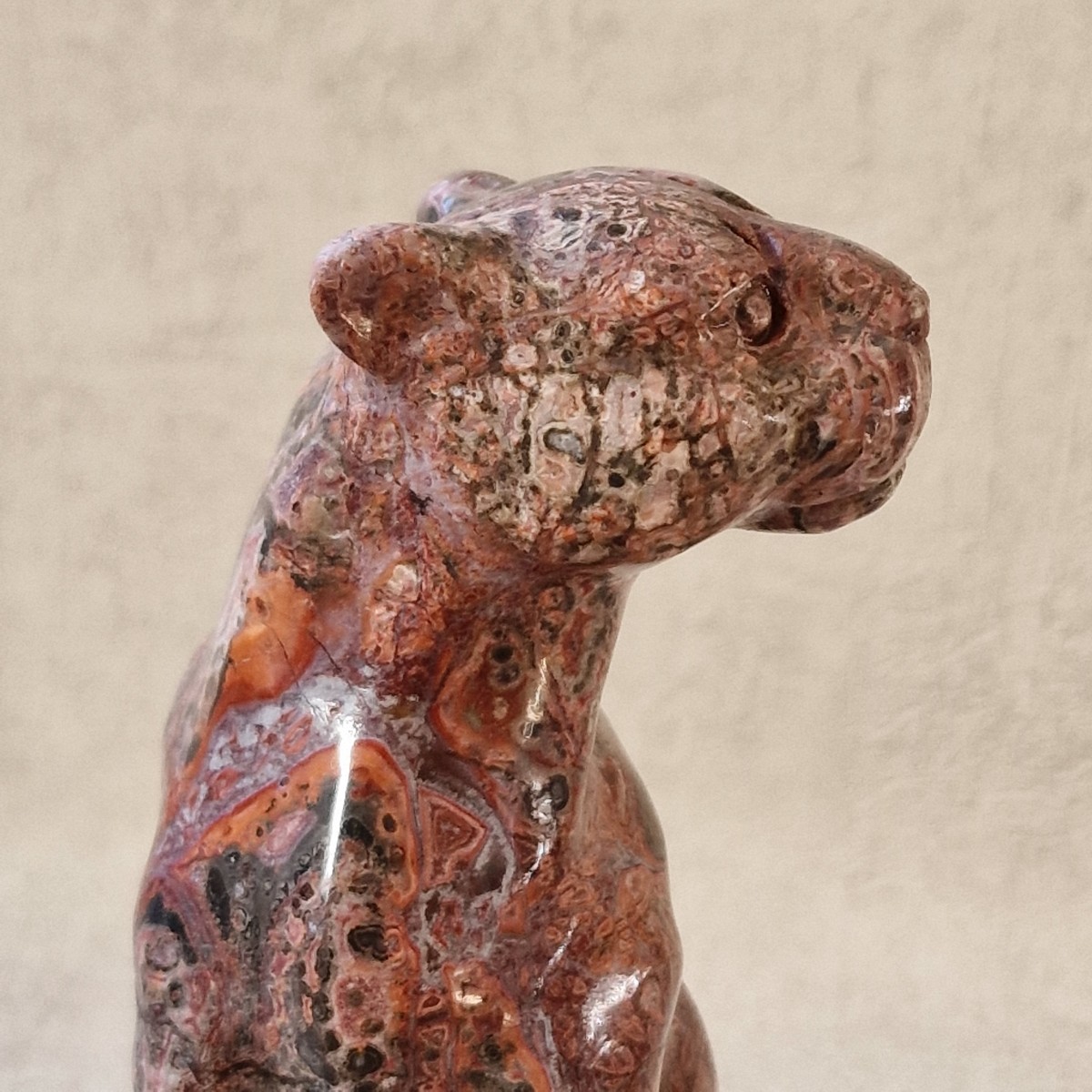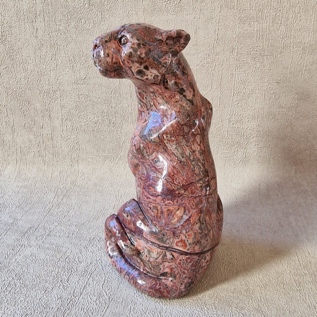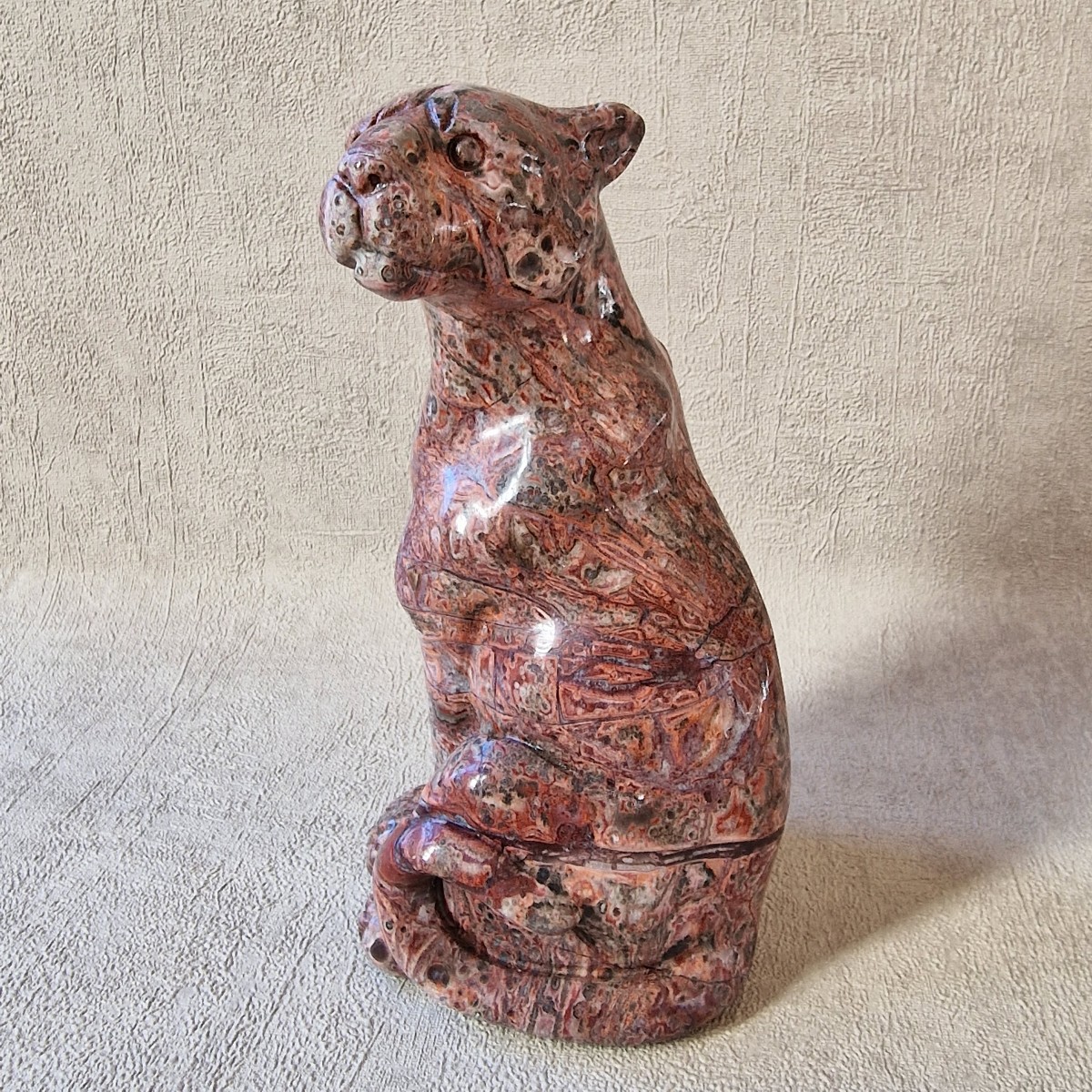 Léopard en jaspe léopard/ rhyolite, +/- 13 cm. Le léopard symbolise la puissance, le courage, la force tranquille et protectrice.(AN19)