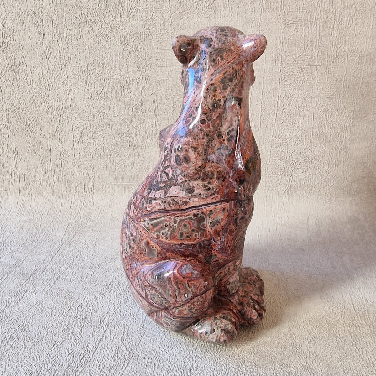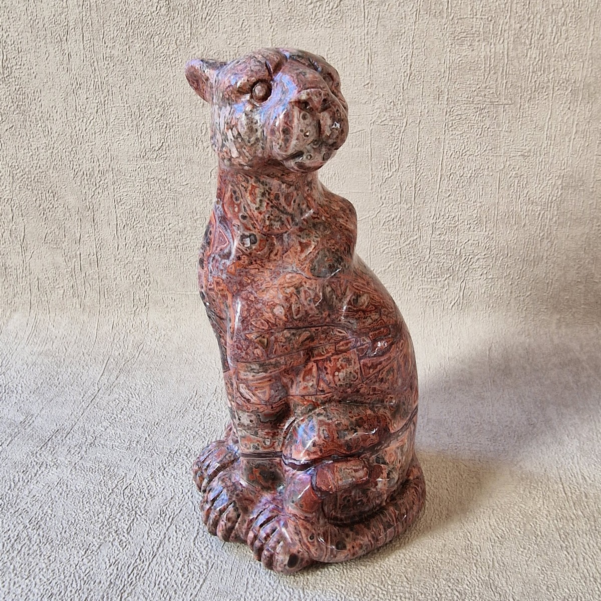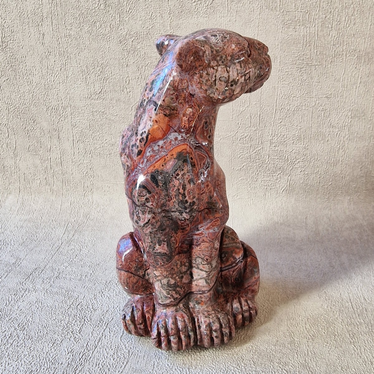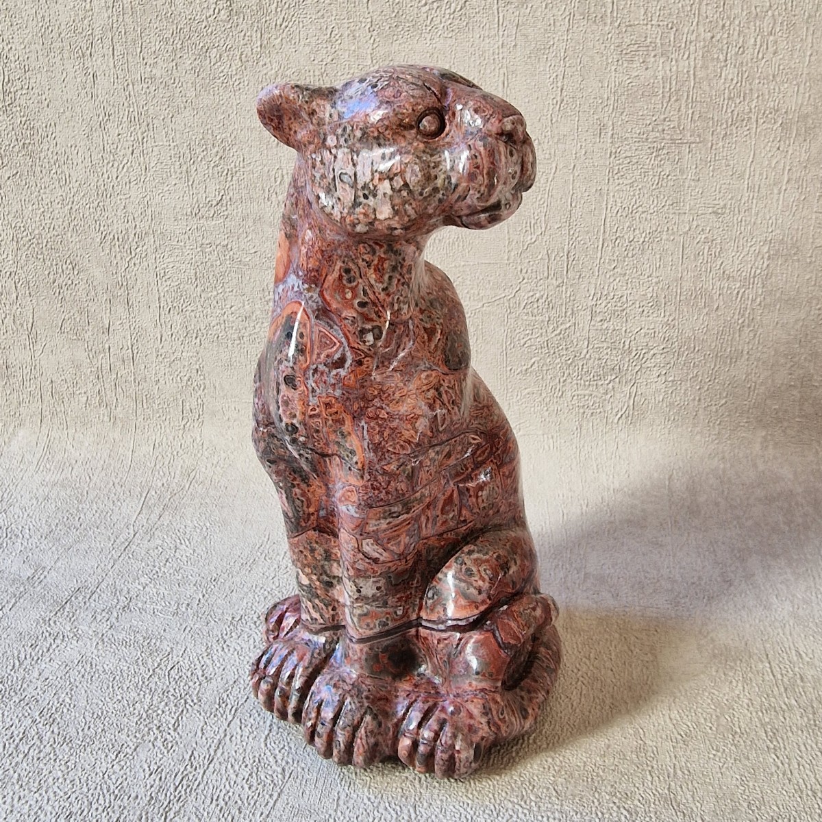 Léopard en jaspe léopard/ rhyolite, +/- 13 cm. Le léopard symbolise la puissance, le courage, la force tranquille et protectrice.(AN19)