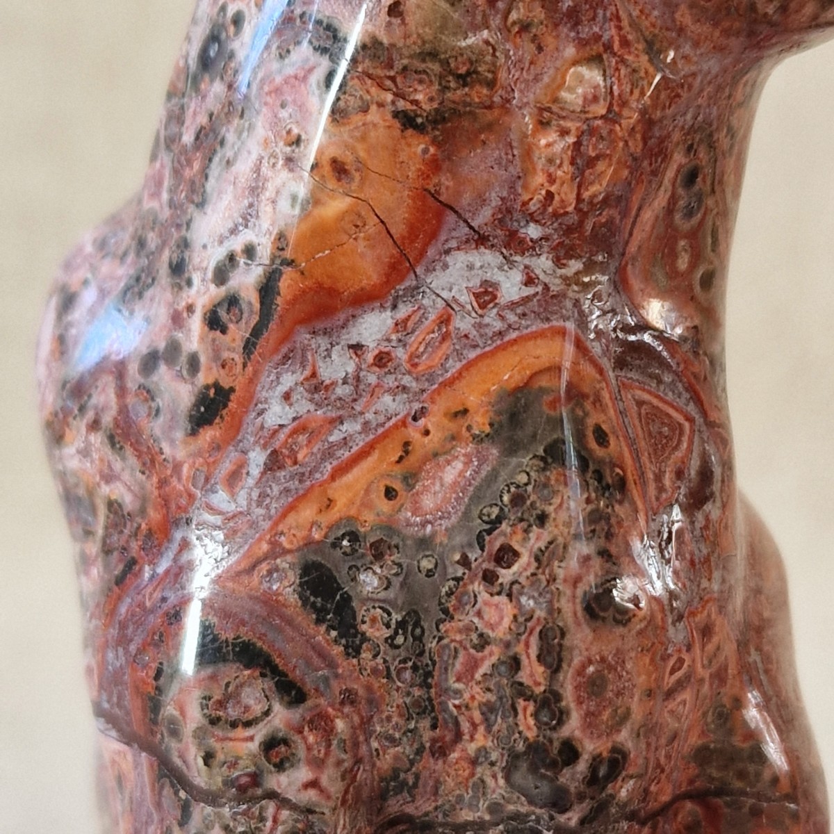 Cette pierre commercialisée sous le nom de "jaspe léopard", n'est pas réellement un jaspe mais une roche rhyolitique, tout comme le jaspe kambaba, le jaspe oeil d'oiseau, le jaspe forêt tropicale.