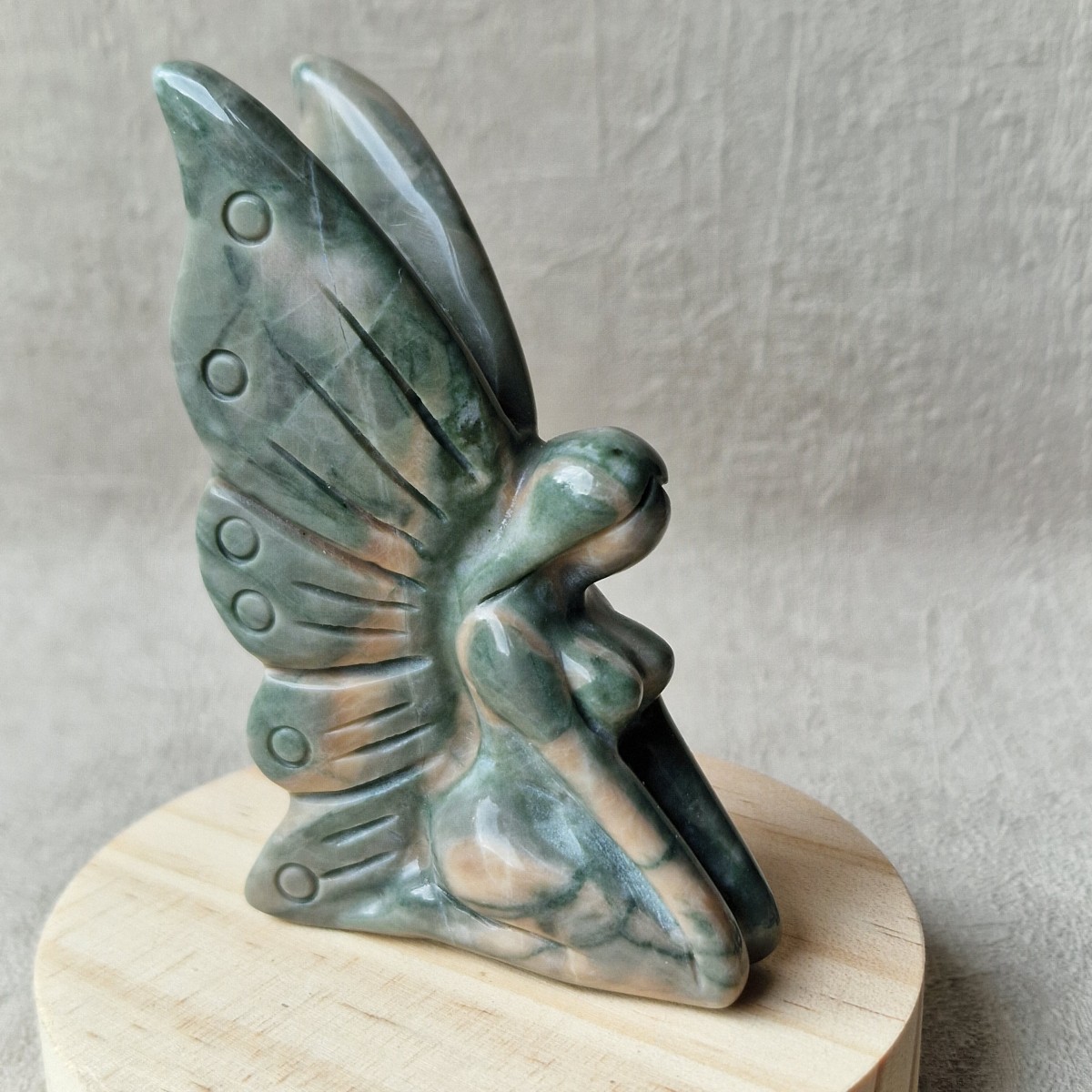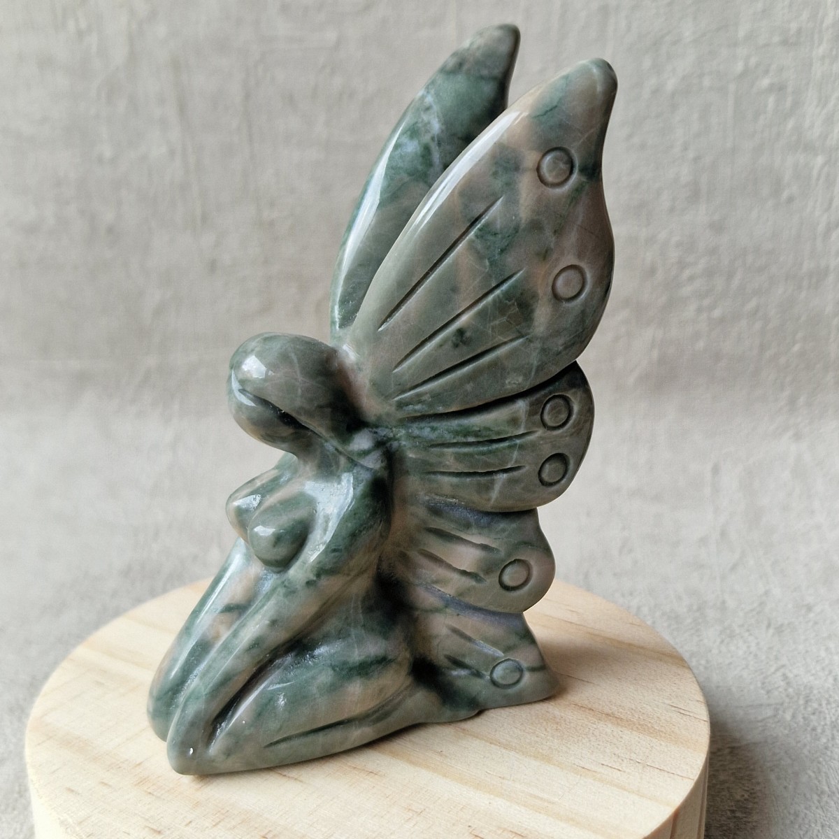 Fée en jaspe vert. Les fées, gardiennes de la nature et de la magie, sont associées à l'amour, la beauté, la féminité et la protection.(AN14-5)