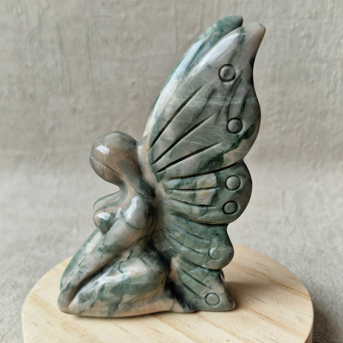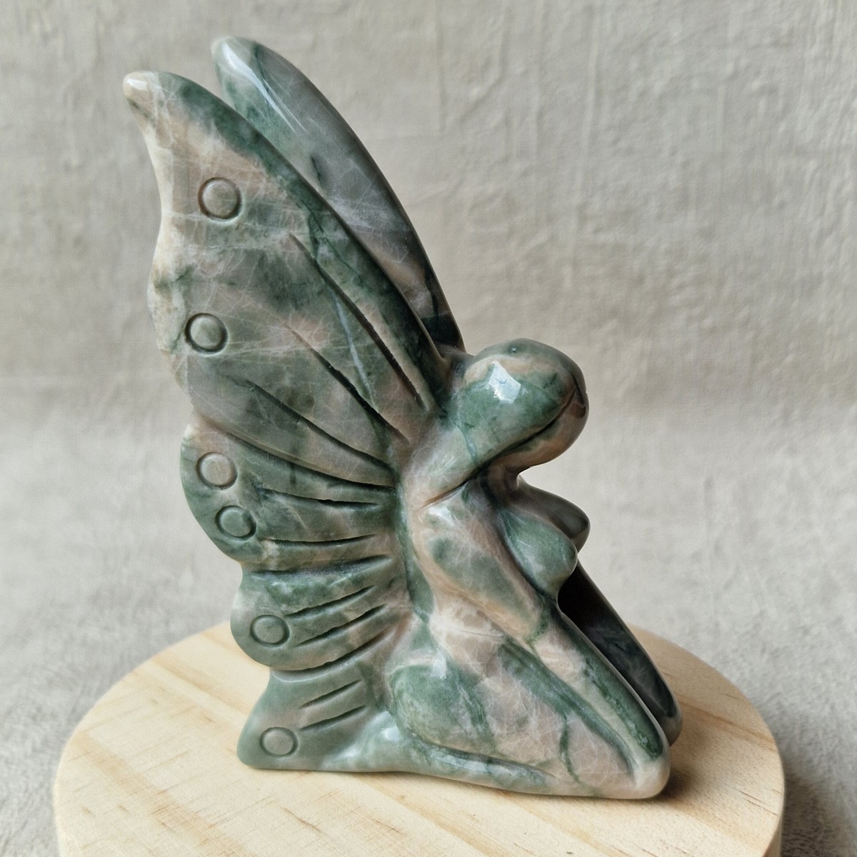 Fée en jaspe vert. Les fées, gardiennes de la nature et de la magie, sont associées à l'amour, la beauté, la féminité et la protection.(AN14-7)