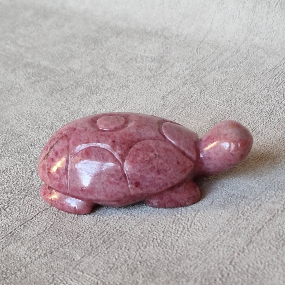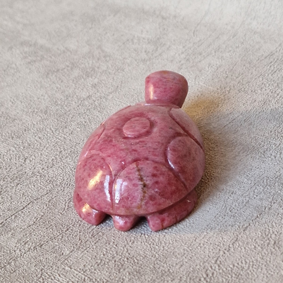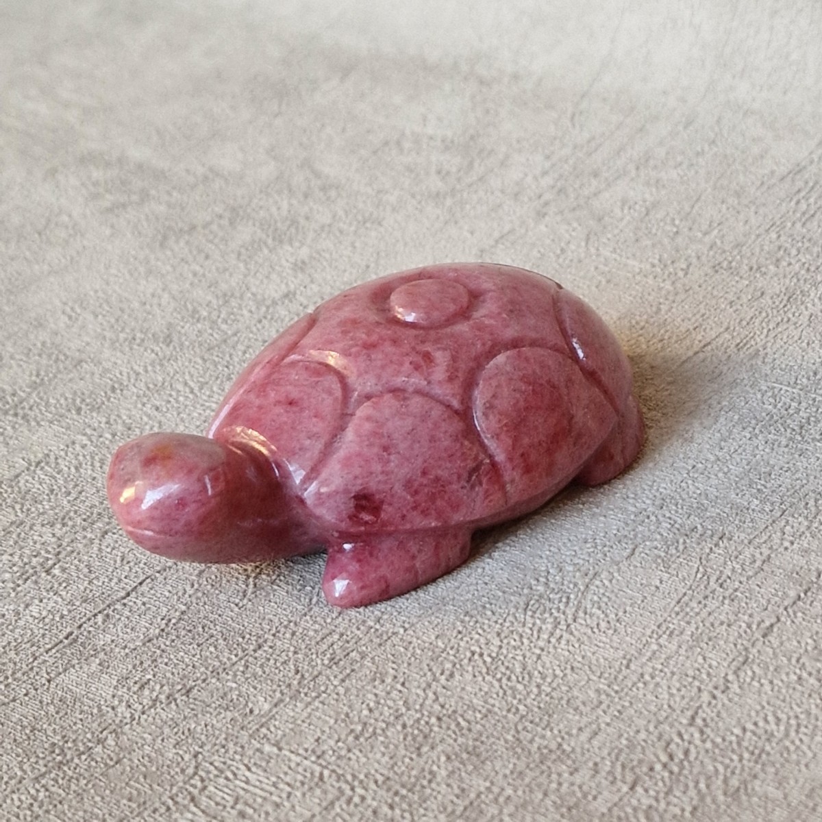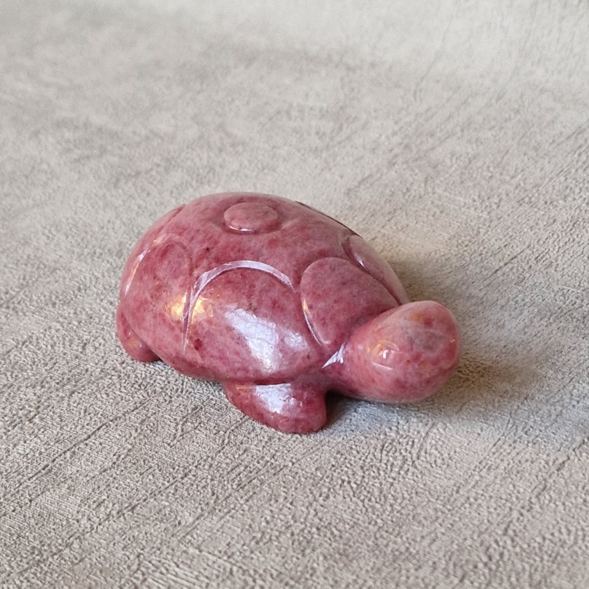 Tortue en rhodonite, +/- 7,6 cm. La tortue symbolise la longévité, la sagesse, la résilience et la paix. La rhodonite apaise et soigne le coeur.(FG44-2)