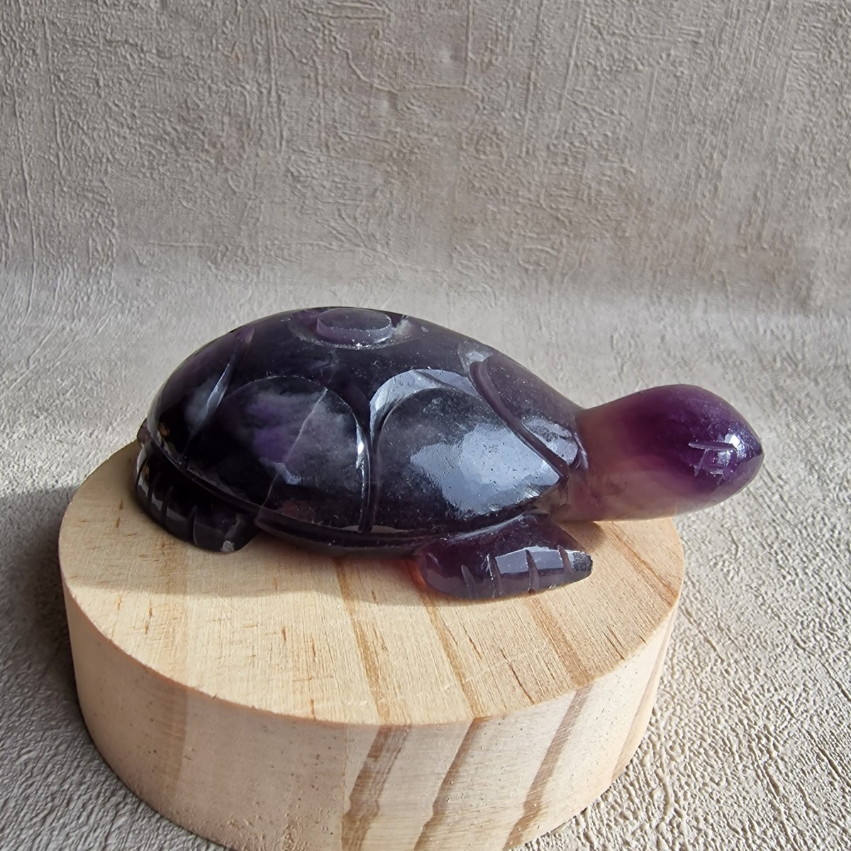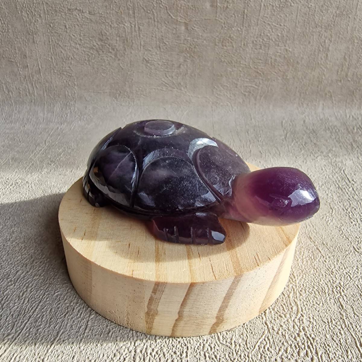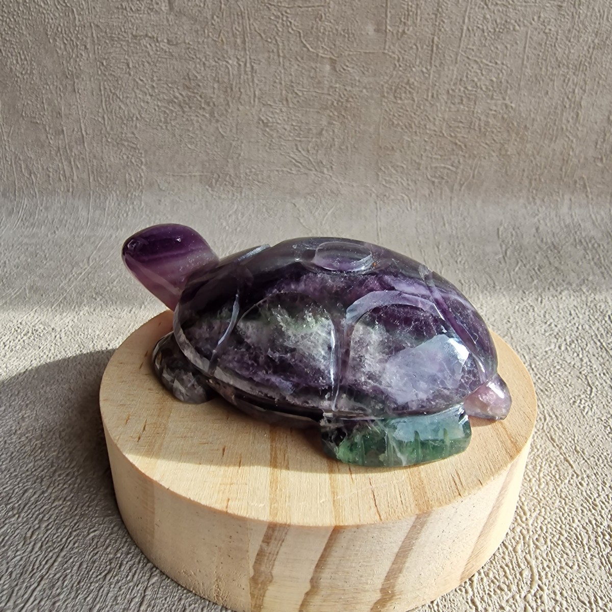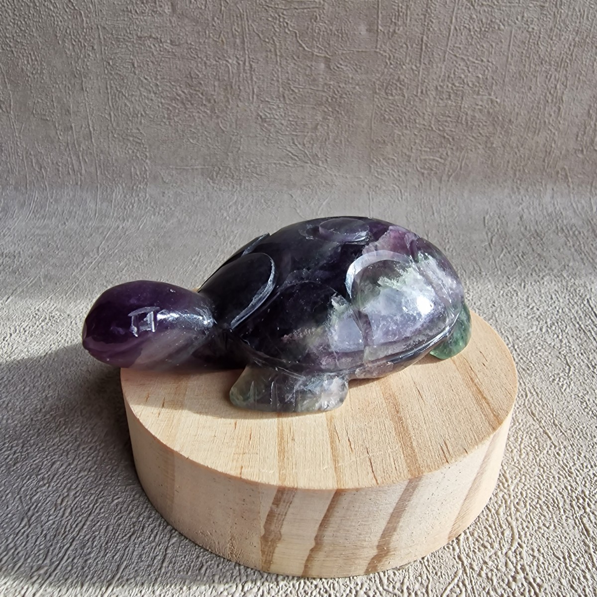 Tortue taillée dans la fluorite de +/- 8,5 cm. Symbolique : la tortue en fluorite c'est en quelque sorte la "Patience organisée".(FG39-5)