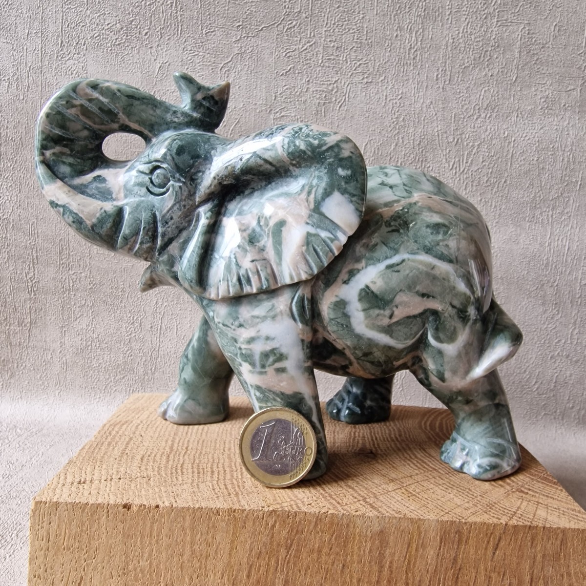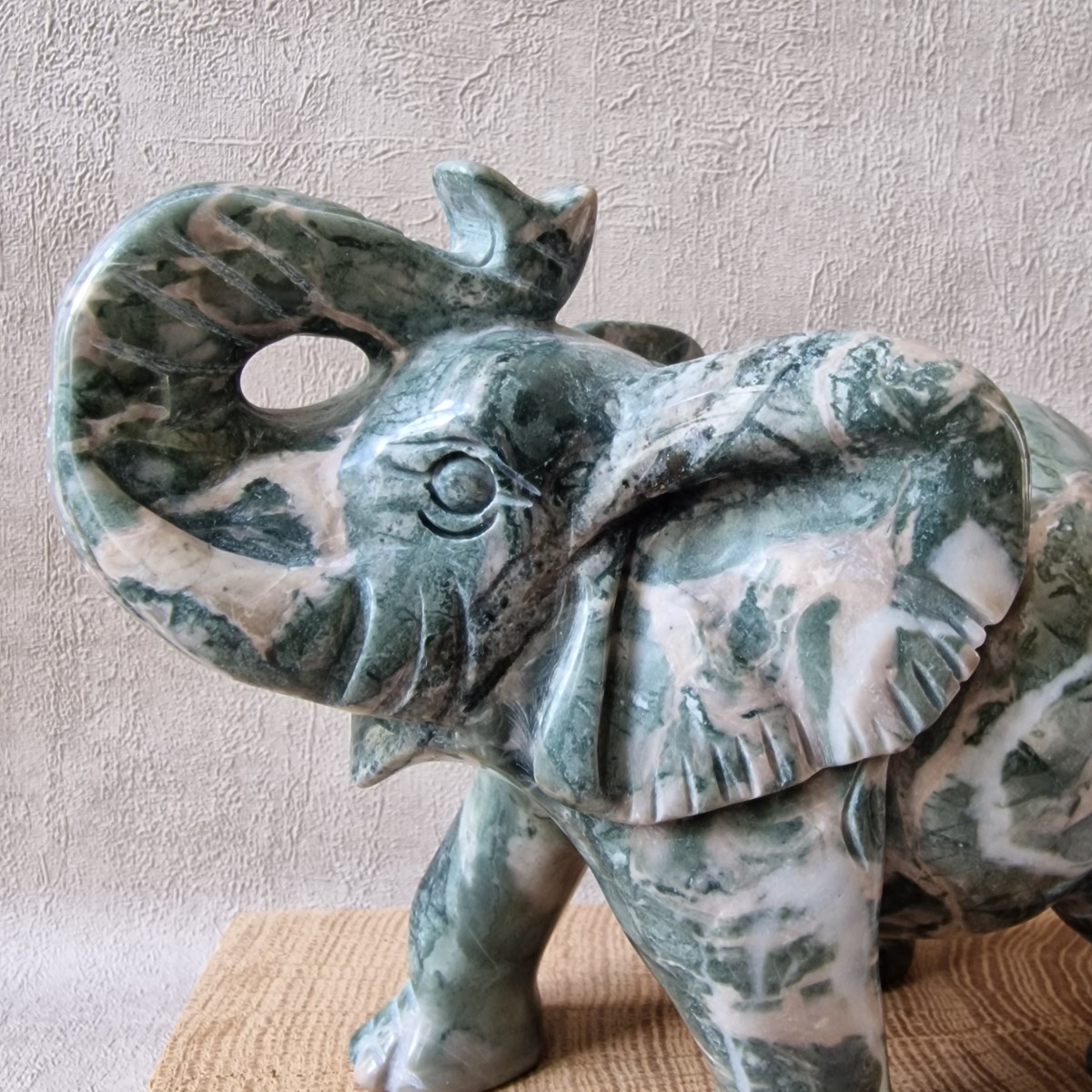 Le jaspe vert vient nuancer la force brute de l’éléphant. Cette pierre de "croissance" est appréciée pour :