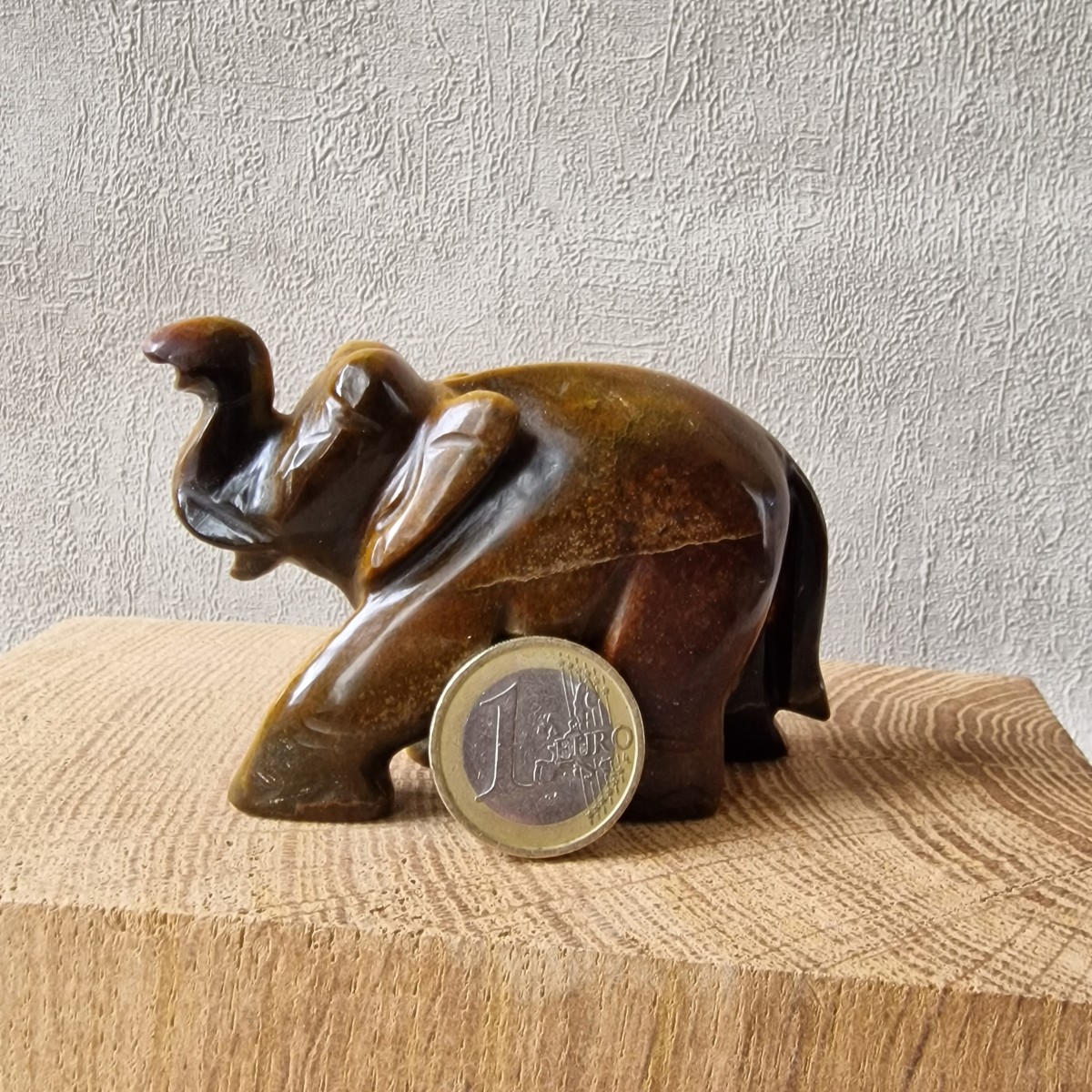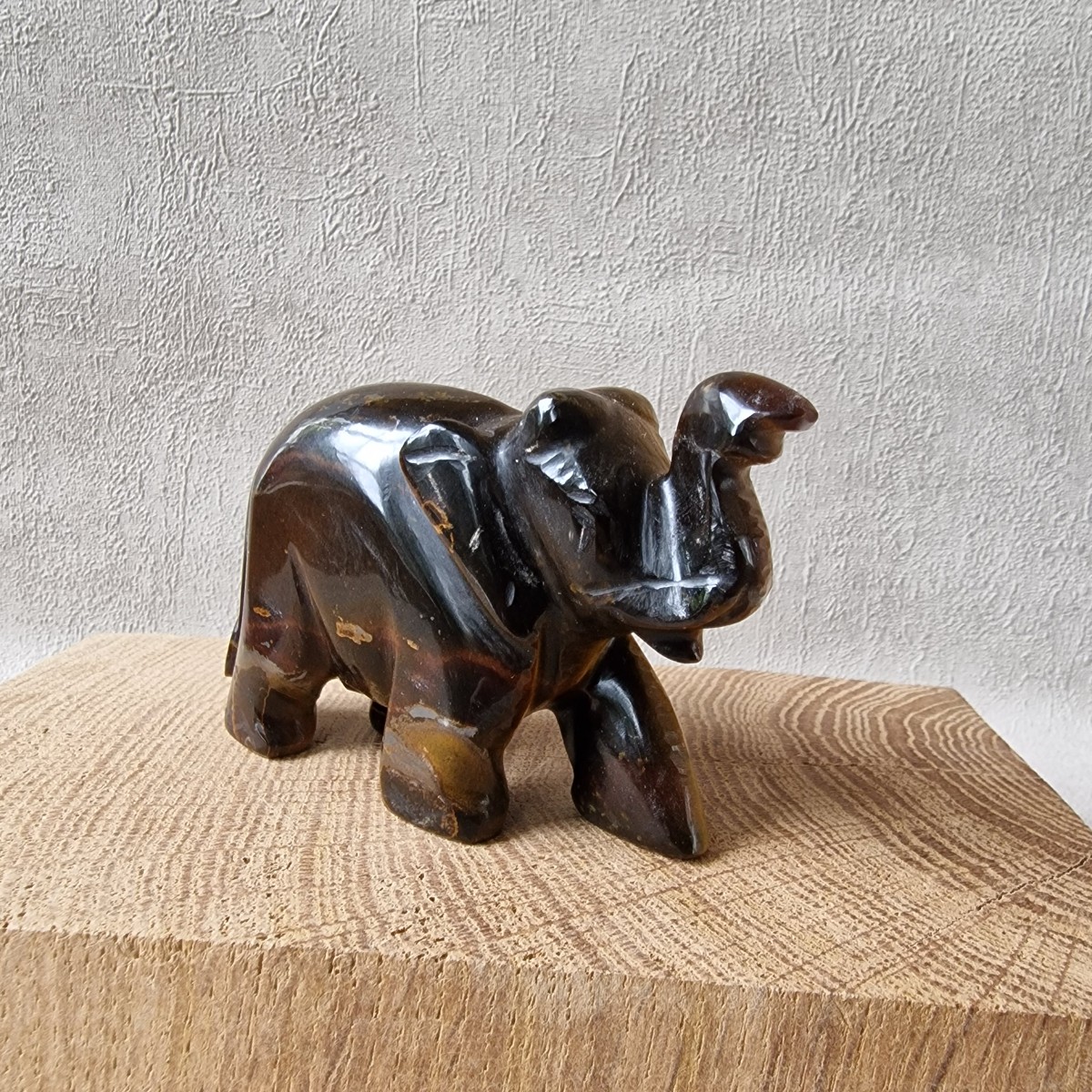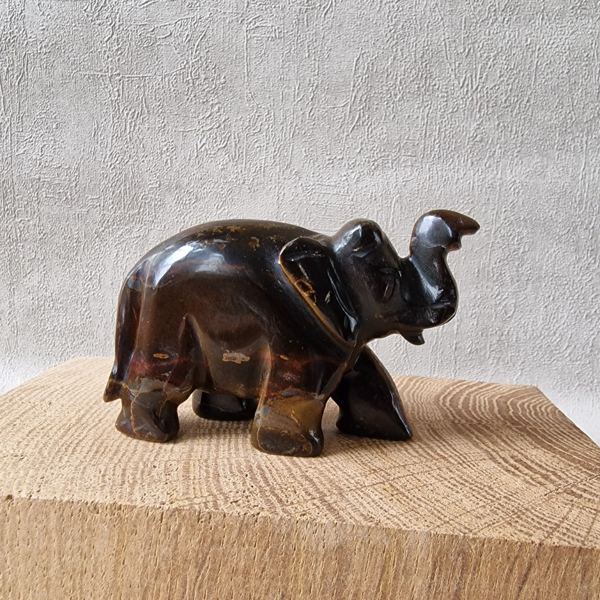 Éléphant d'Asie en Oeil de Tigre. Symbolique : cette statuette ancre la Sagesse, la Protection, la Persévérance et la Prospérité.(FG46-1)