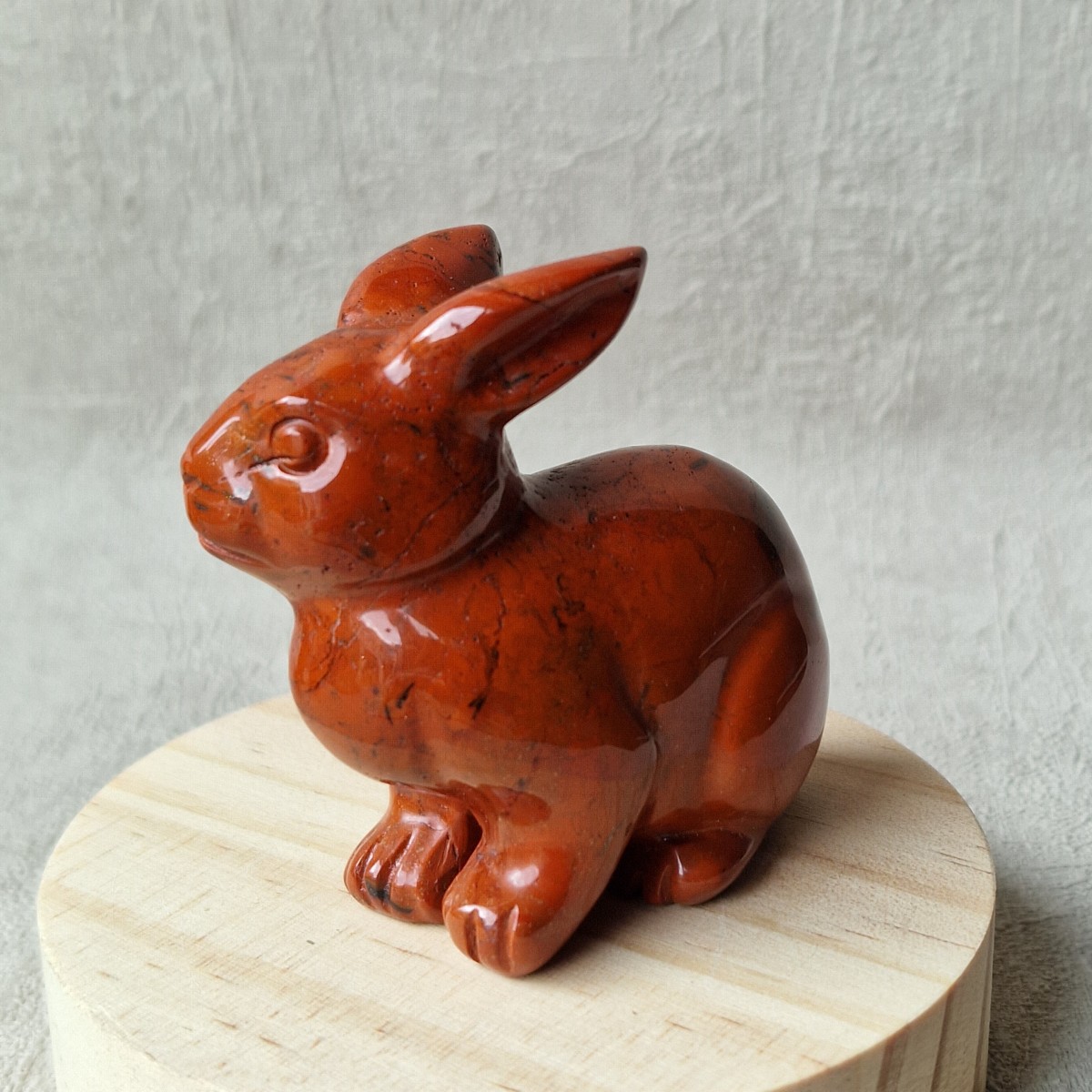 Lapin sculpté dans du Jaspe rouge, +/ 5,5 cm. Le lapin symbolise le réveil de la nature, la régénération, la vie et la résurrection .(AN10-2)