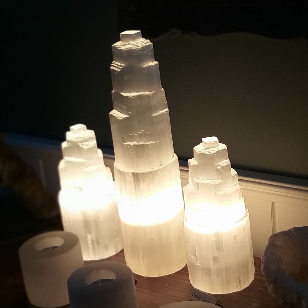 Lampe en sélénite "tour" de +/- 20 cm de haut et base de +/- 9 cm de diamètre (petite). Lithothérapie : régénère et équilibre les énergies. (24139)