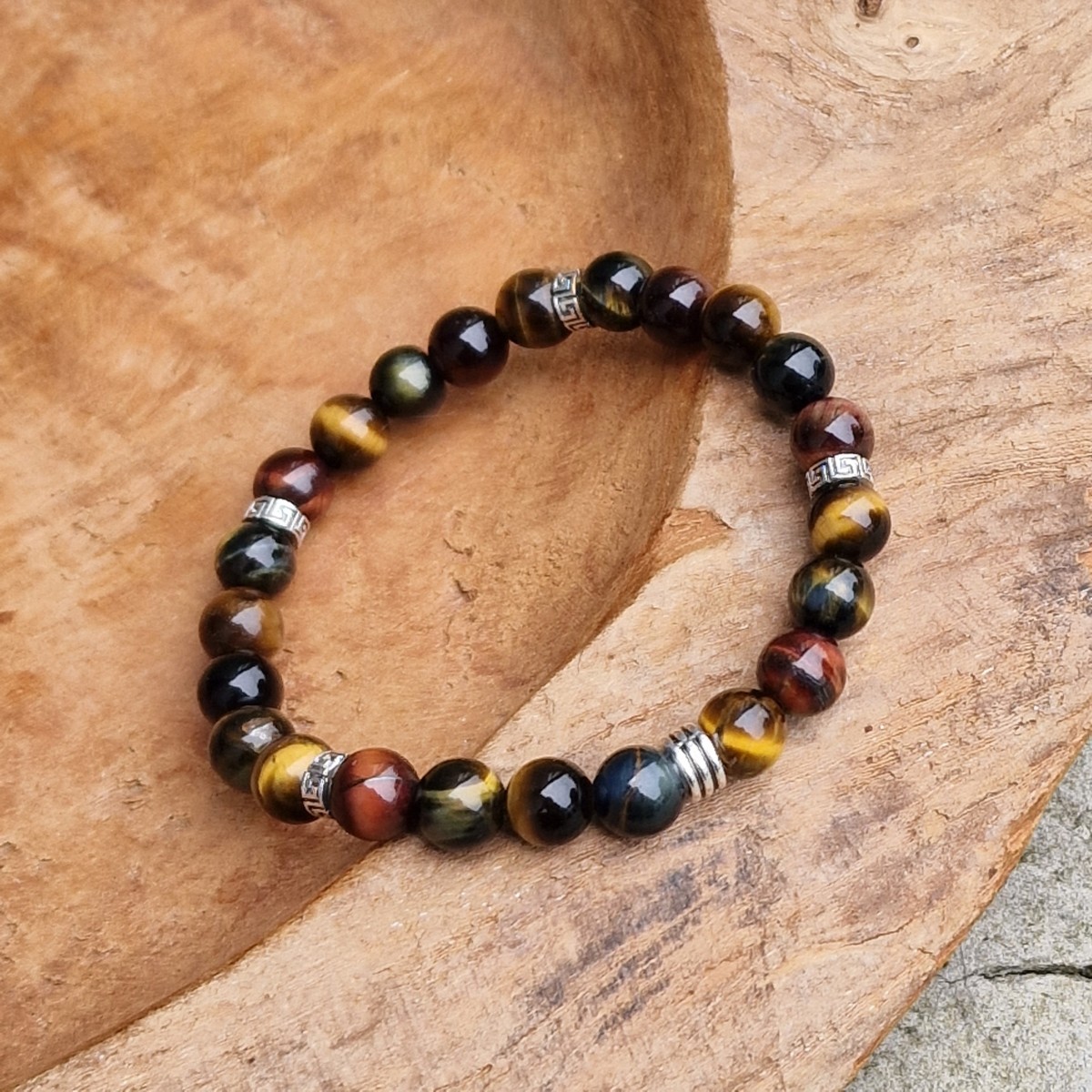 Bracelet élastique, taille L, en perles oeil de tigre, oeil de faucon et oeil de taureau, de +/- 8 mm. Lithothérapie: protège et donne force et courage.(BR149L)