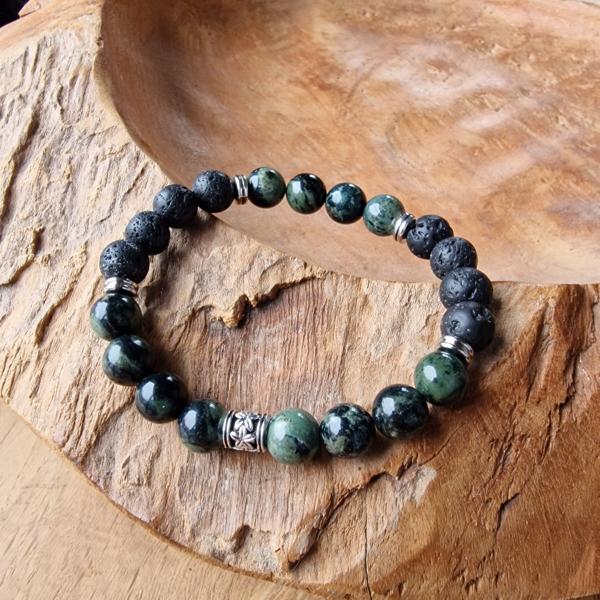 Bracelet élastique, médium, perles de jaspe kambaba et pierre de lave, de +/- 8 mm. Lithothérapie: aide à se recentrer sur l'essentiel.(BR153M)