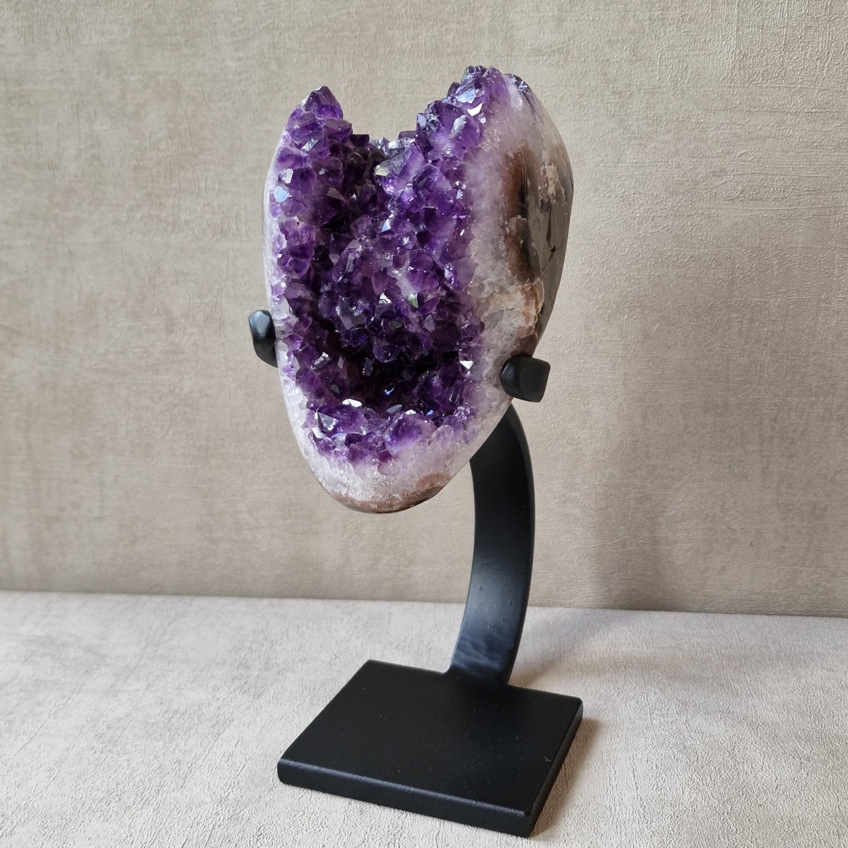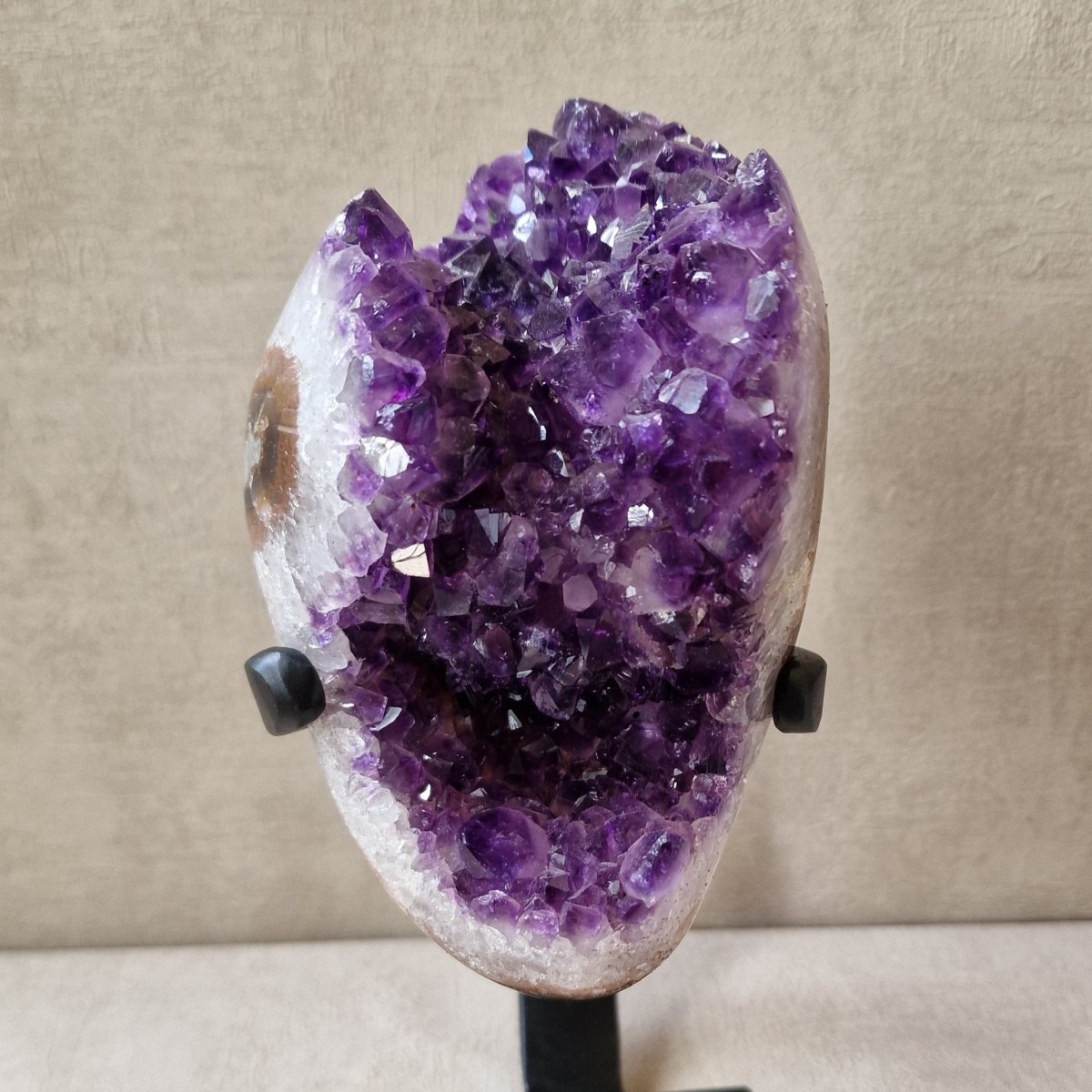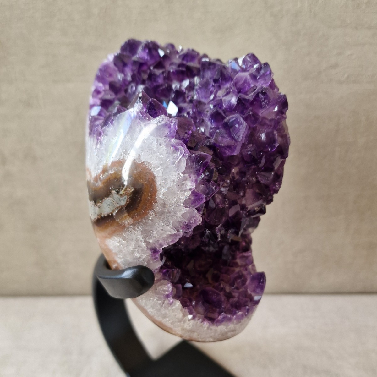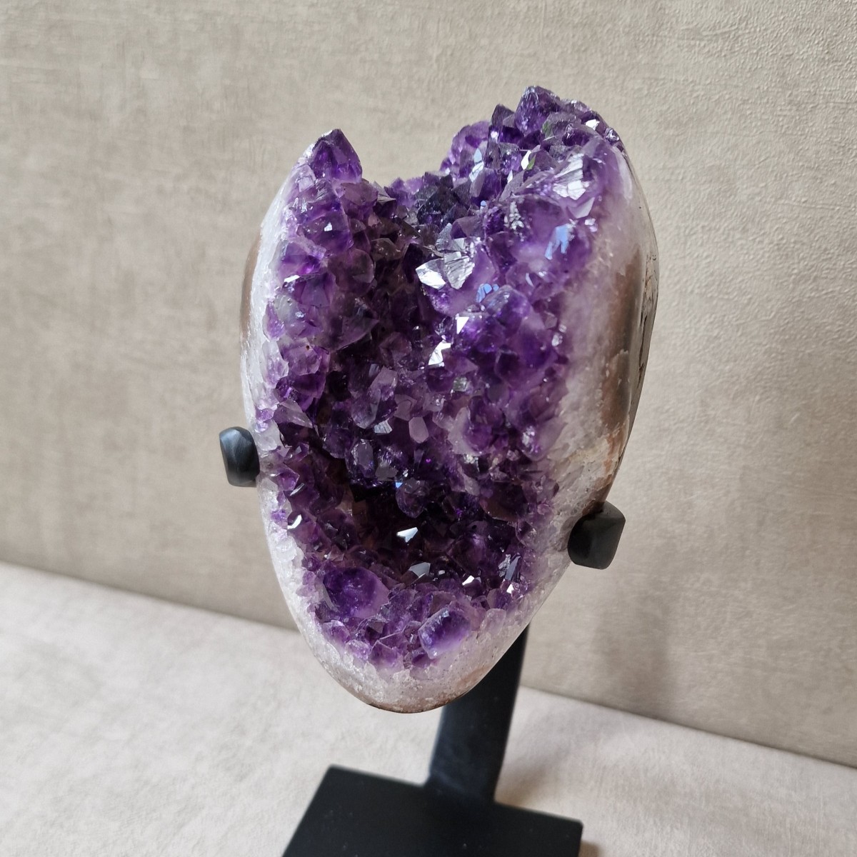 Améthyste d'Uruguay sur pied métallique de +/- 24 cm de haut. L'améthyste peut être dissociée du pied. Lithothérapie : apaisement, vitalité positive, spiritualité.(DR3)