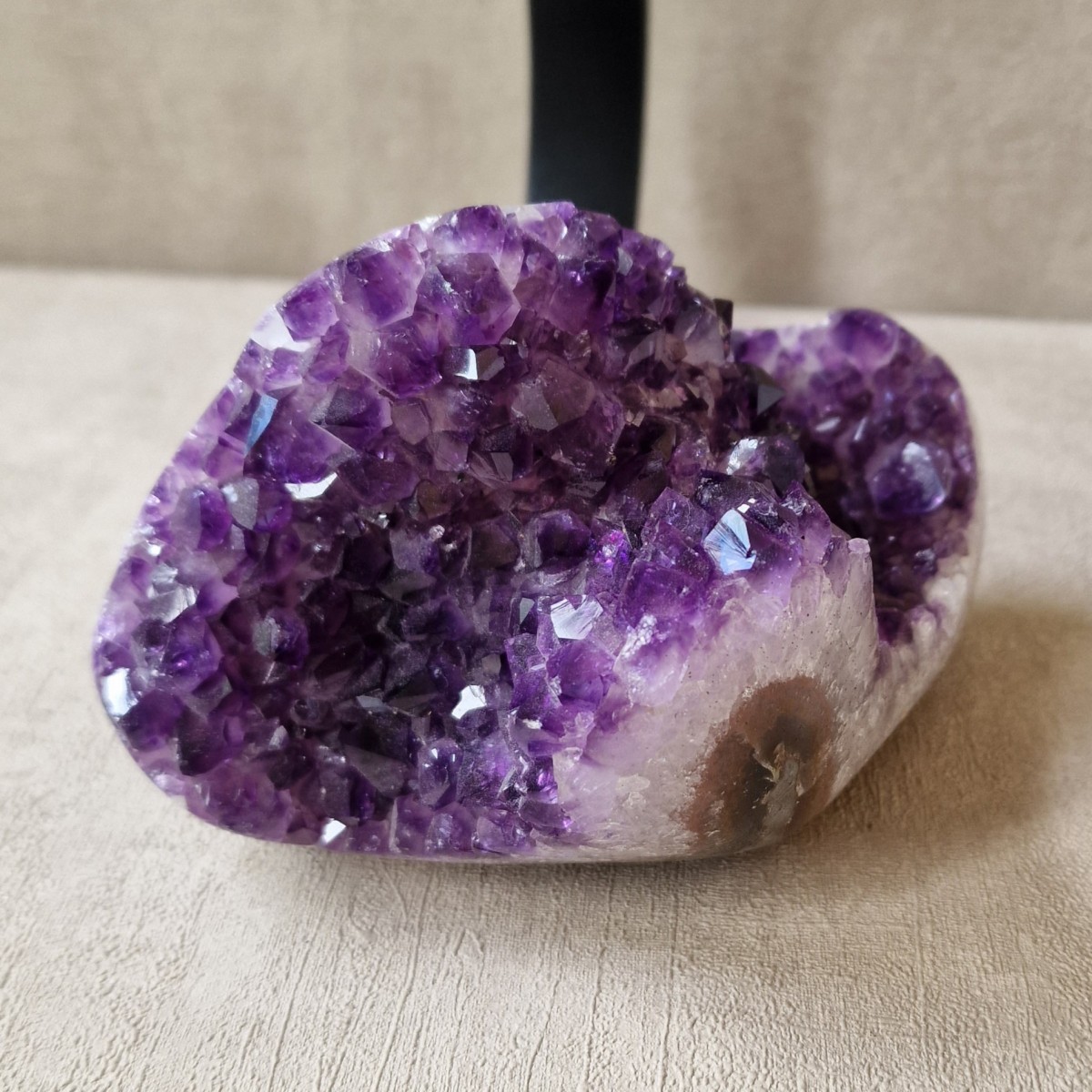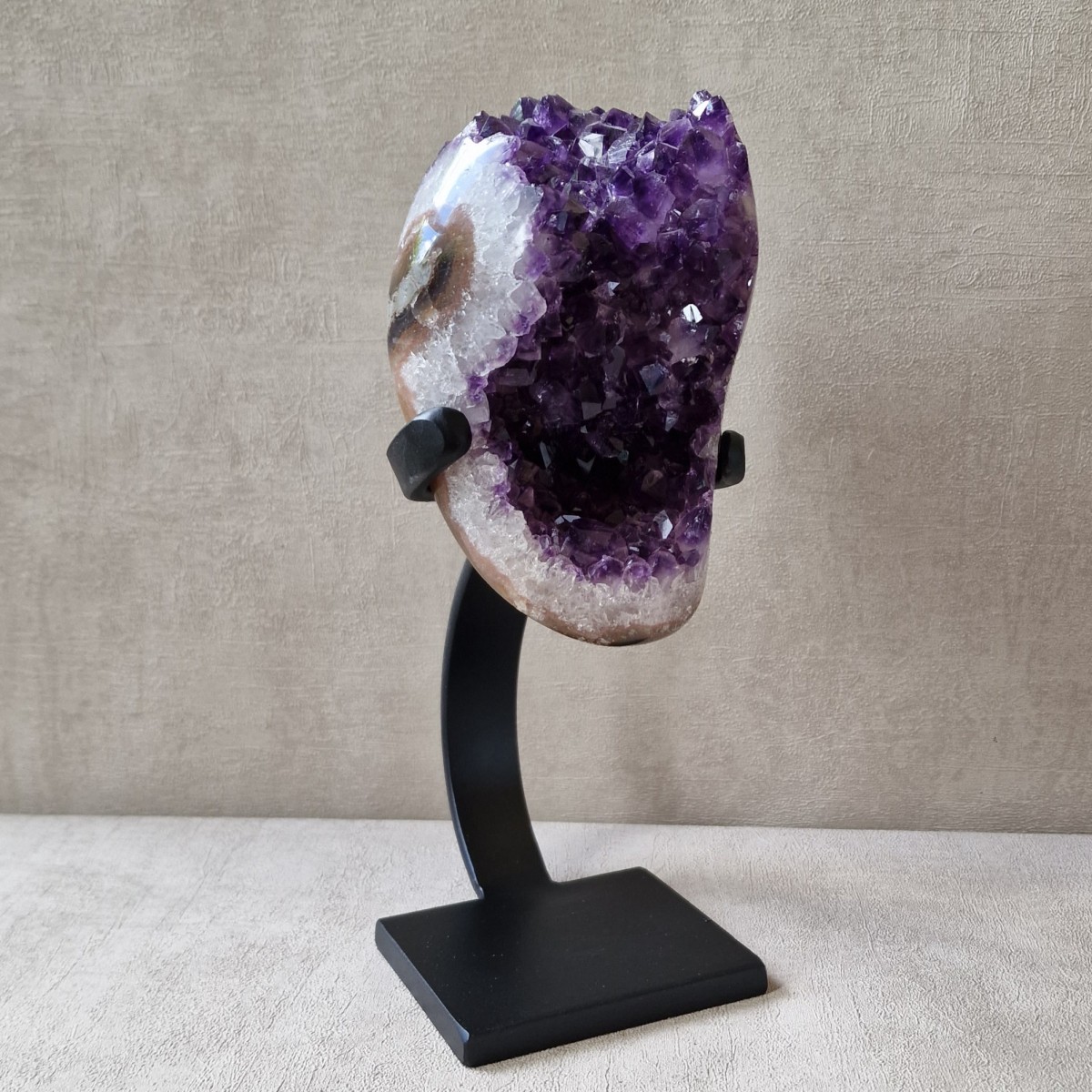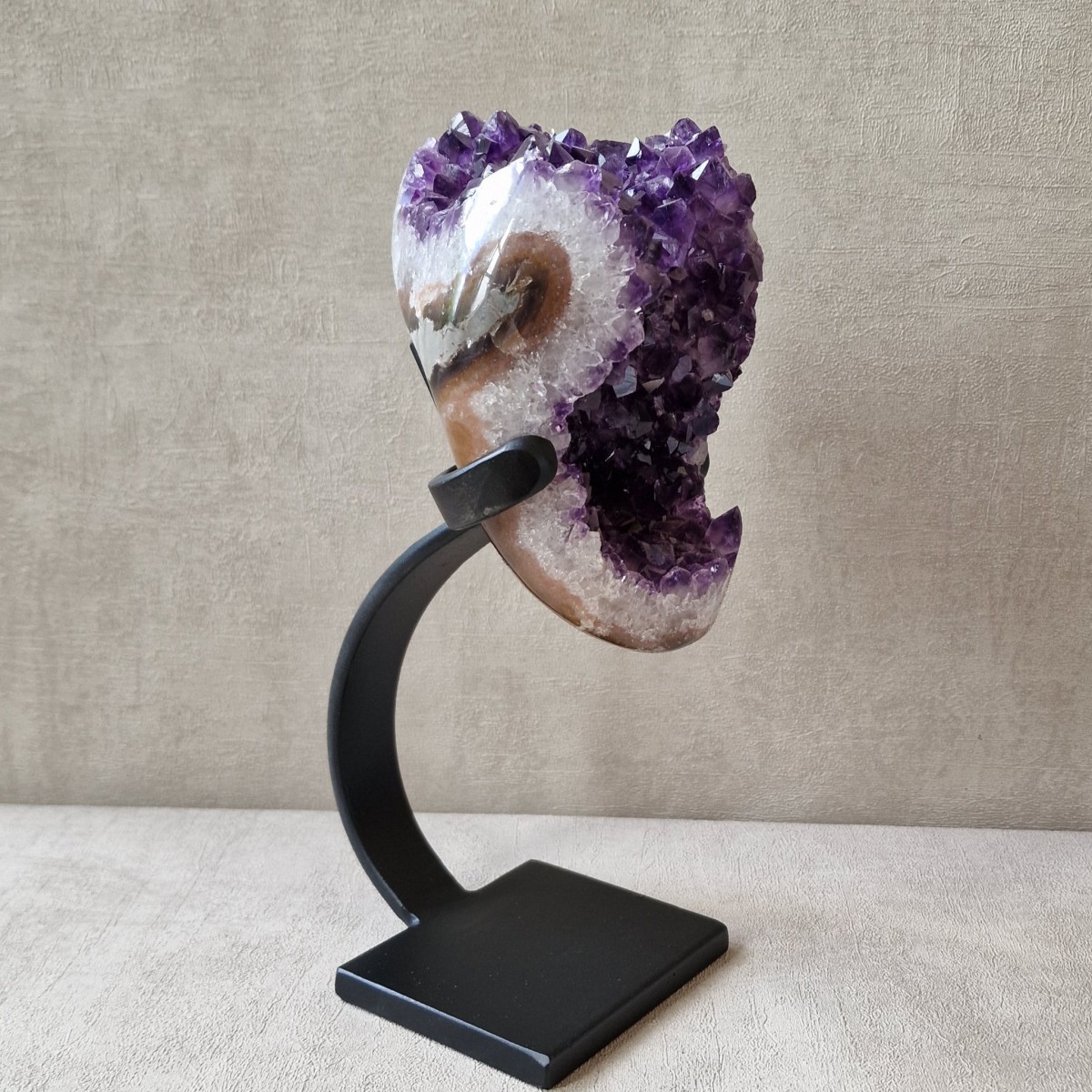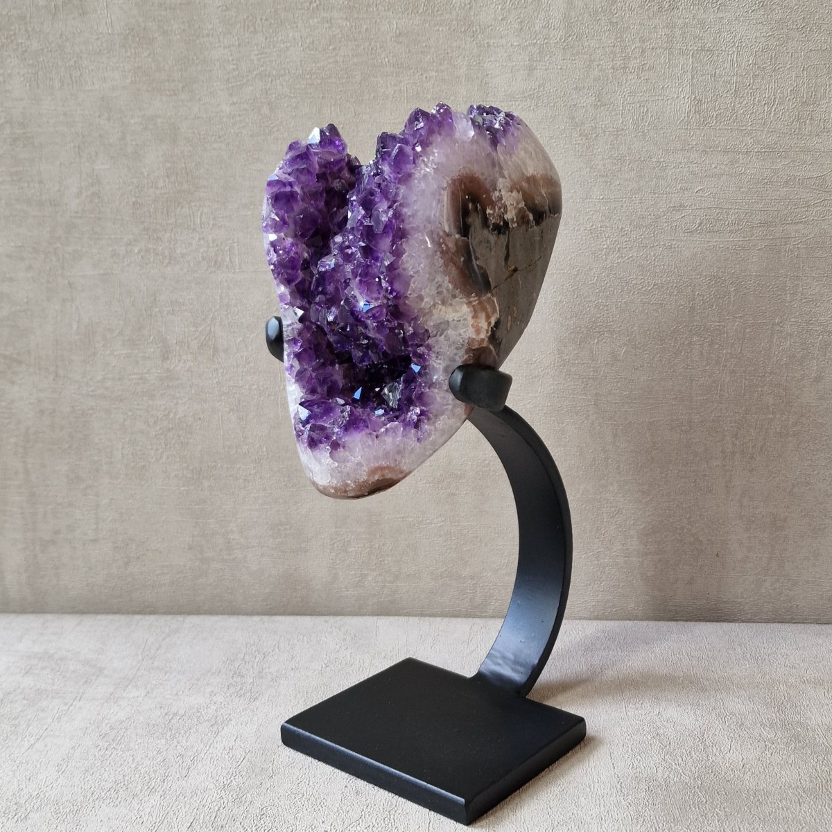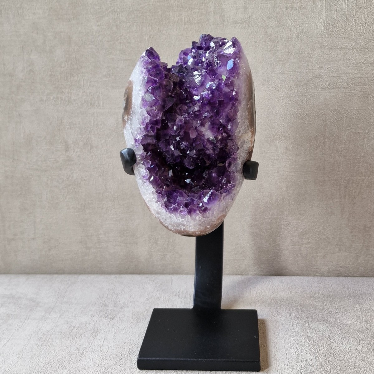 Améthyste d'Uruguay sur pied métallique de +/- 24 cm de haut. L'améthyste peut être dissociée du pied. Lithothérapie : apaisement, vitalité positive, spiritualité.(DR3)