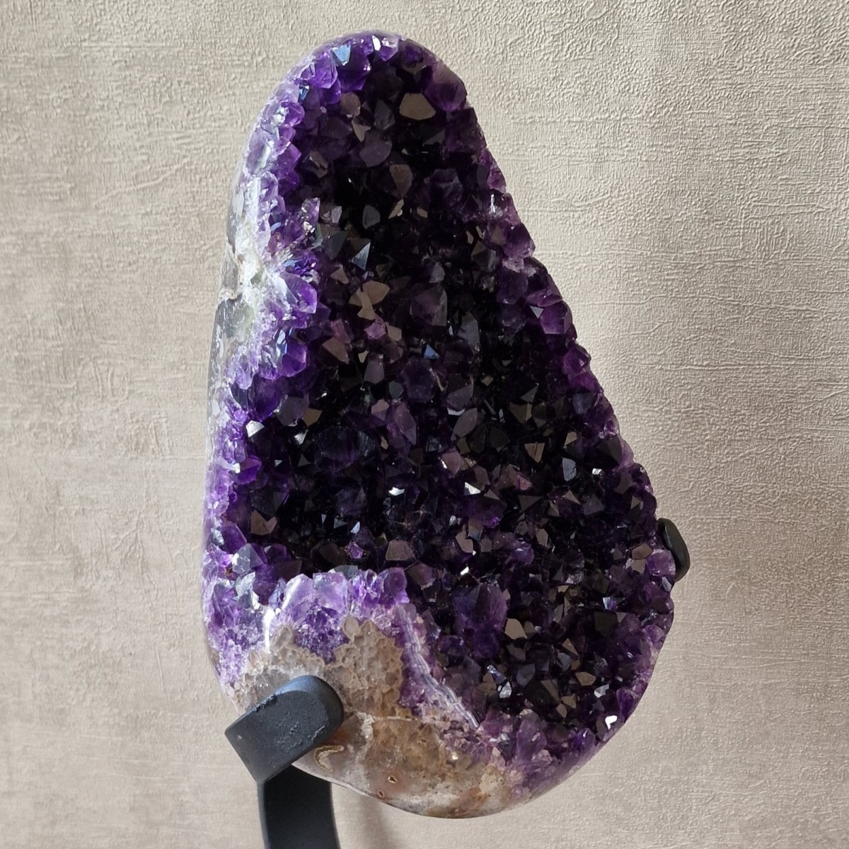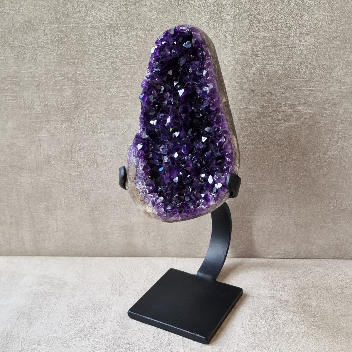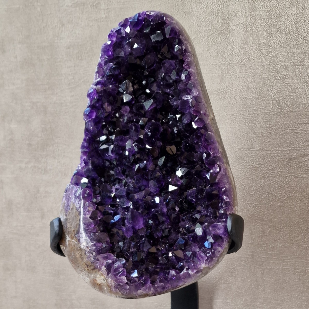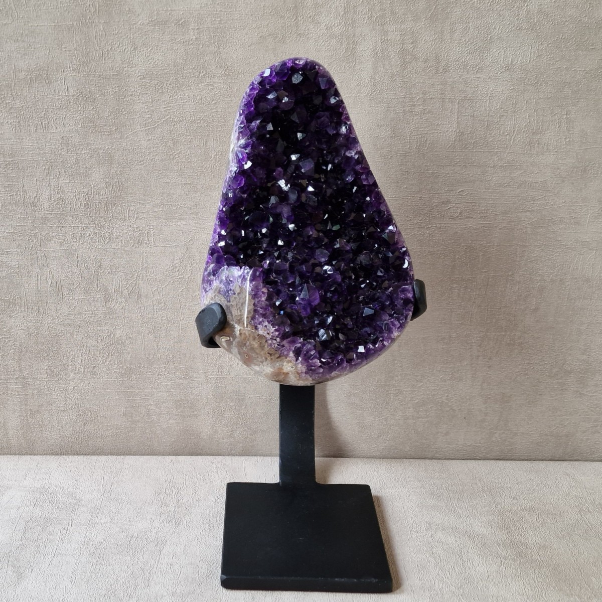 Améthyste d'Uruguay sur pied métallique de +/- 30 cm de haut. L'améthyste peut être dissociée du pied. Lithothérapie : apaisement, vitalité positive, spiritualité.(DR22)