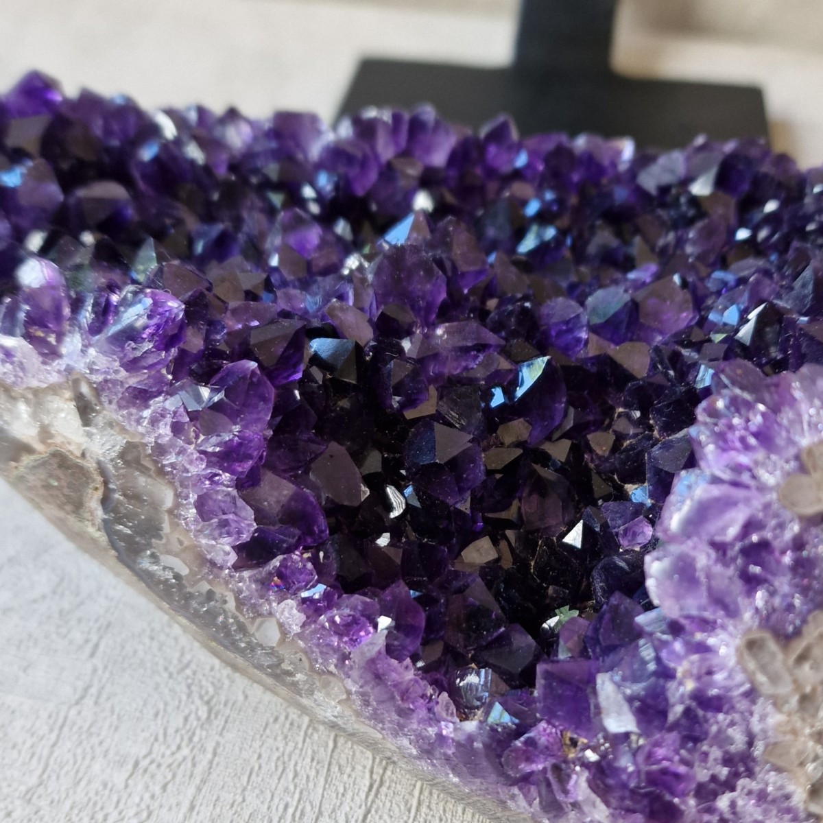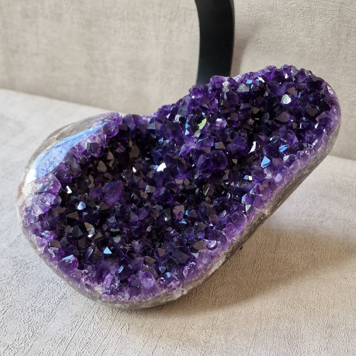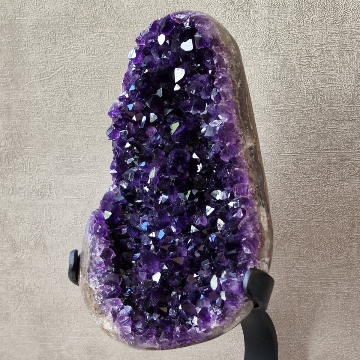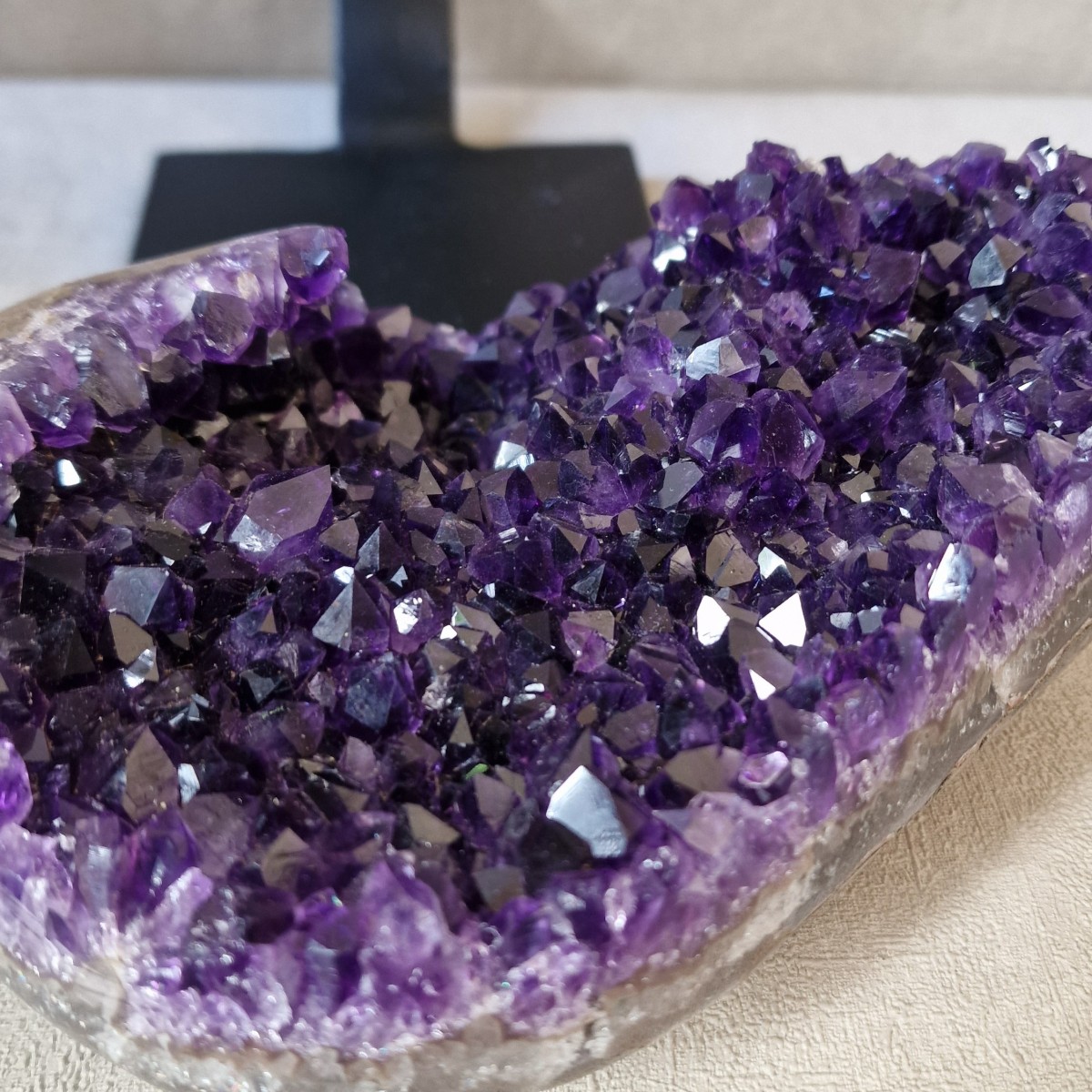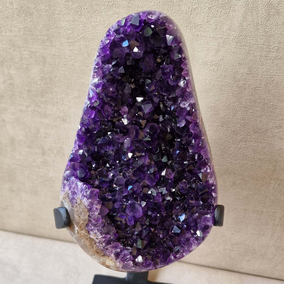 Améthyste d'Uruguay sur pied métallique de +/- 30 cm de haut. L'améthyste peut être dissociée du pied. Lithothérapie : apaisement, vitalité positive, spiritualité.(DR22)