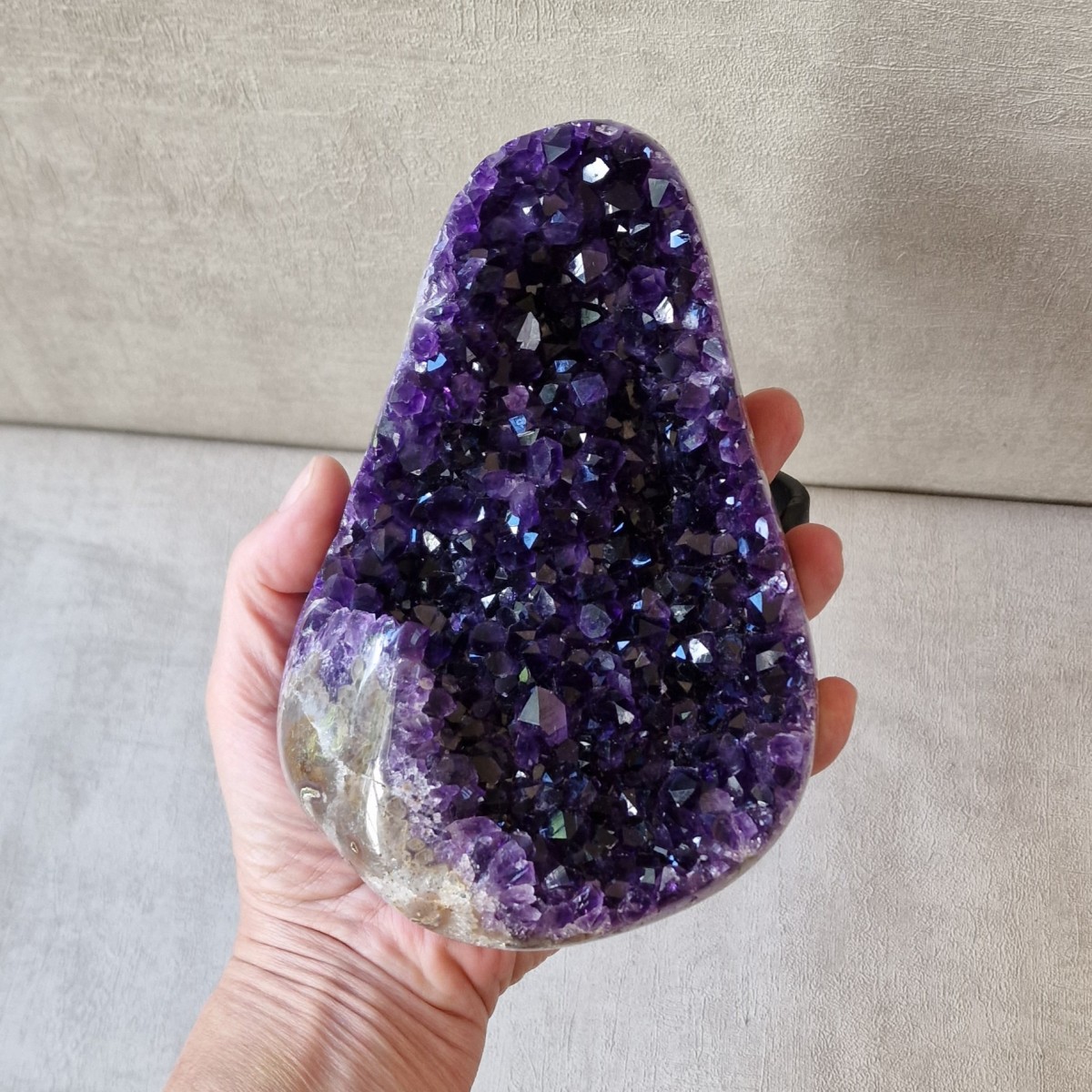 | Taille | +/- 30 cm de haut pied compris. Dimension de l'améthyste sans le pied : +/- 17,5 cm X 11,5 cm |