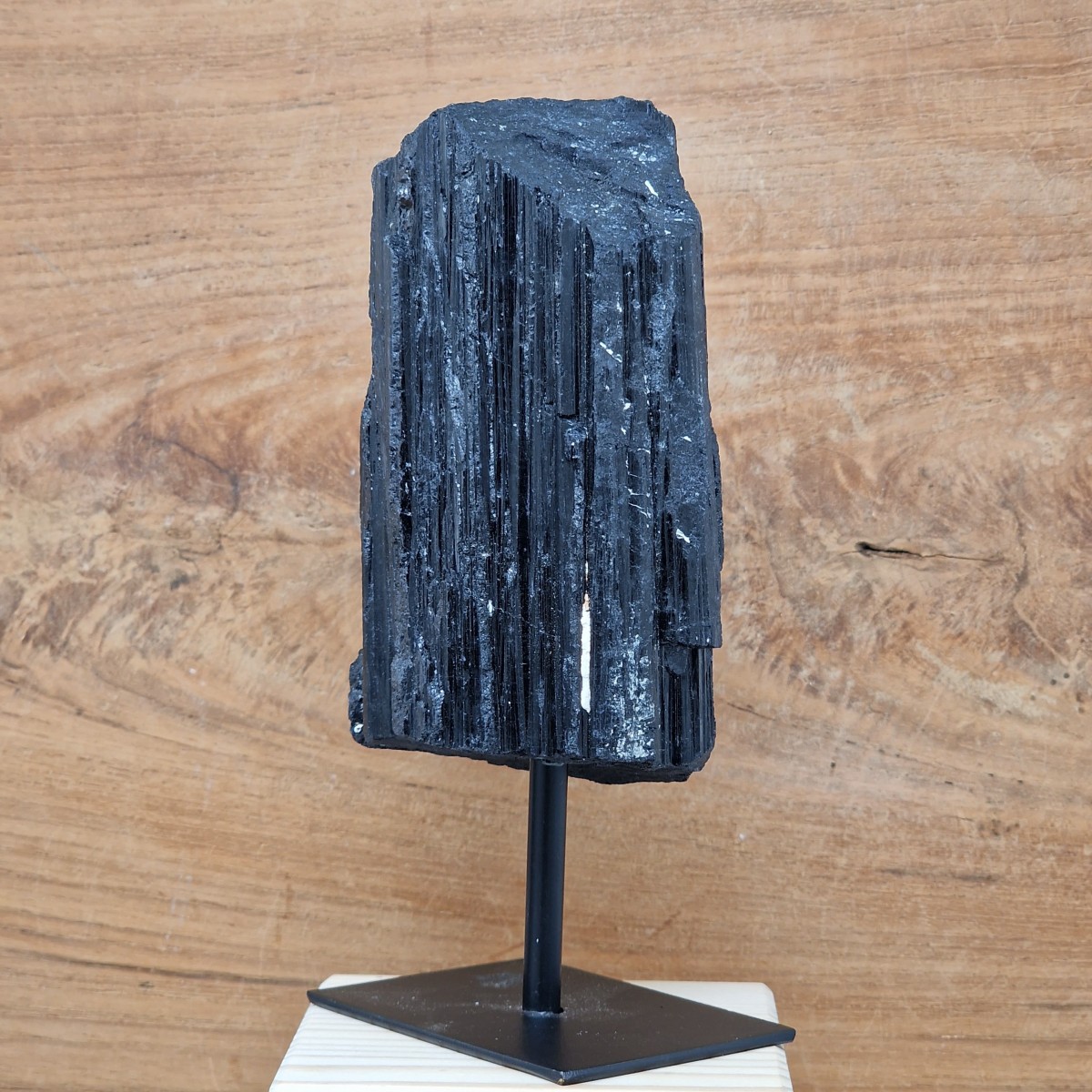 Tourmaline noire brute fixée sur pied. Litho : pierre de protection, elle apporte stabilité et courage, développe la raison et protège des agressions psychiques.(BT161-1)