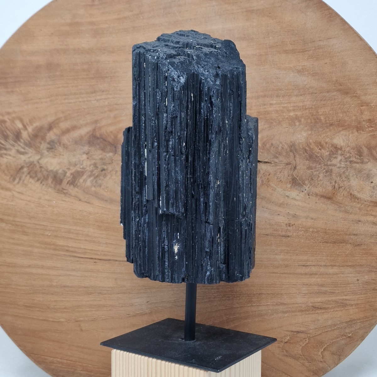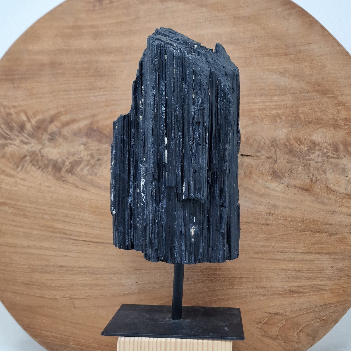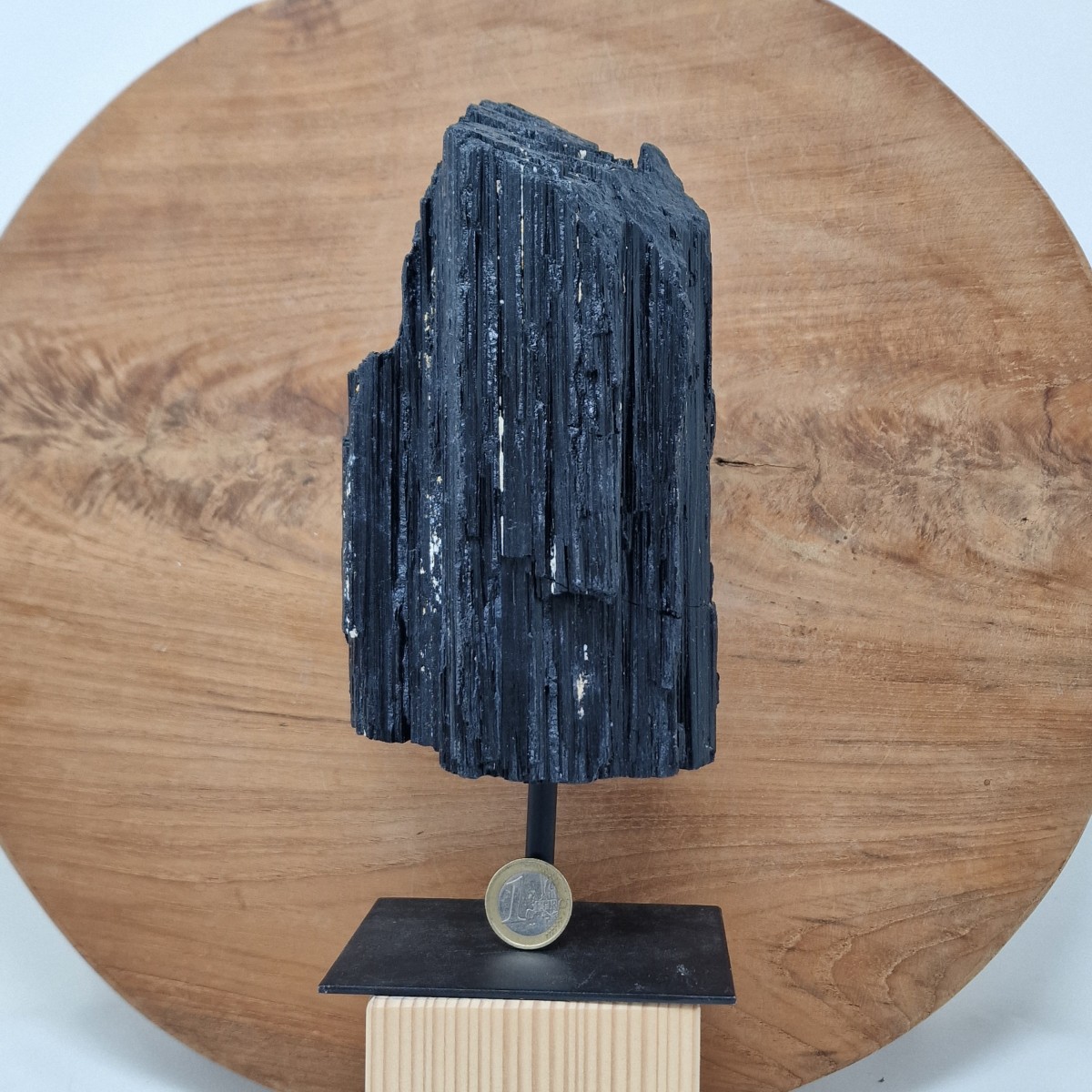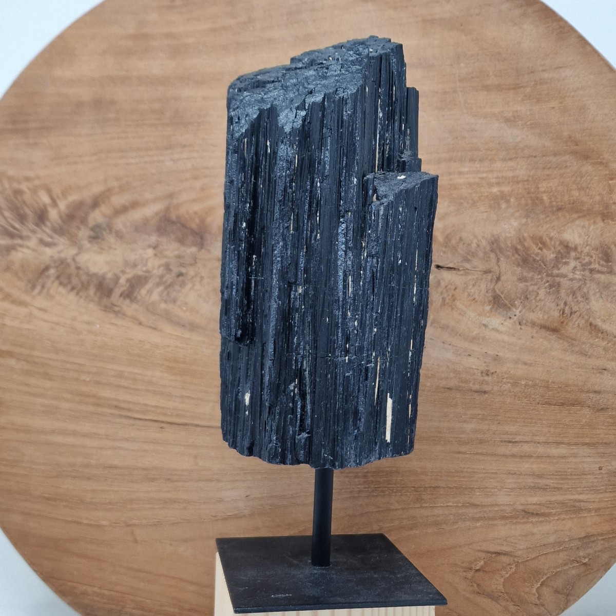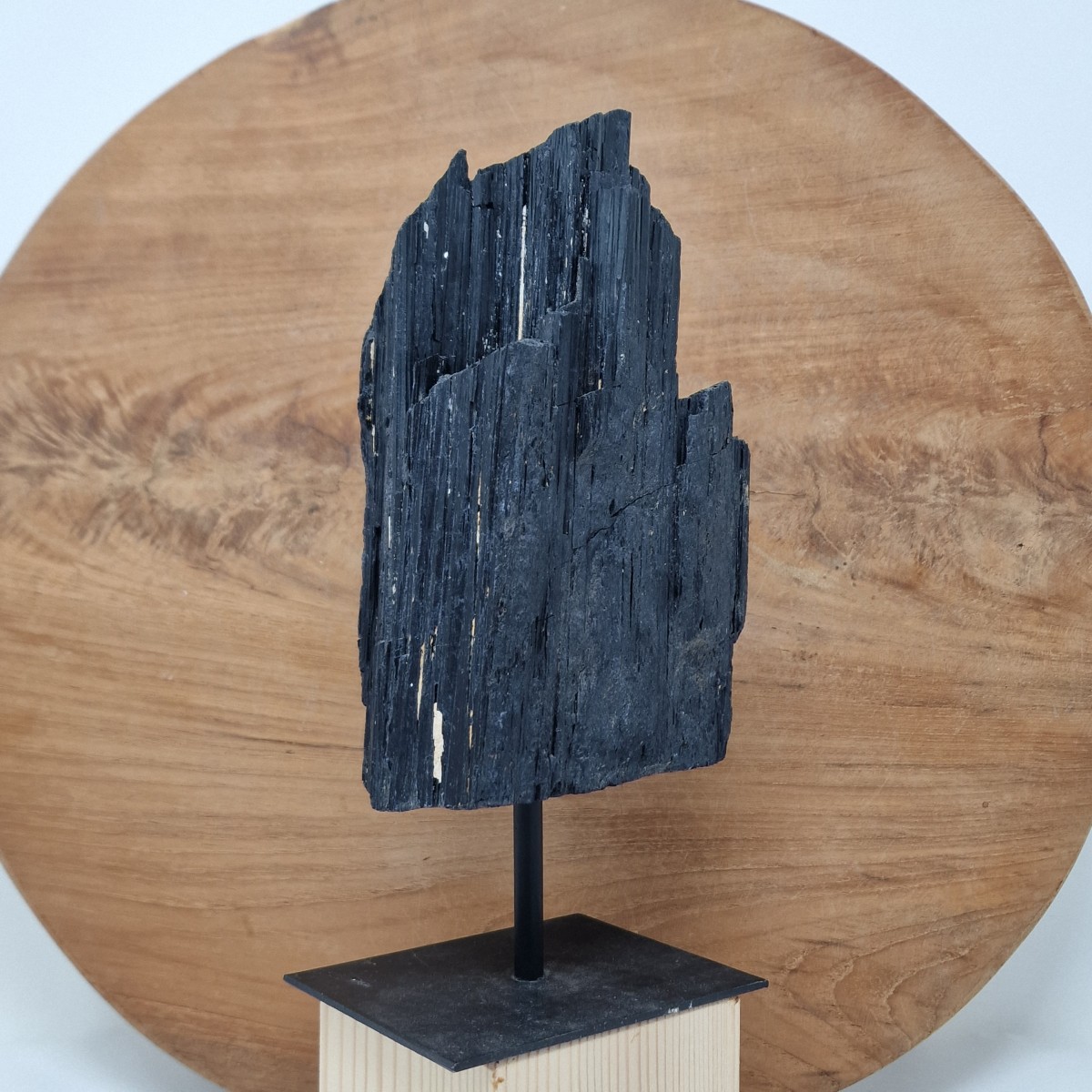 Tourmaline noire brute fixée sur pied. Litho : pierre de protection, elle apporte stabilité et courage, développe la raison et protège des agressions psychiques.(BT161-2)