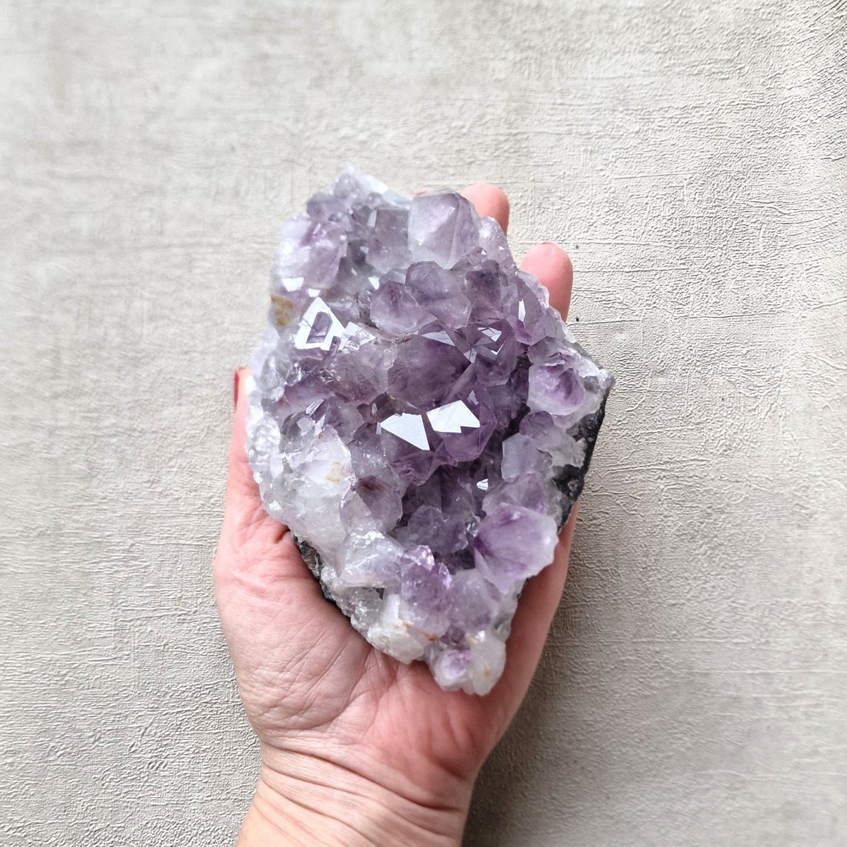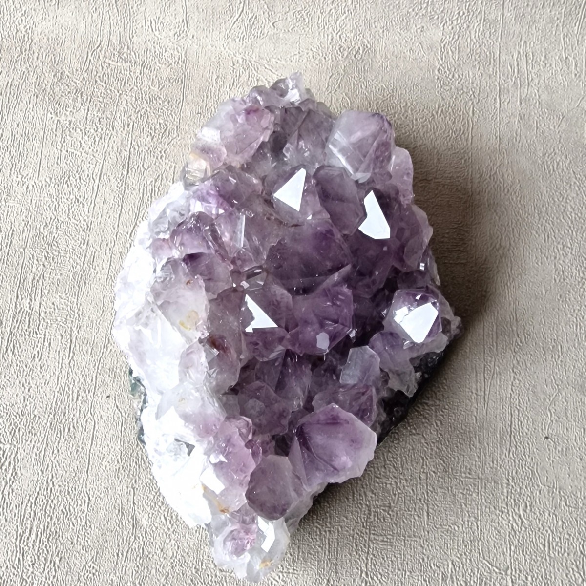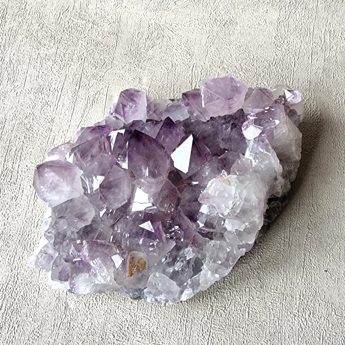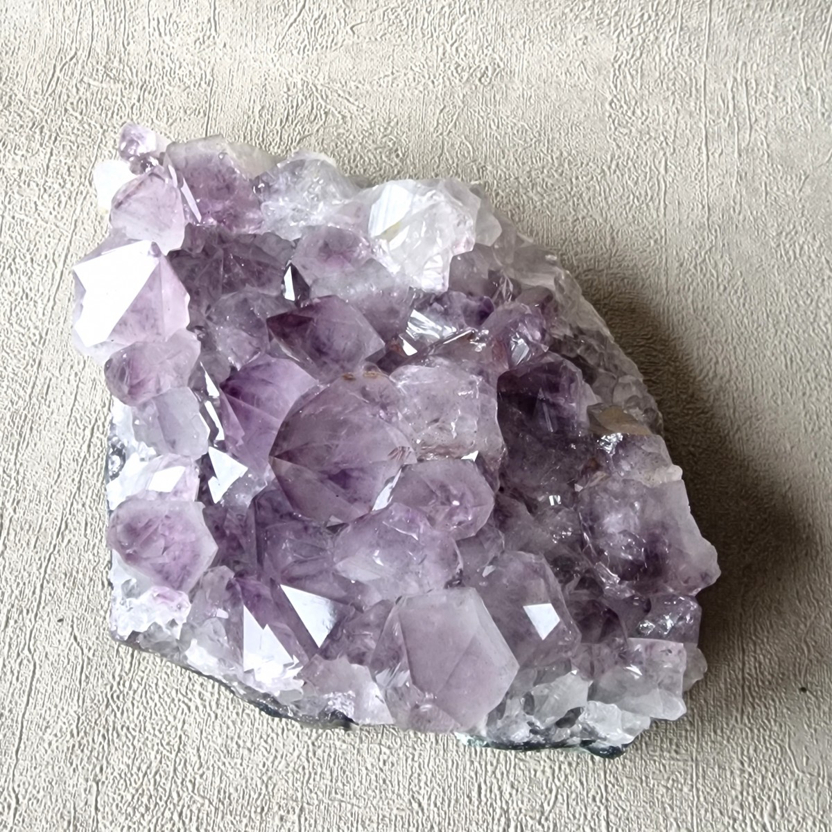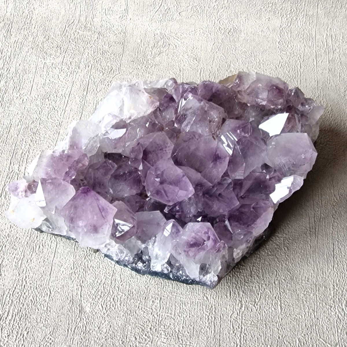Druse d'améthyste brésilienne, gros cristaux clairs. Lithothérapie : l'améthyste symbolise la sérénité, la sagesse et la spiritualité.(22592)