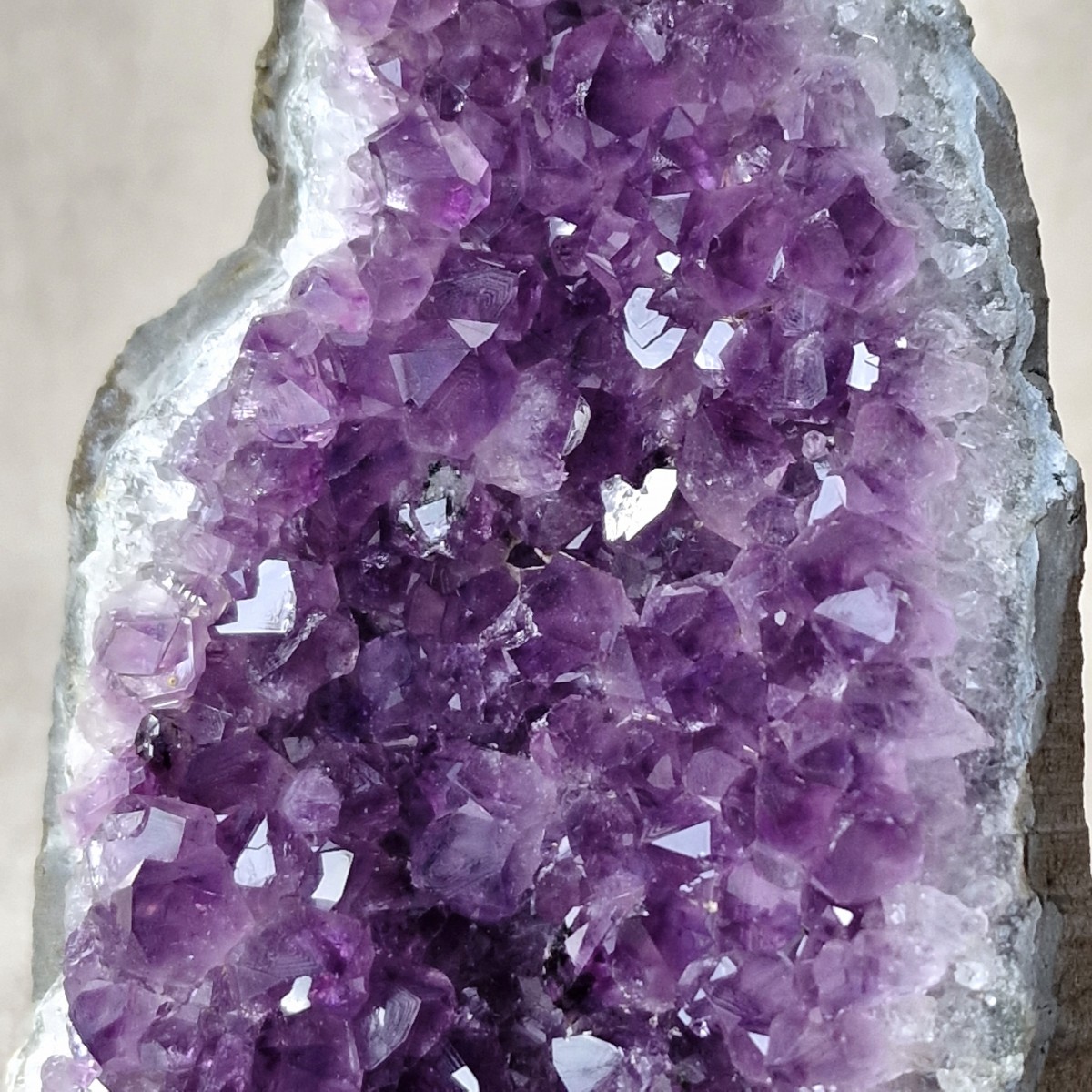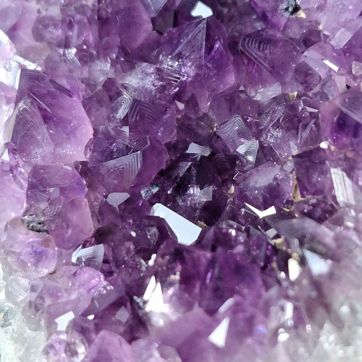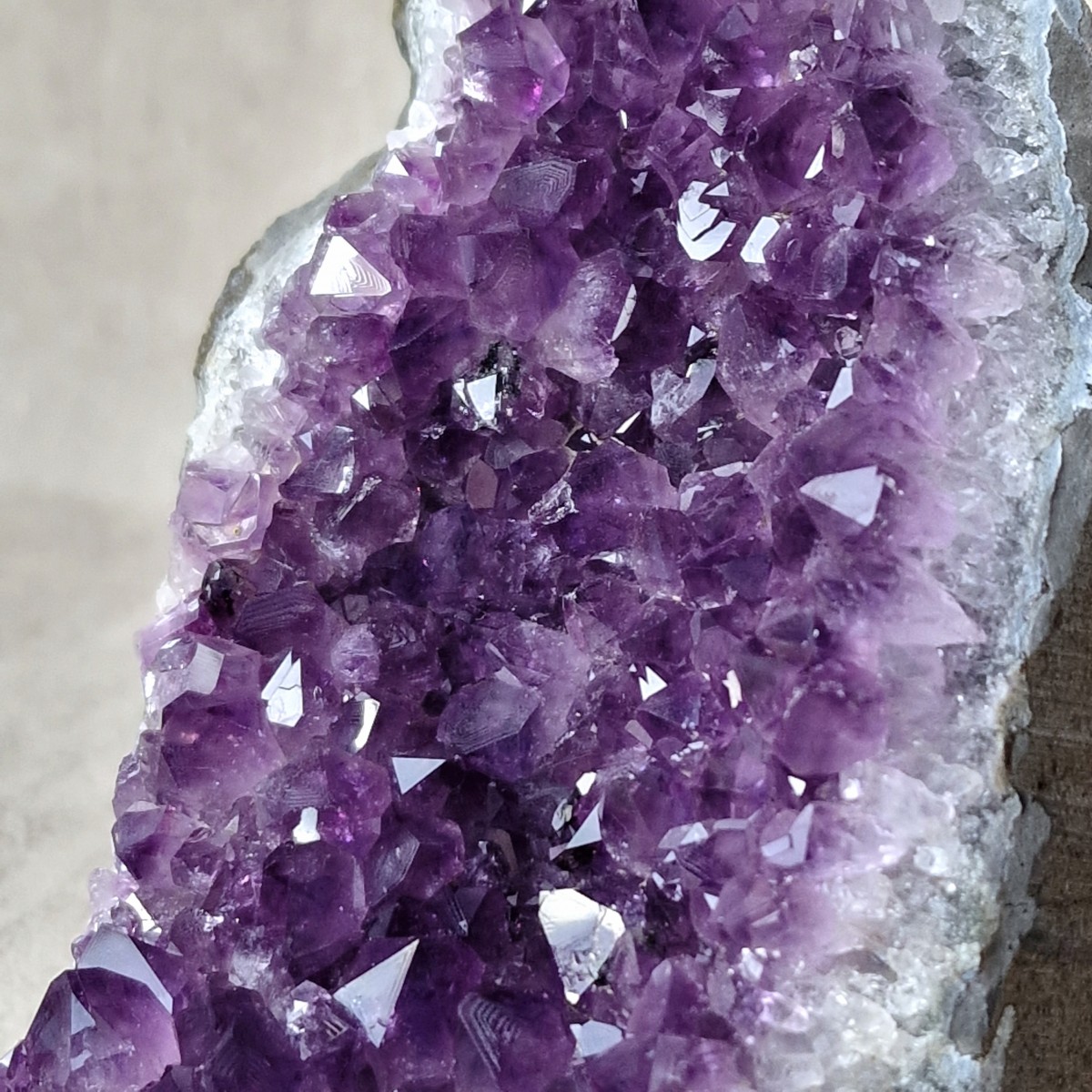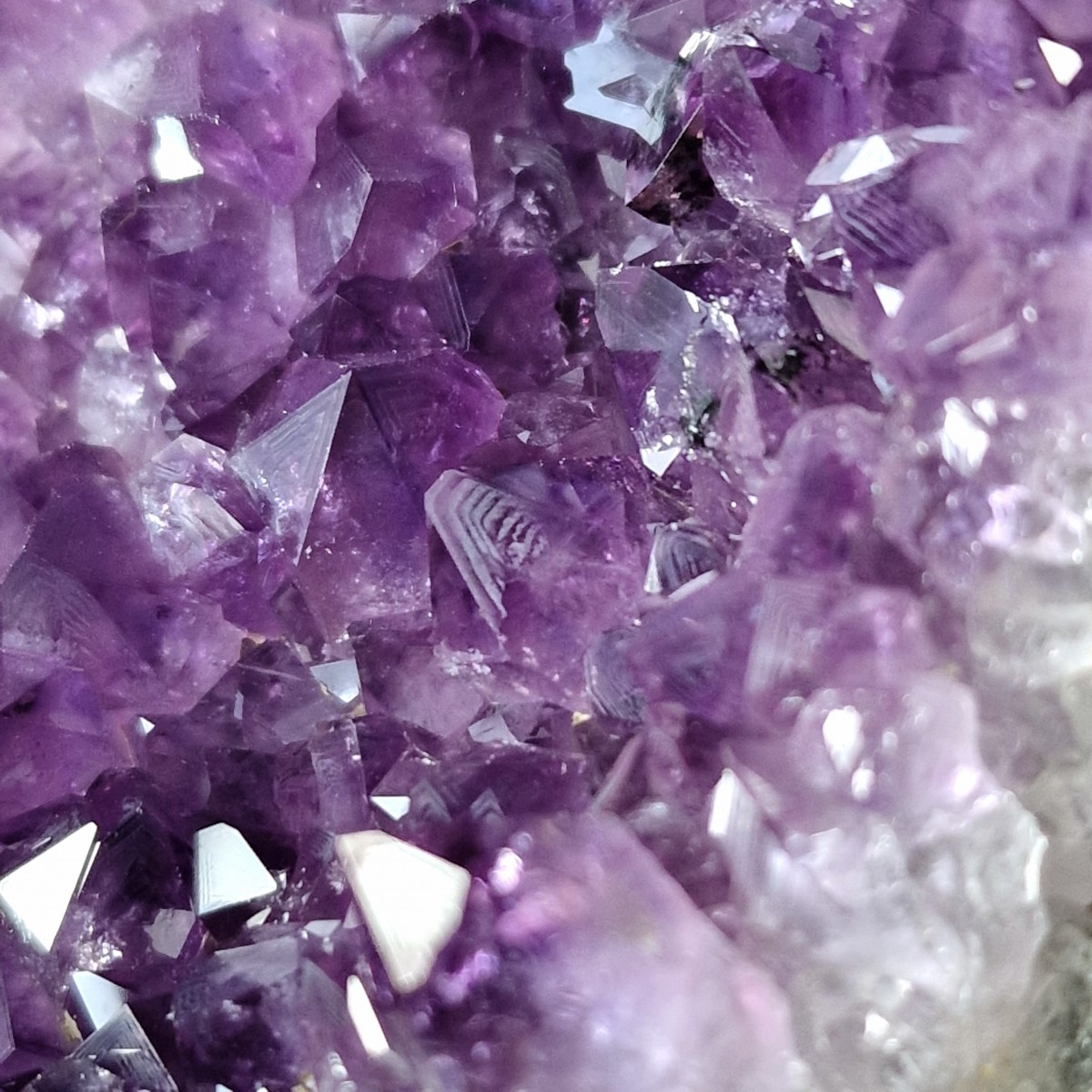 Druse d'améthyste d'Uruguay avec "empreintes" visibles sur certains cristaux. Lithothérapie : l'améthyste symbolise la sérénité, la sagesse et la spiritualité.(GO18-12)