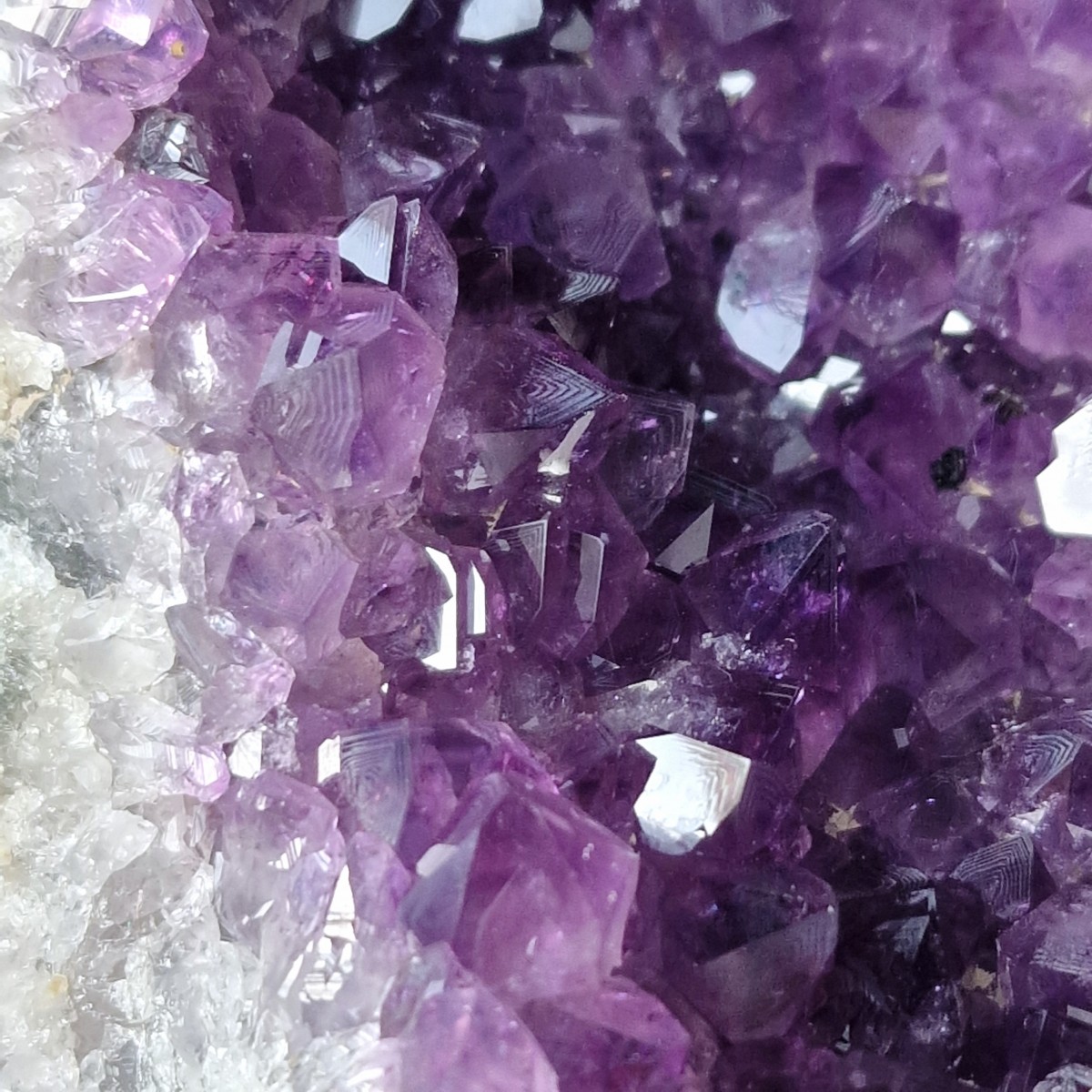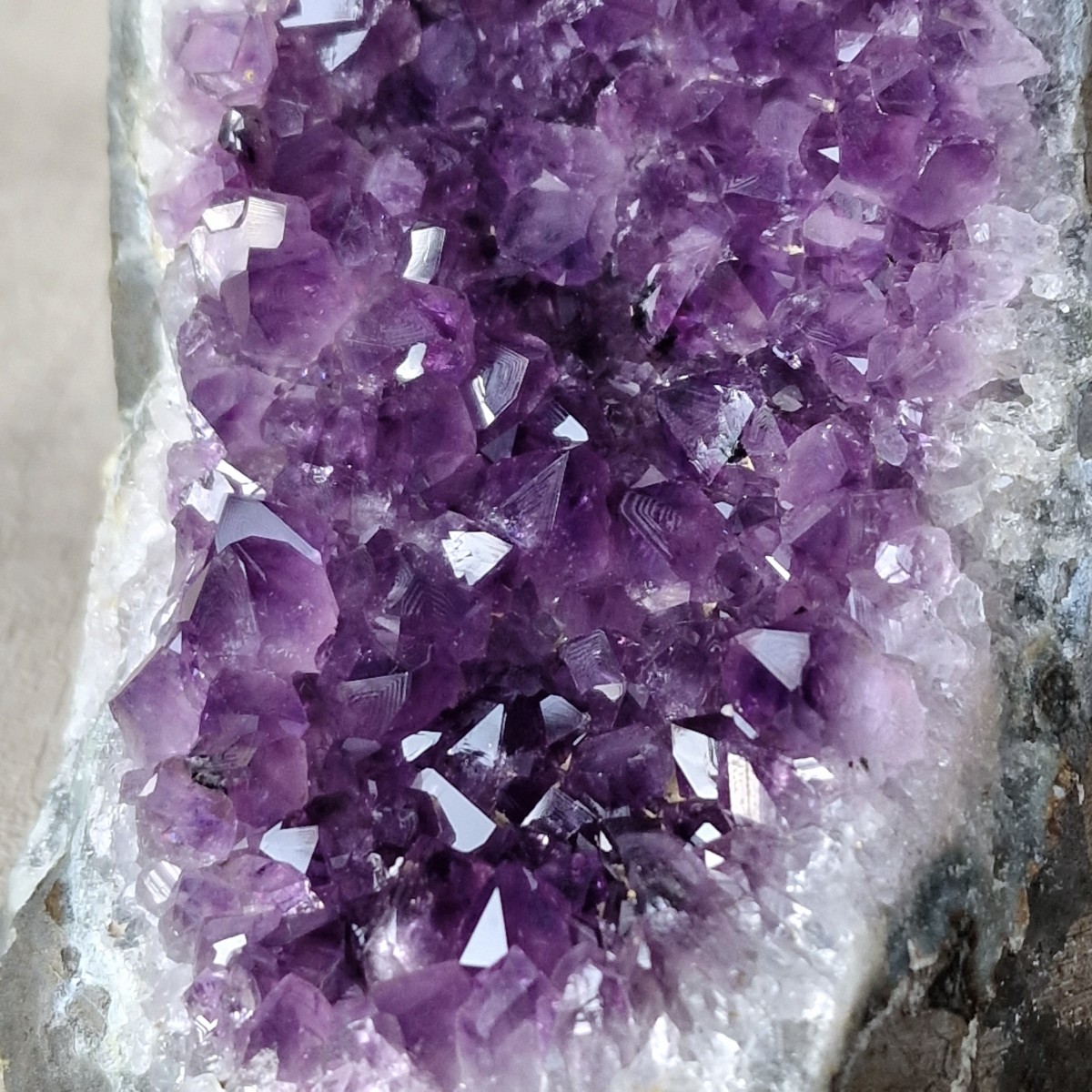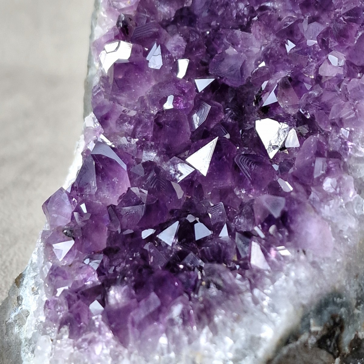Druse d'améthyste d'Uruguay avec "empreintes" visibles sur certains cristaux. Lithothérapie : l'améthyste symbolise la sérénité, la sagesse et la spiritualité.(GO18-12)