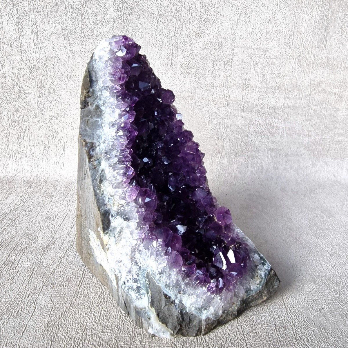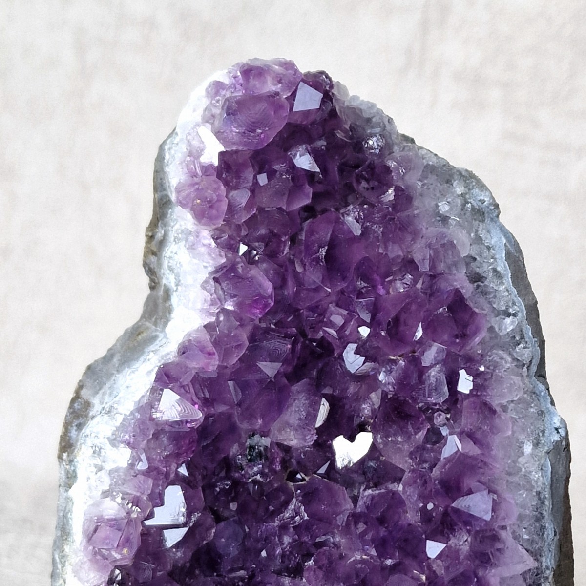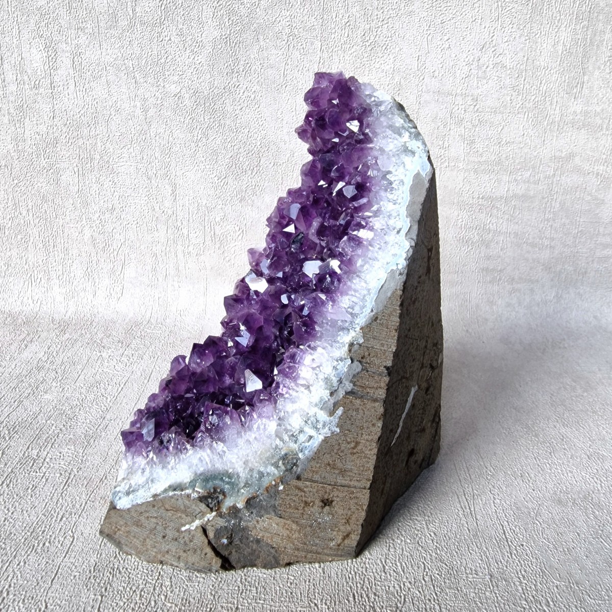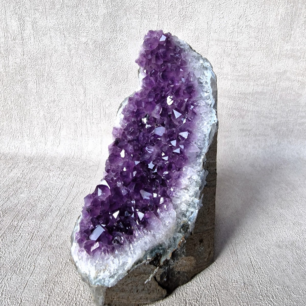 Druse d'améthyste d'Uruguay avec "empreintes" visibles sur certains cristaux. Lithothérapie : l'améthyste symbolise la sérénité, la sagesse et la spiritualité.(GO18-12)