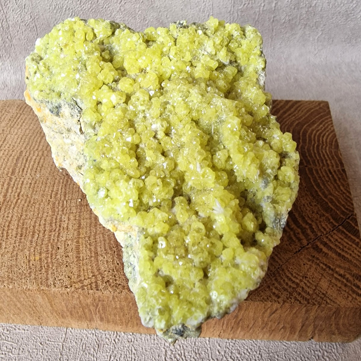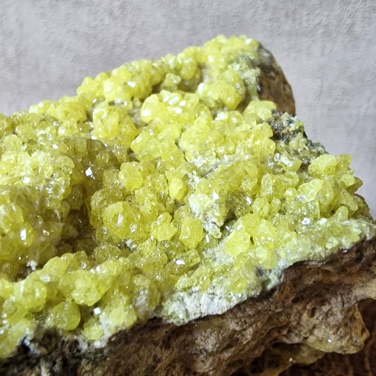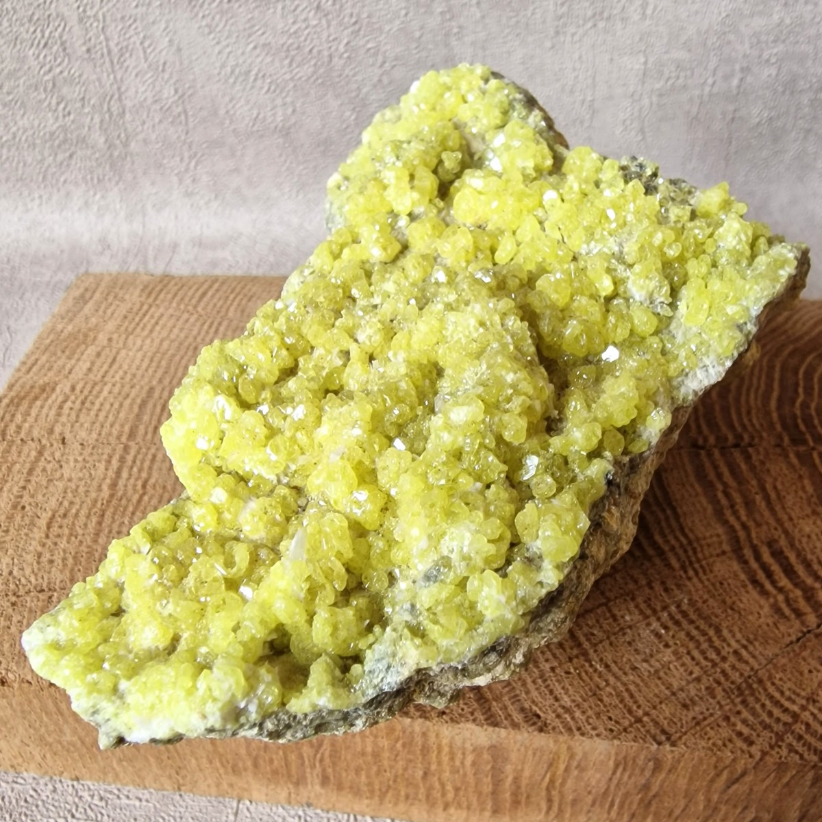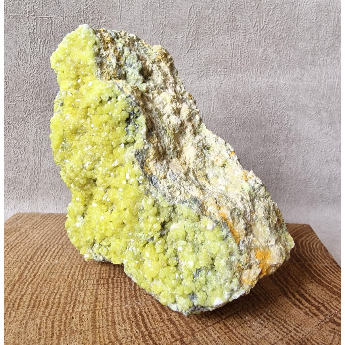 Le Soufre natif se présente le plus souvent sous forme de revêtement poudreux. Mais il peut aussi nous offrir de jolis cristaux bipyramidaux d’un jaune citron éclatant, nés de l’activité volcanique et plus précisément de la sublimation des gaz brûlants qui s’échappent des entrailles de la Terre. (Les cristaux tabulaires existent mais sont beaucoup plus rares.) Dans son habit jaune citron éclatant et résineux, le Soufre n’en est pas moins fragile et sensible à la chaleur.