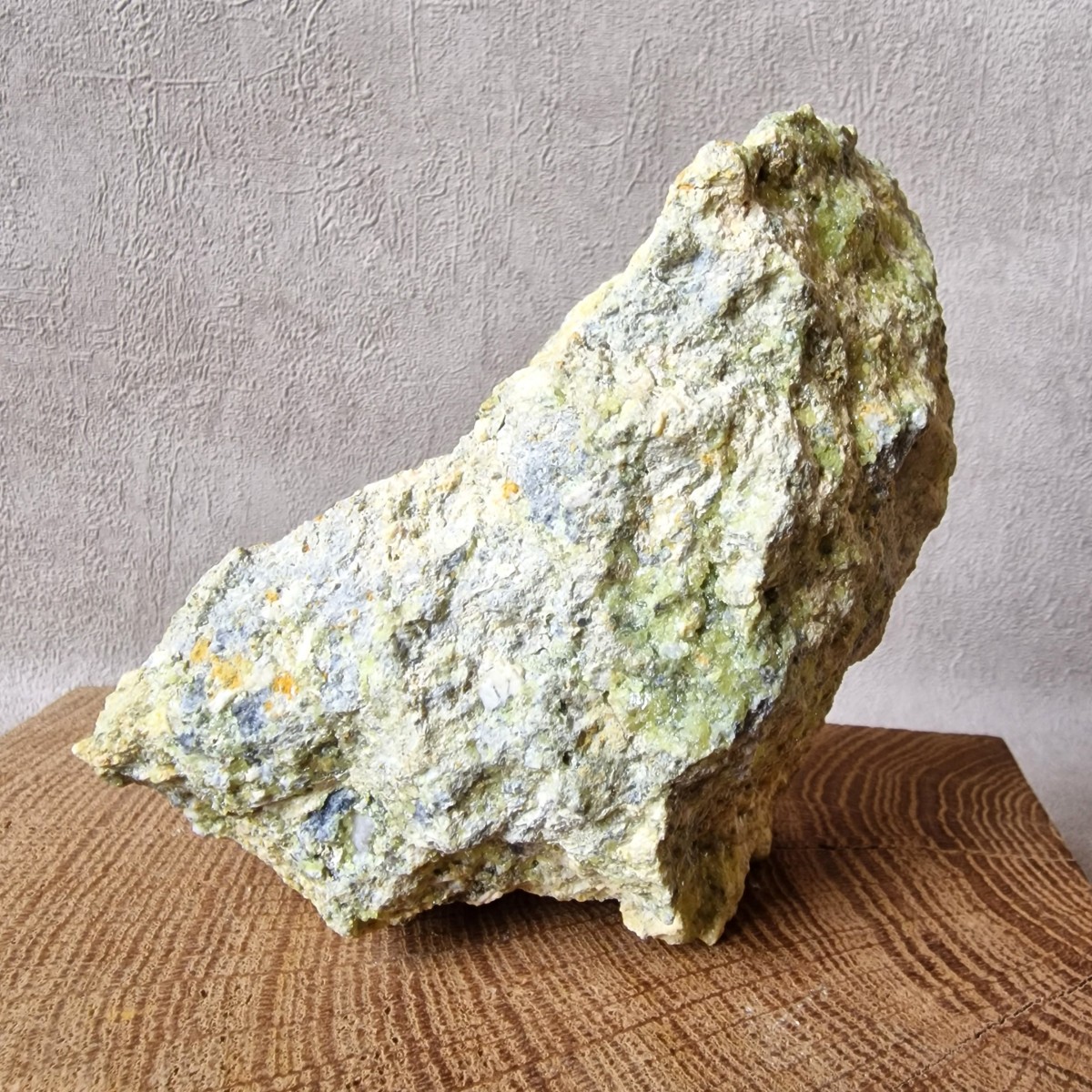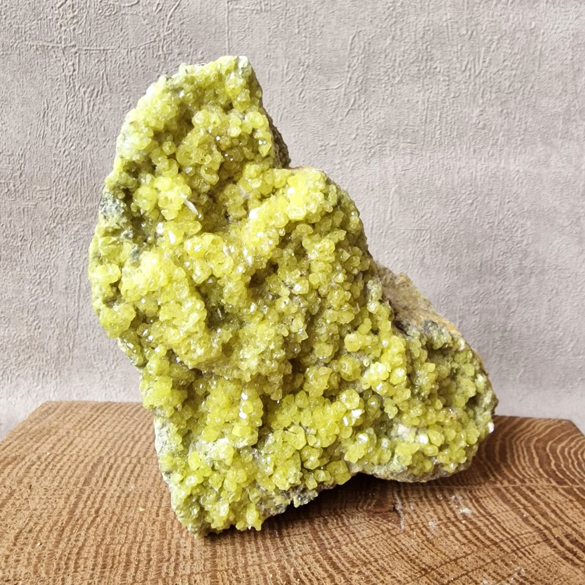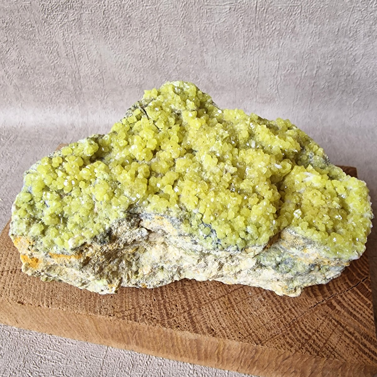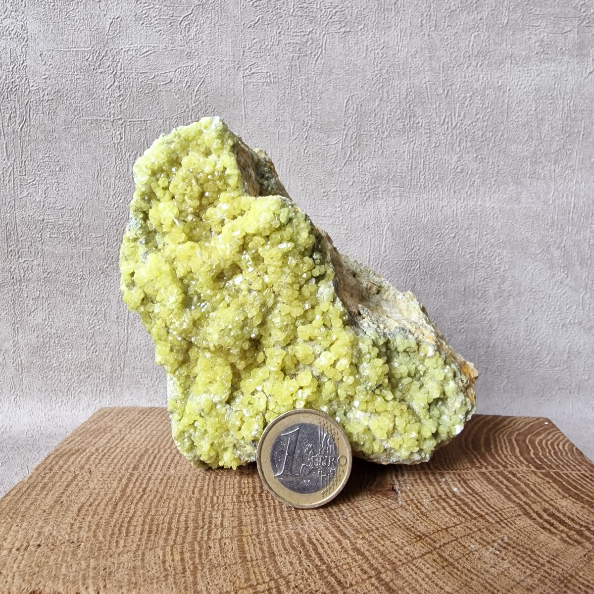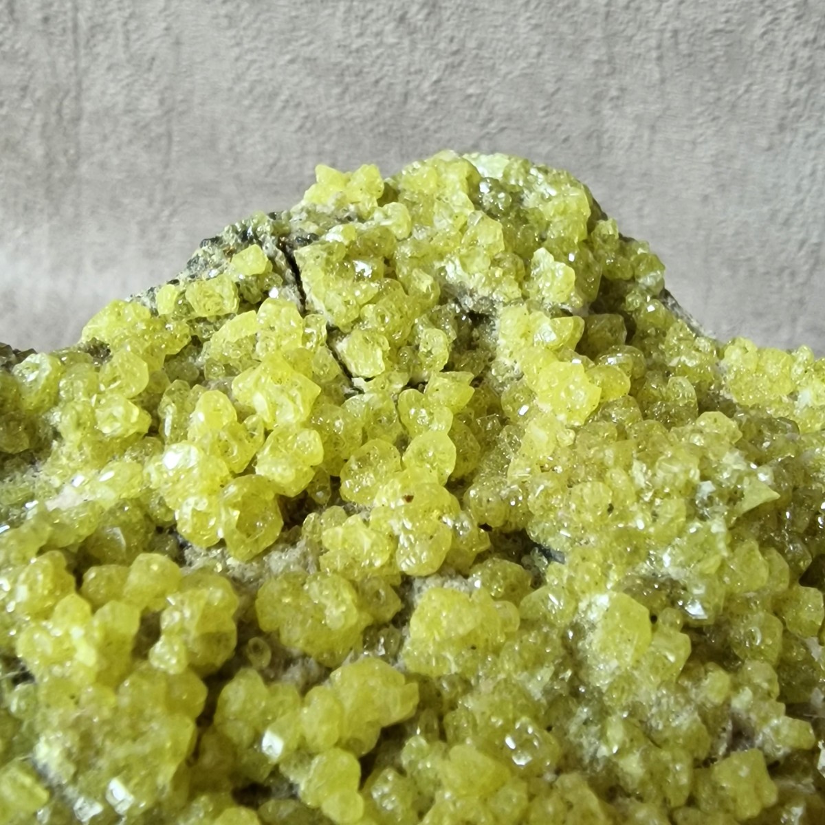 Le Soufre natif se présente le plus souvent sous forme de revêtement poudreux. Mais il peut aussi nous offrir de jolis cristaux bipyramidaux d’un jaune citron éclatant, nés de l’activité volcanique et plus précisément de la sublimation des gaz brûlants qui s’échappent des entrailles de la Terre. (Les cristaux tabulaires existent mais sont beaucoup plus rares.) Dans son habit jaune citron éclatant et résineux, le Soufre n’en est pas moins fragile et sensible à la chaleur.