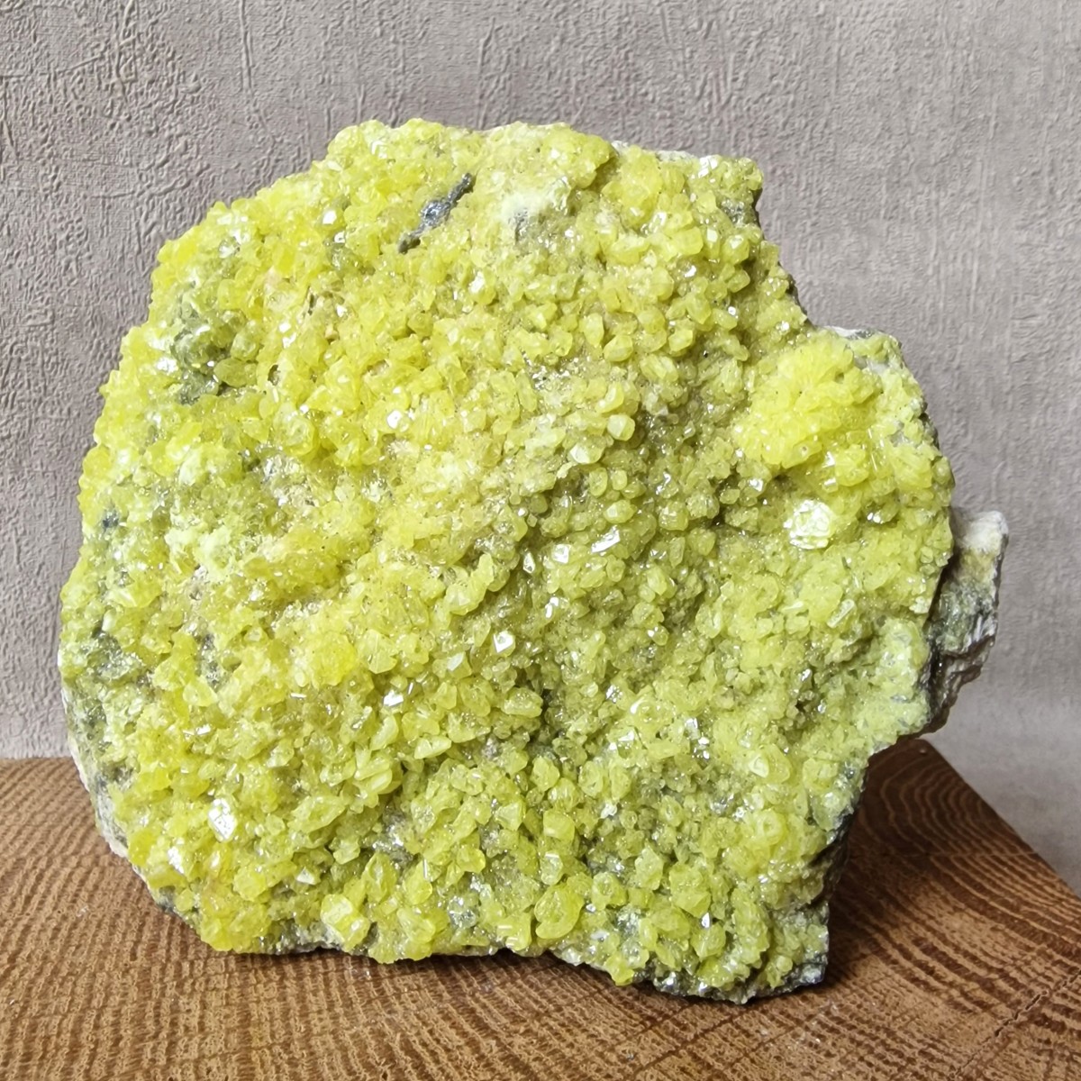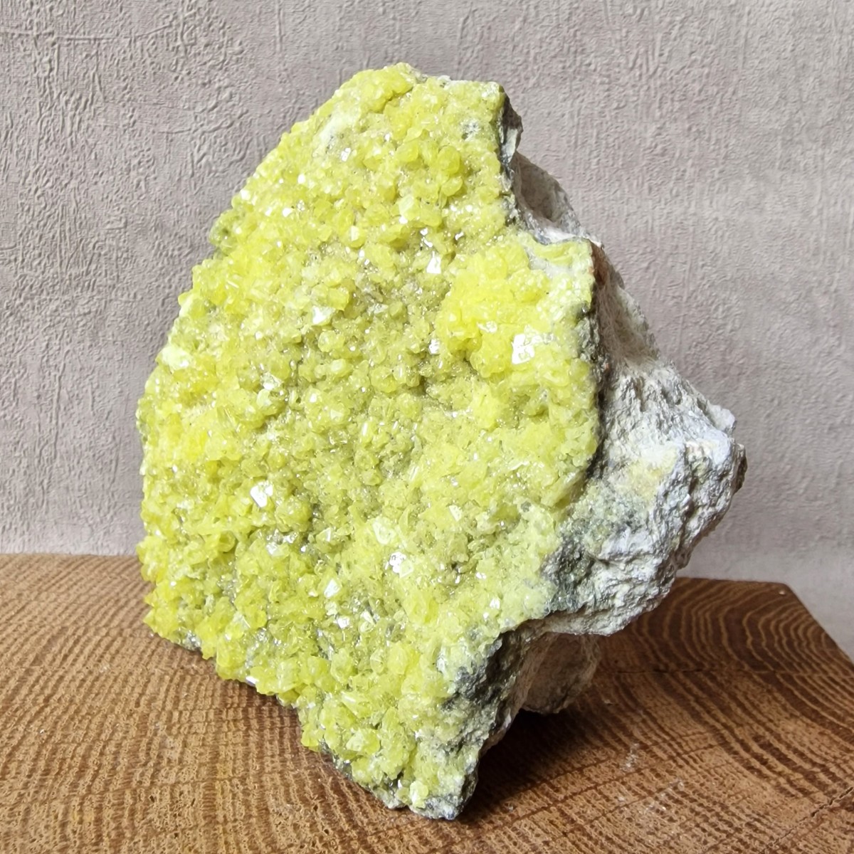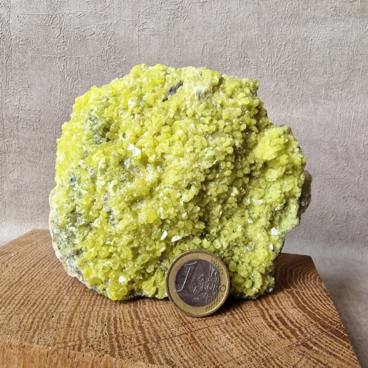 Le Soufre natif se présente le plus souvent sous forme de revêtement poudreux. Mais il peut aussi nous offrir de jolis cristaux bipyramidaux d’un jaune citron éclatant, nés de l’activité volcanique et plus précisément de la sublimation des gaz brûlants qui s’échappent des entrailles de la Terre. (Les cristaux tabulaires existent mais sont beaucoup plus rares.) Dans son habit jaune citron éclatant et résineux, le Soufre n’en est pas moins fragile et sensible à la chaleur.