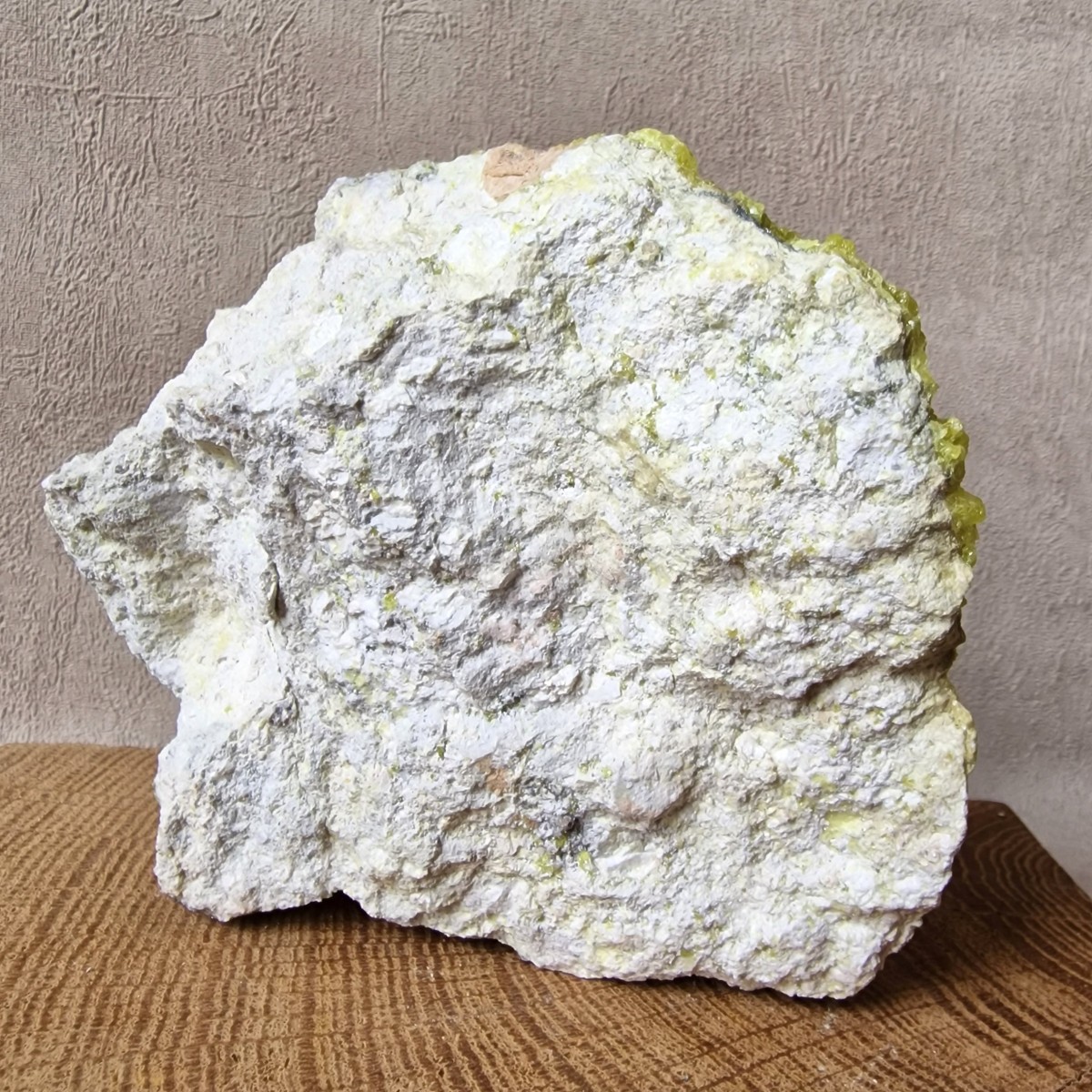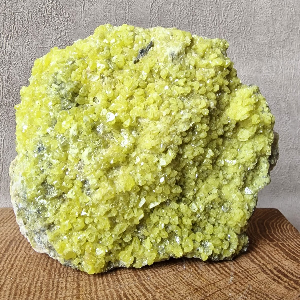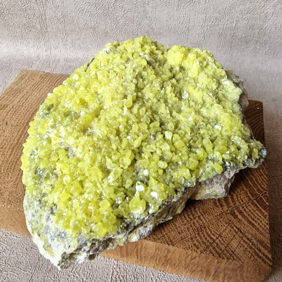 Le Soufre natif se présente le plus souvent sous forme de revêtement poudreux. Mais il peut aussi nous offrir de jolis cristaux bipyramidaux d’un jaune citron éclatant, nés de l’activité volcanique et plus précisément de la sublimation des gaz brûlants qui s’échappent des entrailles de la Terre. (Les cristaux tabulaires existent mais sont beaucoup plus rares.) Dans son habit jaune citron éclatant et résineux, le Soufre n’en est pas moins fragile et sensible à la chaleur.