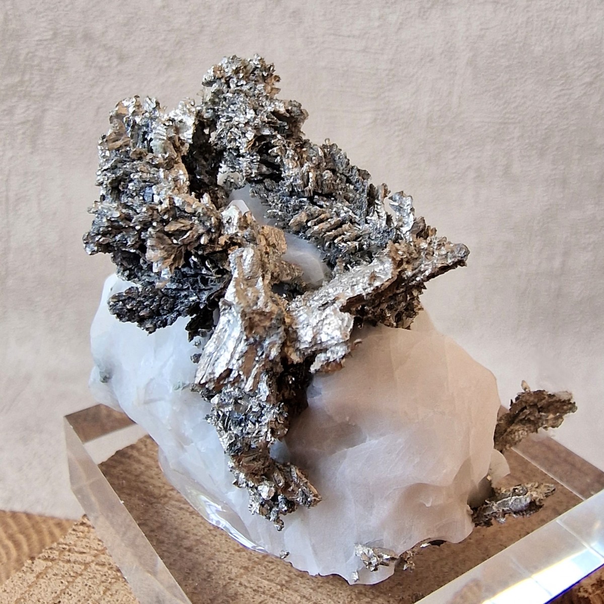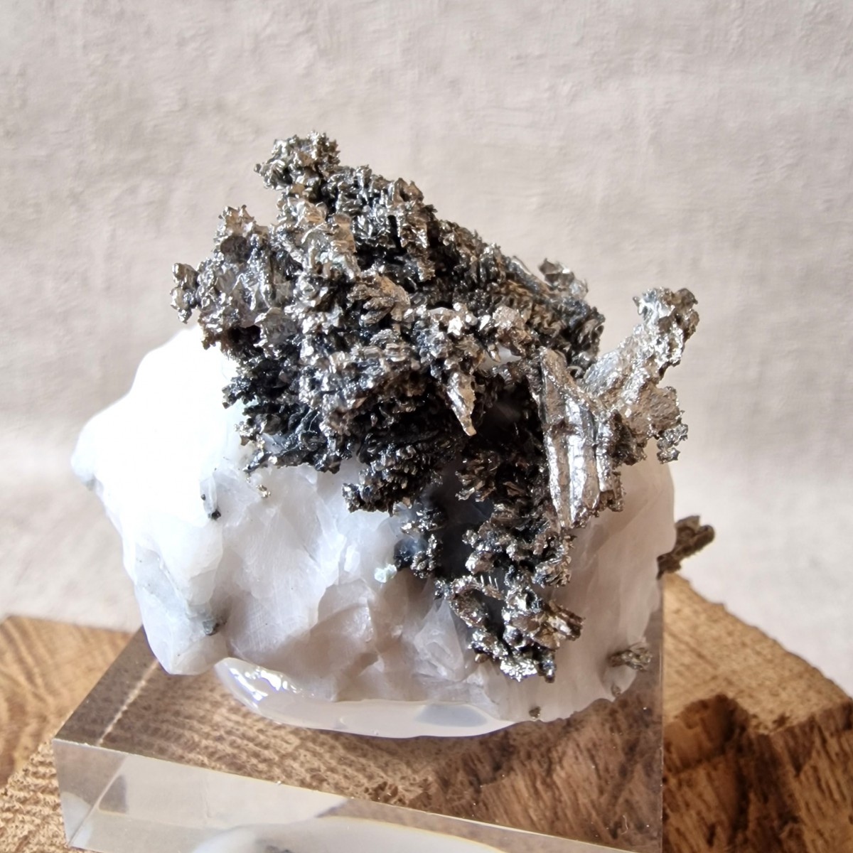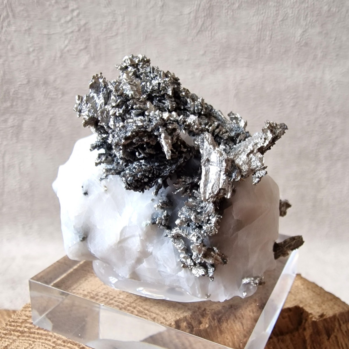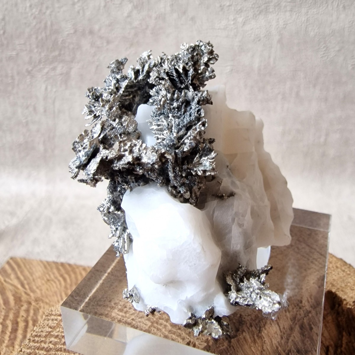 Les spécimens d'argent natif sont généralement présentés dégagés par dissolution délicate de la calcite à l’acide pour révéler les arborescences argentifères cachées à l'intérieur.