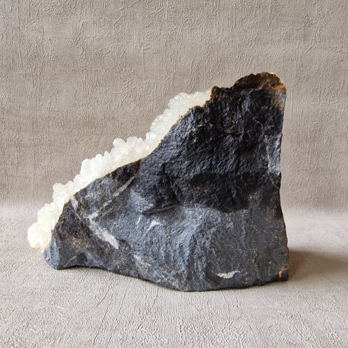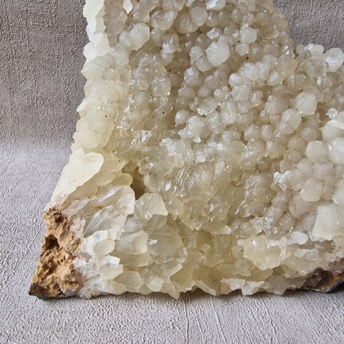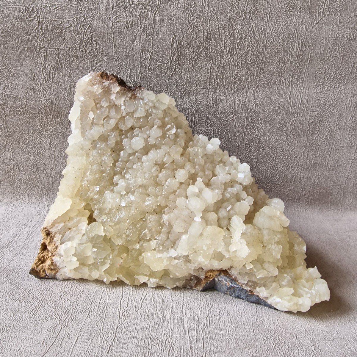 Calcite fluorescente et phosphorescente de Chanxhe (Sprimont), Prov. de Liège, Belgique. Agrégat dense de cristaux jaune pâle sur pierre bleue emblèmatique de la région.(BT175-2)