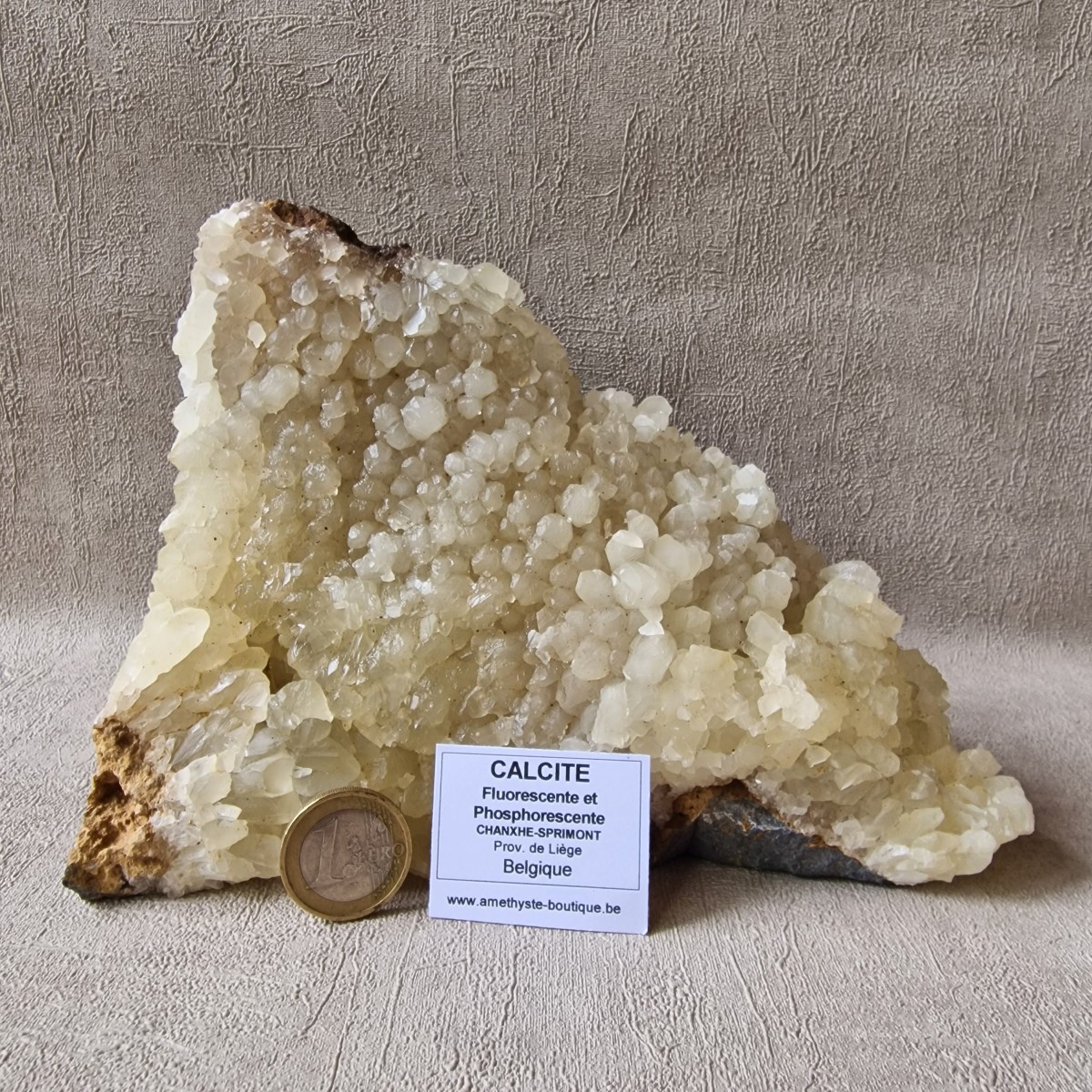 Si la fluorescence est un phénomène courant pour les calcites, celui de phosphorescence est bien plus rare. La calcite de Chanxhe a la particularité d’être à la fois fluorescente et phosphorescente.