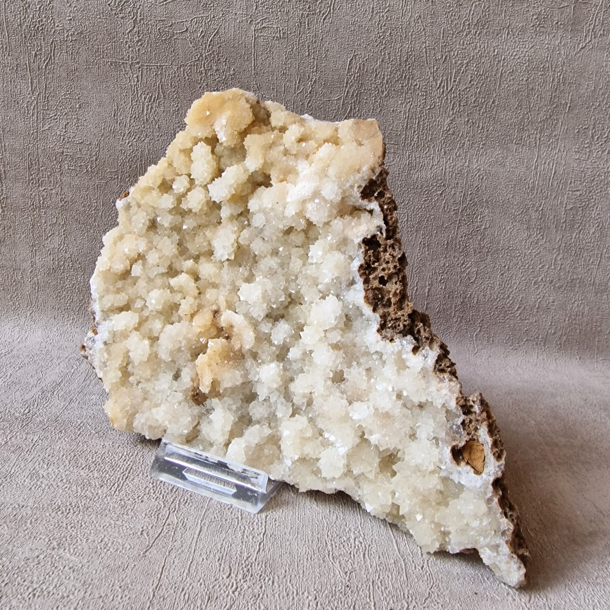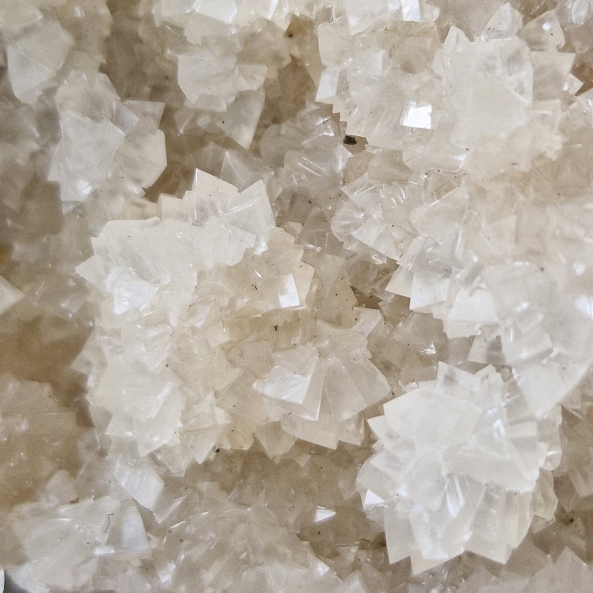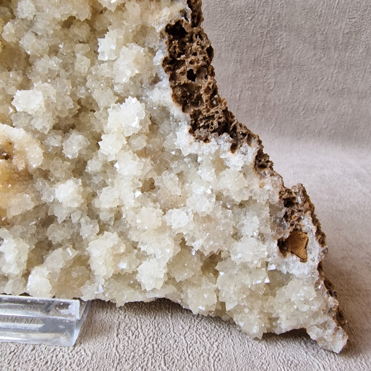 Calcite fluorescente et phosphorescente de Chanxhe (Sprimont), Prov. Liège, Belgique. Cristaux imbriqués en rosaces presque incolores sur fine structure alvéolaire.(BT174-3)