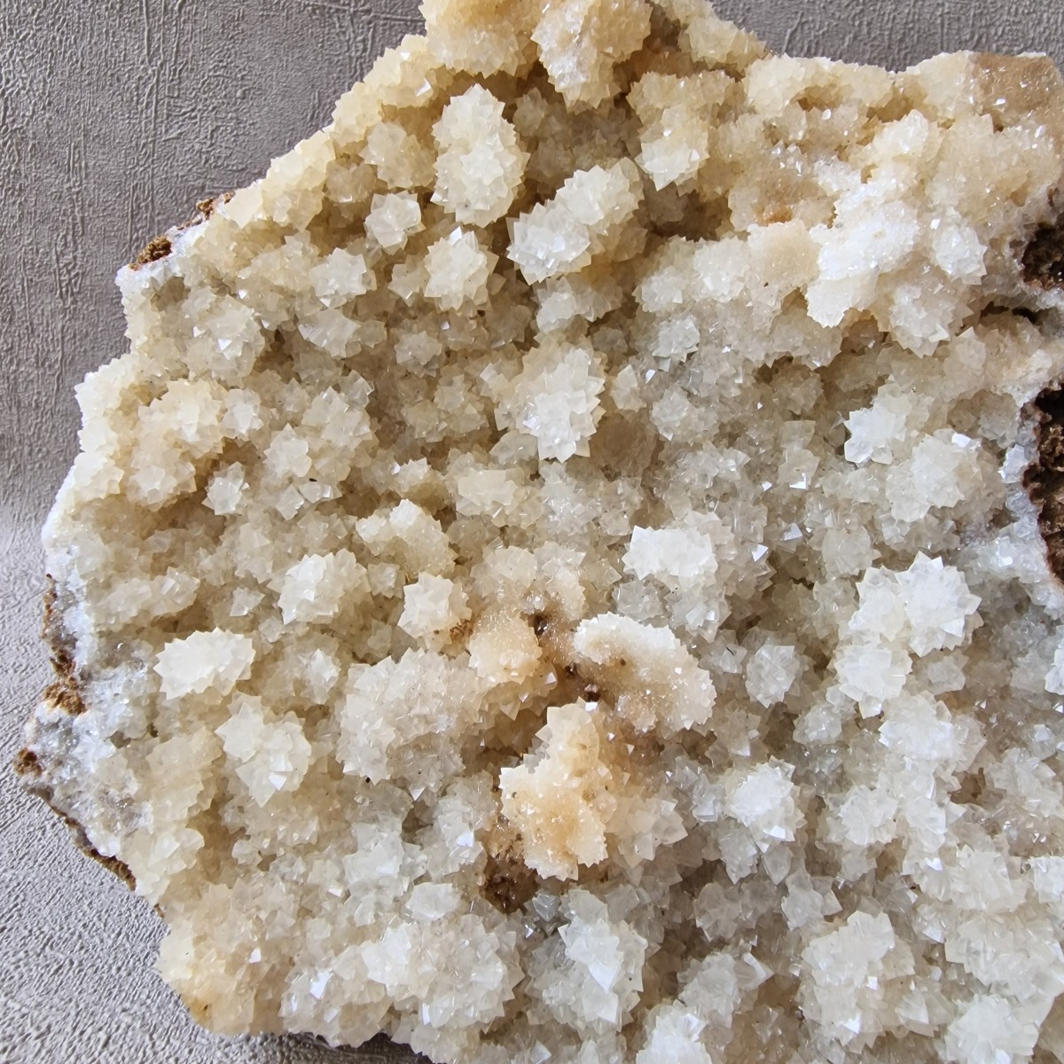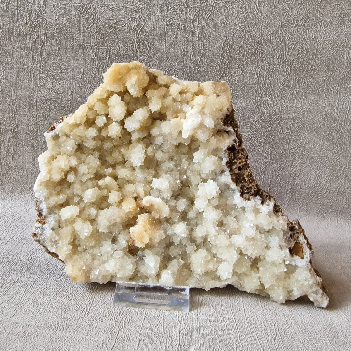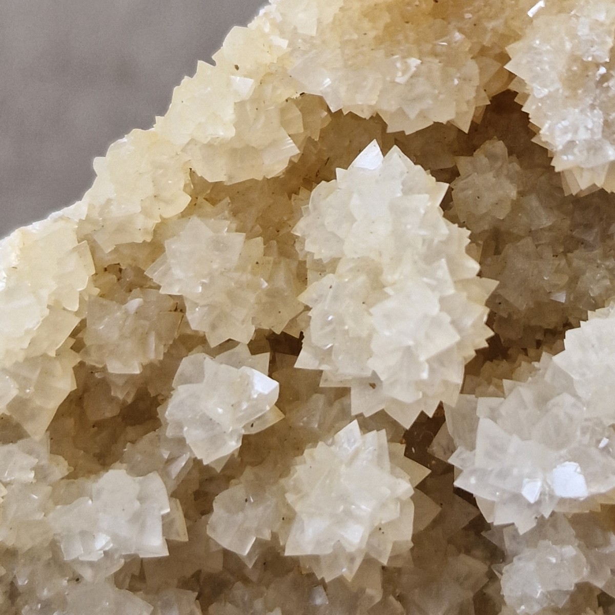 Calcite fluorescente et phosphorescente de Chanxhe (Sprimont), Prov. Liège, Belgique. Cristaux imbriqués en rosaces presque incolores sur fine structure alvéolaire.(BT174-3)