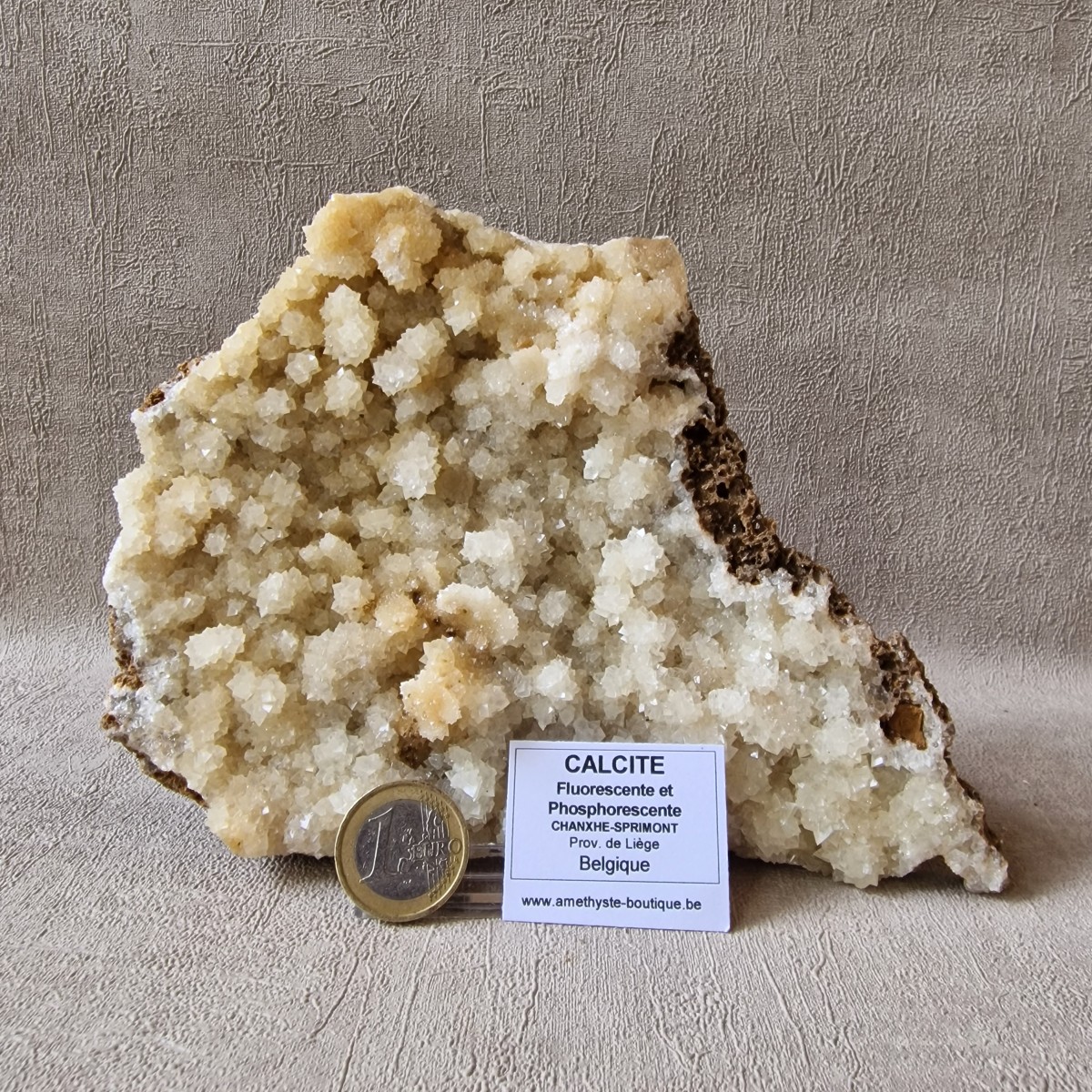 Si la fluorescence est un phénomène courant pour les calcites, celui de phosphorescence est bien plus rare. La calcite de Chanxhe a la particularité d’être à la fois fluorescente et phosphorescente.