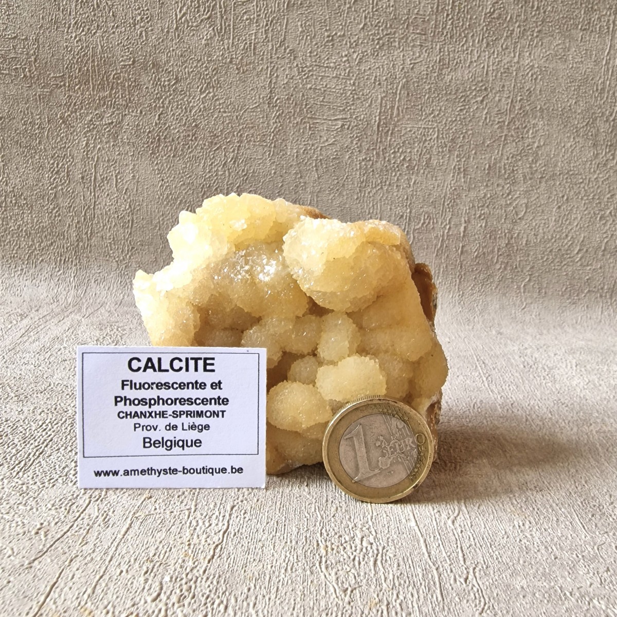 Si la fluorescence est un phénomène courant pour les calcites, celui de phosphorescence est bien plus rare. La calcite de Chanxhe a la particularité d’être à la fois fluorescente et phosphorescente.
