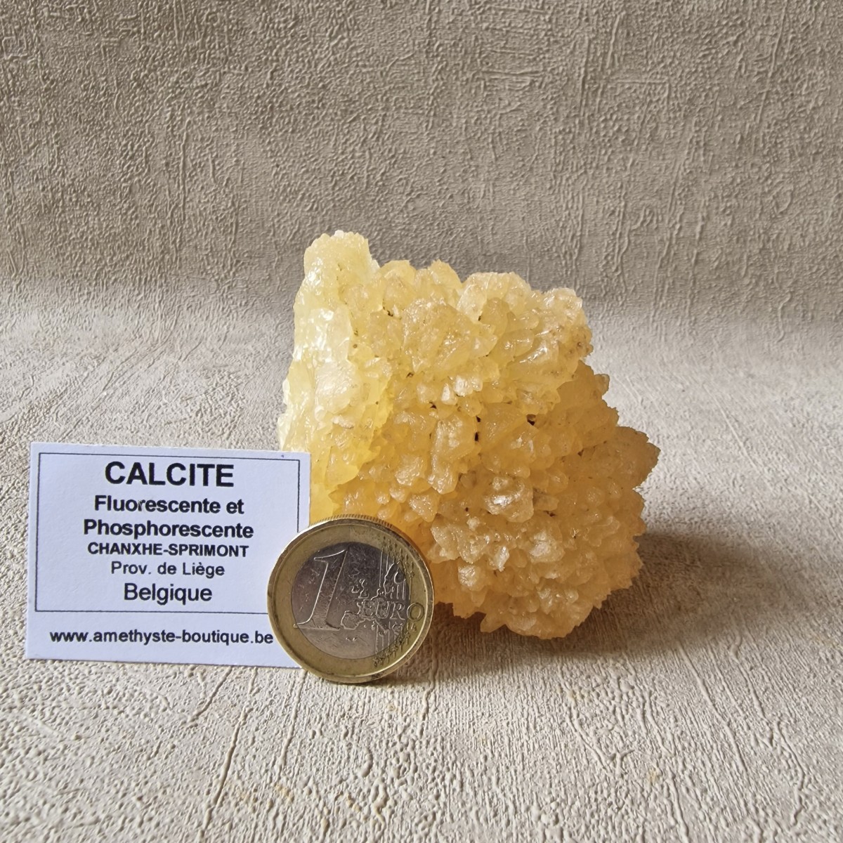 Si la fluorescence est un phénomène courant pour les calcites, celui de phosphorescence est bien plus rare. La calcite de Chanxhe a la particularité d’être à la fois fluorescente et phosphorescente.