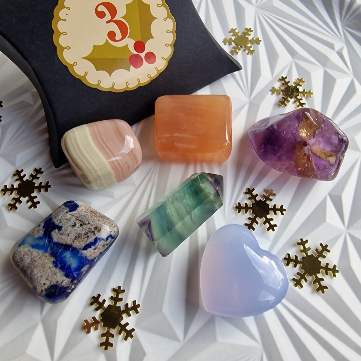 À partir de deux Collections Sélection achetées, les pierres seront emballées individuellement dans des boîtes, berlingots ou pochons numérotés de façon aléatoire. Cela préserve l’intégralité de l’effet de surprise et la magie de la découverte ! Puisque le choix du nombre d'assortiments vous appartient, nous adapterons la présentation finale pour que l’ensemble prenne l’allure d’un beau cadeau que vous serez fier d’offrir.