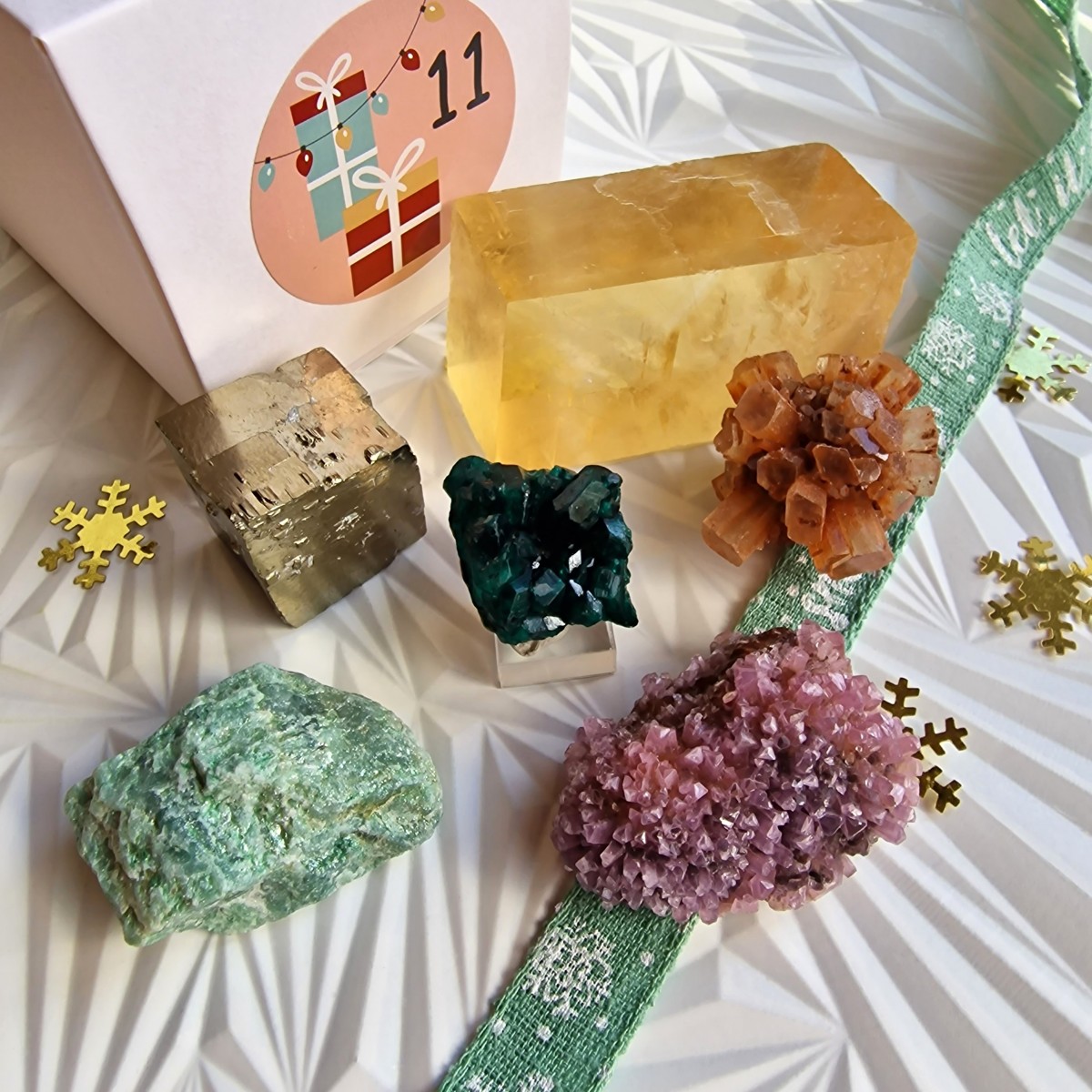 Collection Sélection 10. Celle-ci comprend les pierres suivantes : un cristal de pyrite, une calcite optique, une aragonite "hérisson", une dioptase, une fuchsite, une petite druse de cobaltocalcite