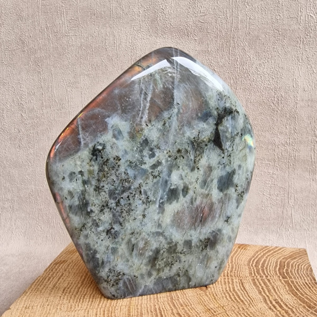 Bloc à poser de labradorite, reflets roses, cuivrés et dorés +/- 12,8 cm de haut. Litho : pierre de protection, de confiance en soi, d'introspection et de divination.(FL109-8)