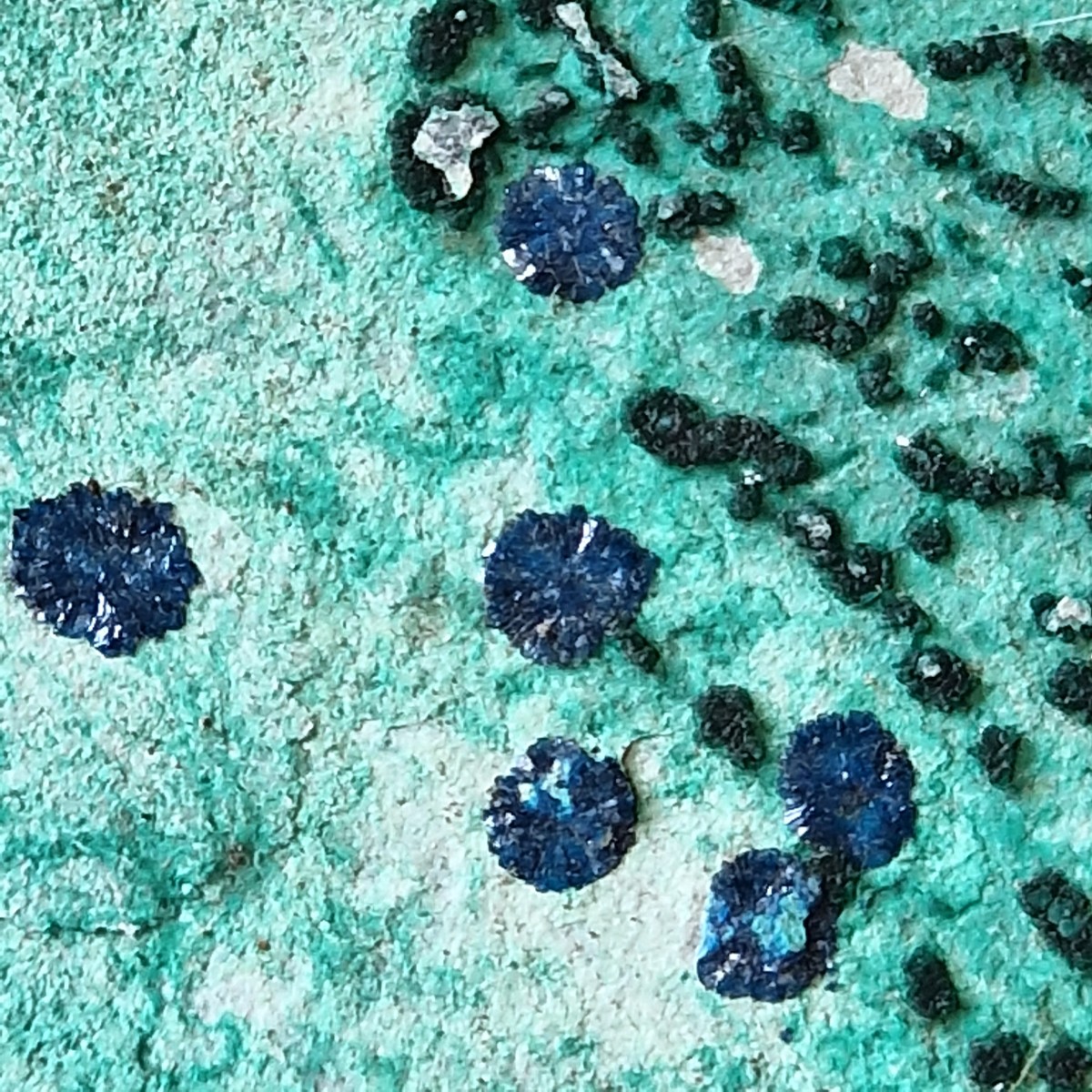 Habitus : petits prismes courts (généralement de quelques millimètres)qui peuvent se présenter sous forme de rosettes ou d'incrustations