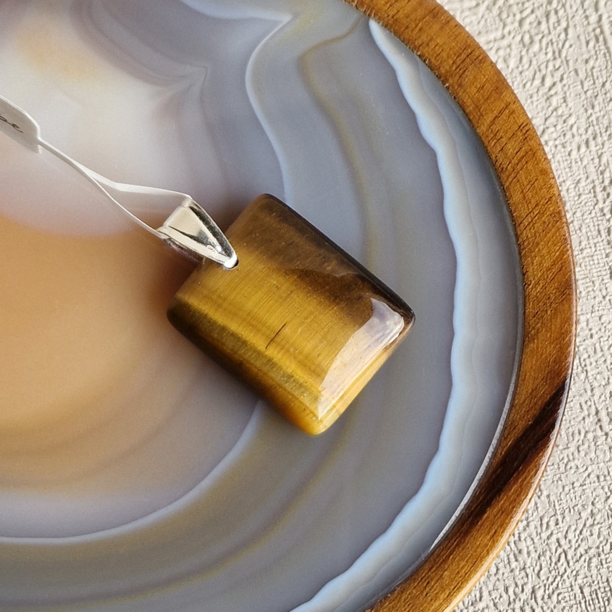 Pendentif en oeil de tigre, bélière en argent 925. Lithothérapie: pierre d'ancrage, l'oeil de tigre protège, donne force et courage et rétablit l'estime de soi.(P119-3)