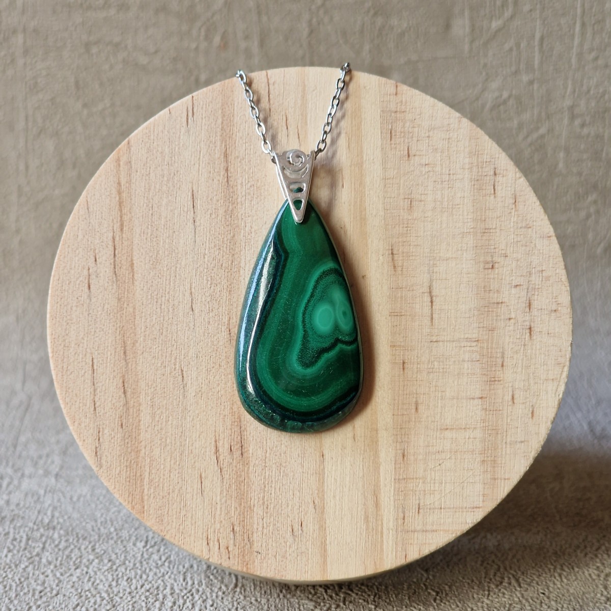 Pendentif malachite, bélière argent 925. Lithothérapie : la malachite est connue en tant que pierre de santé, de vitalité, de prospérité et de réconfort.(P113-2)
