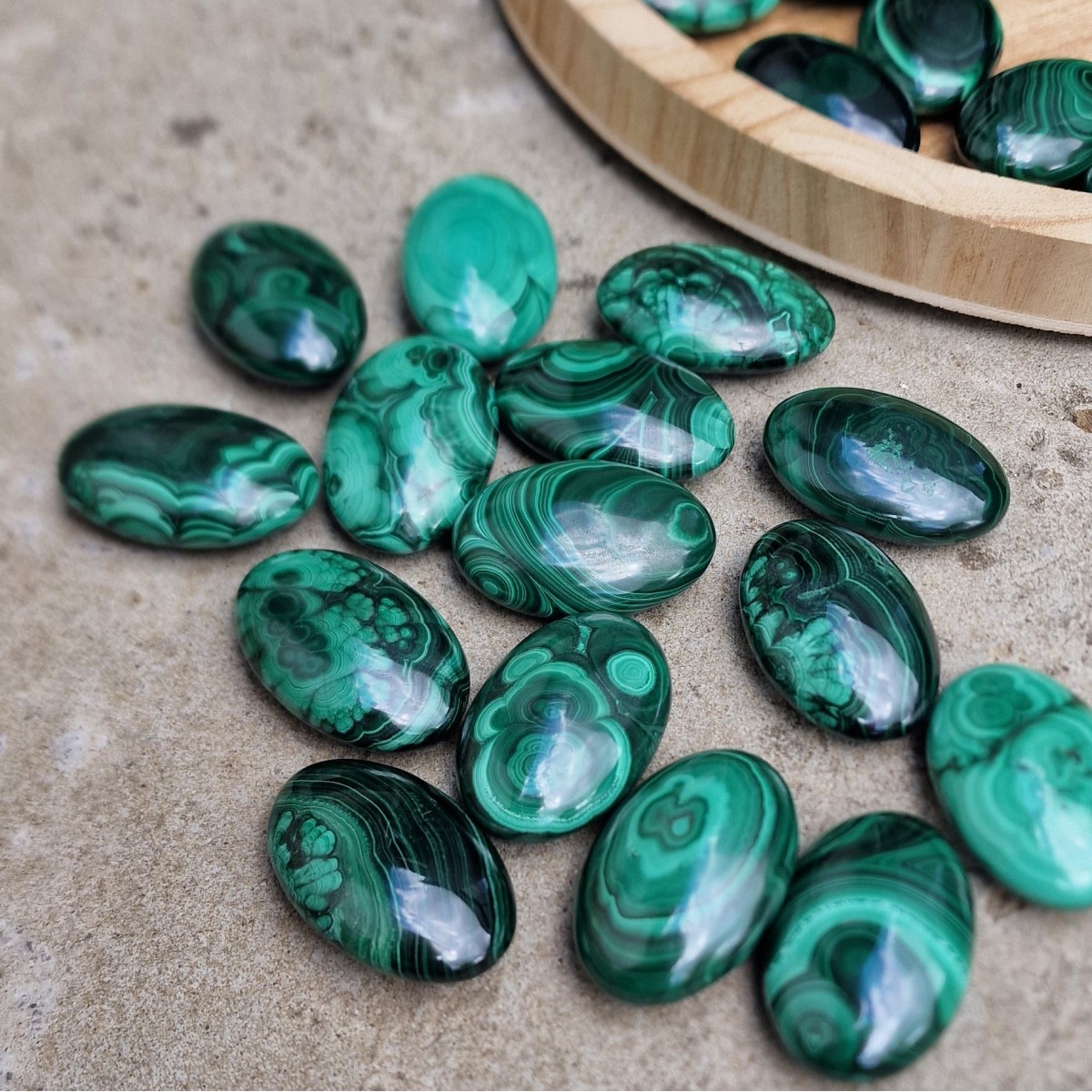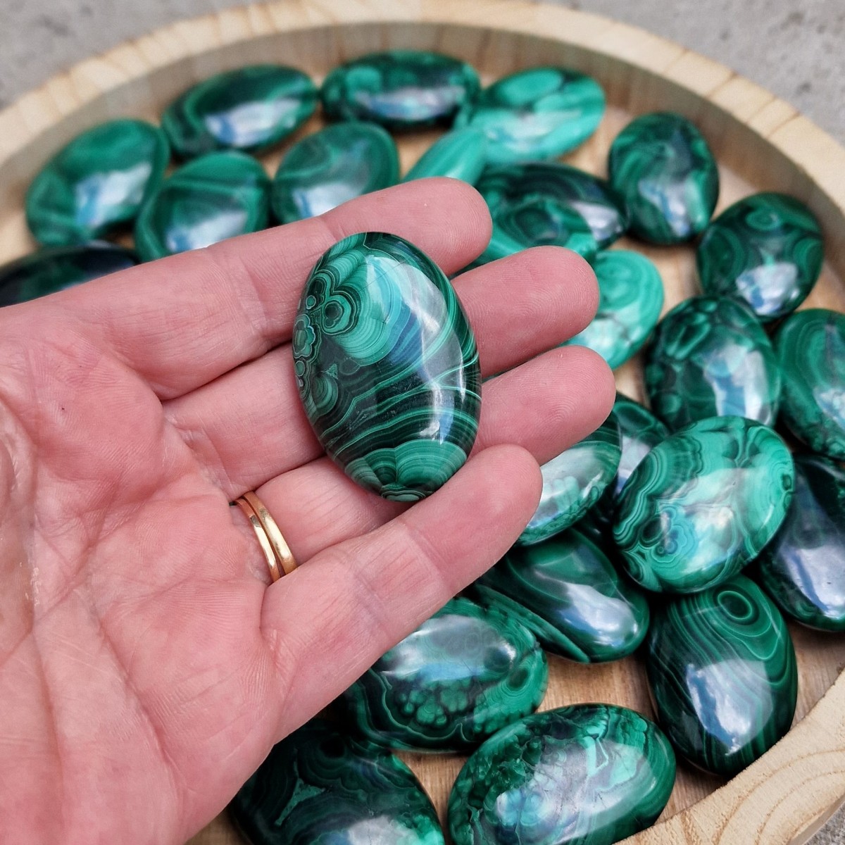 Galet de malachite de +/- 4,5 cm. Lithothérapie : aide à combattre les douleurs tant physiques qu’émotionnelles, neutralise les pensées négatives et restaure l'espoir. (GL3)