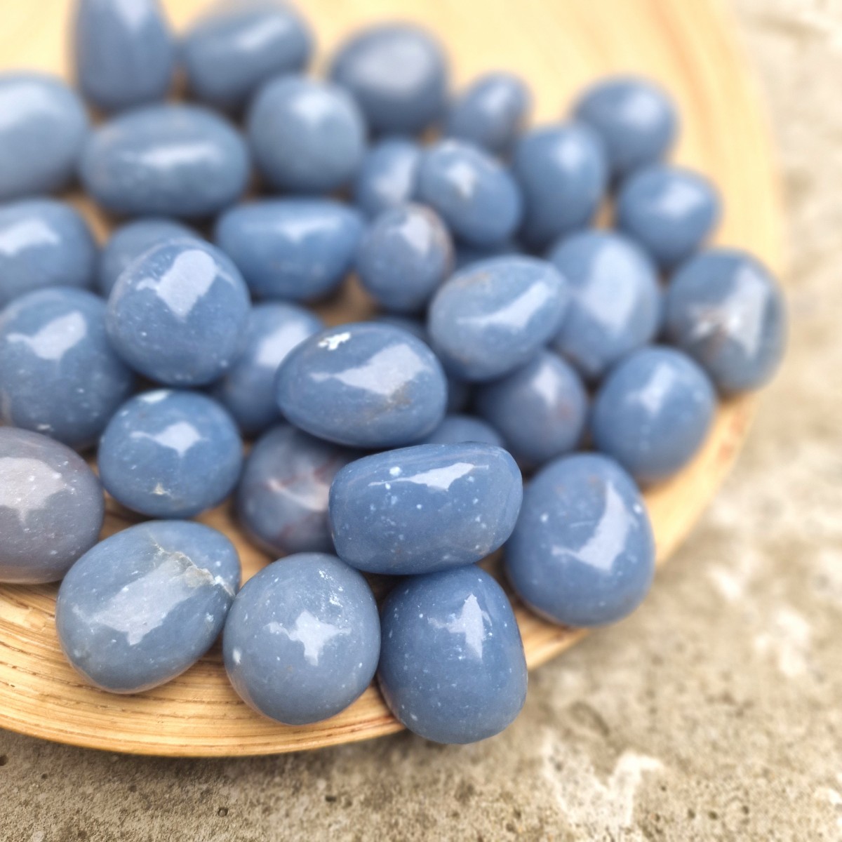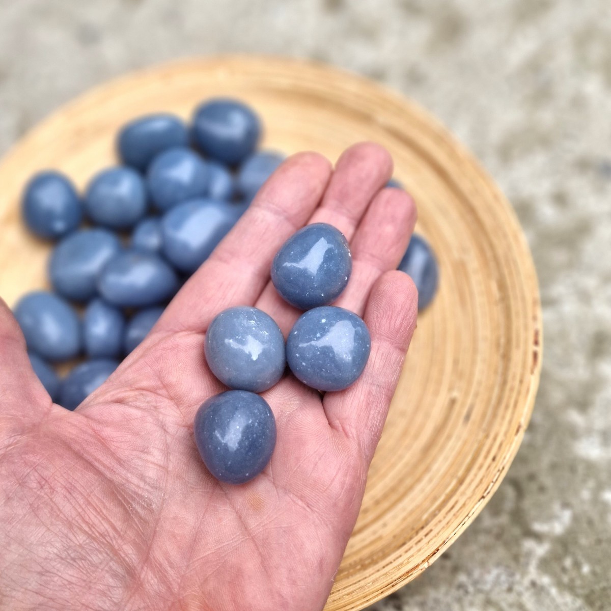 Pierre roulée d'angélite de +/- 2,5 cm. Lithothérapie : apaise, aide à surmonter les angoisses et les doutes, améliore le sommeil, favorise la communication avec les anges.(PP74)