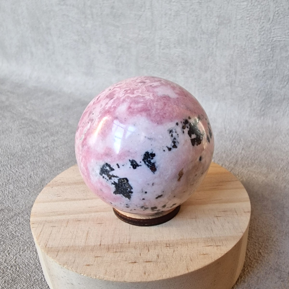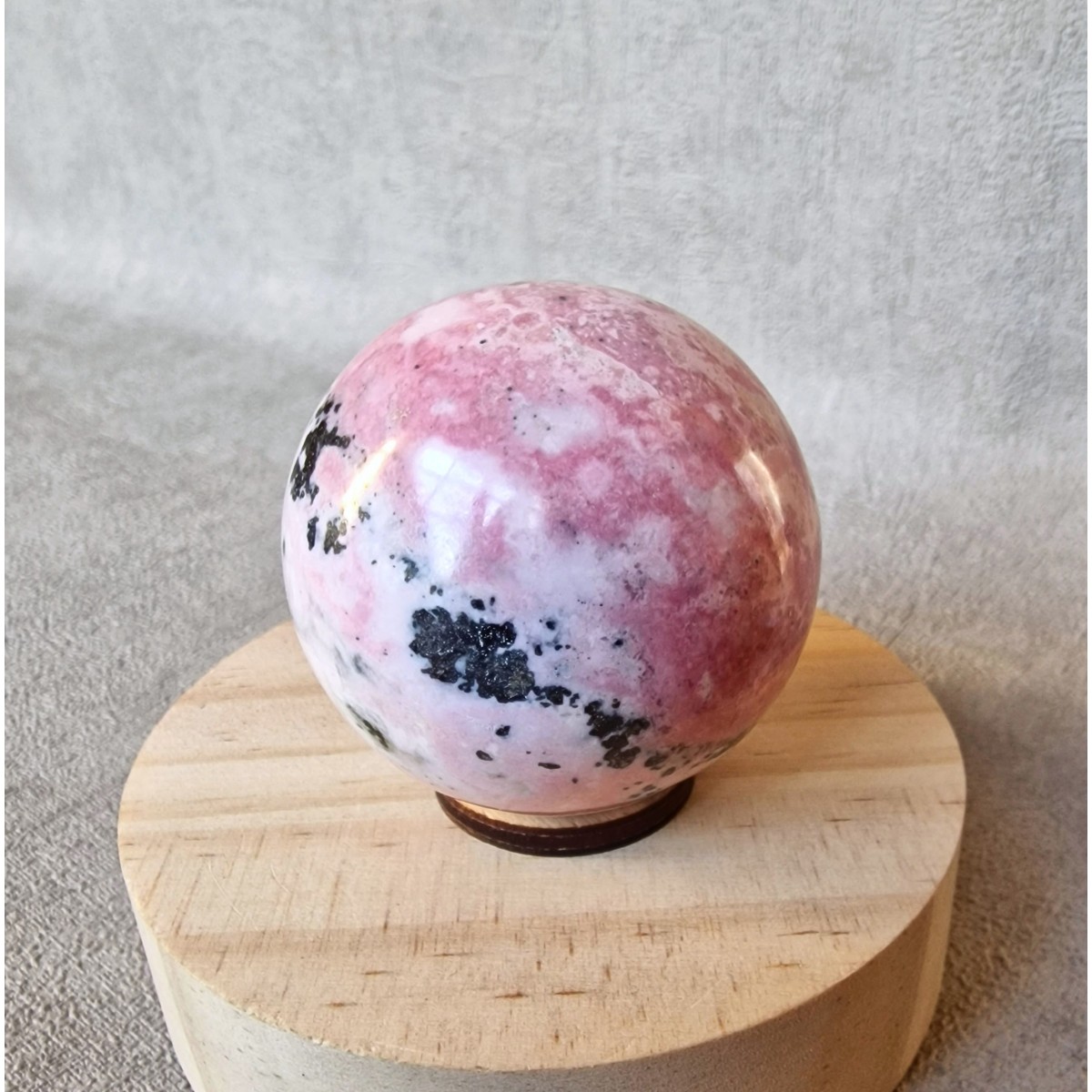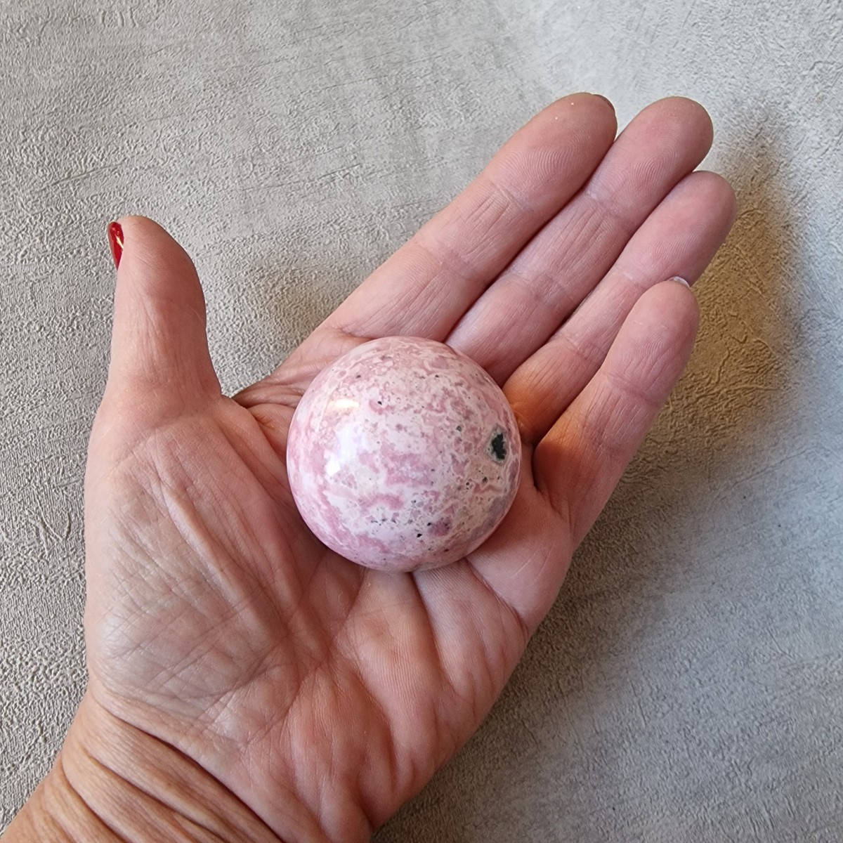 Sphère de rhodonite, +/- 4,5 cm, originaire du Pérou. Lithothérapie : placée au centre de la pièce de vie elle favorise une atmosphère apaisante et chaleureuse.(SP120-1)