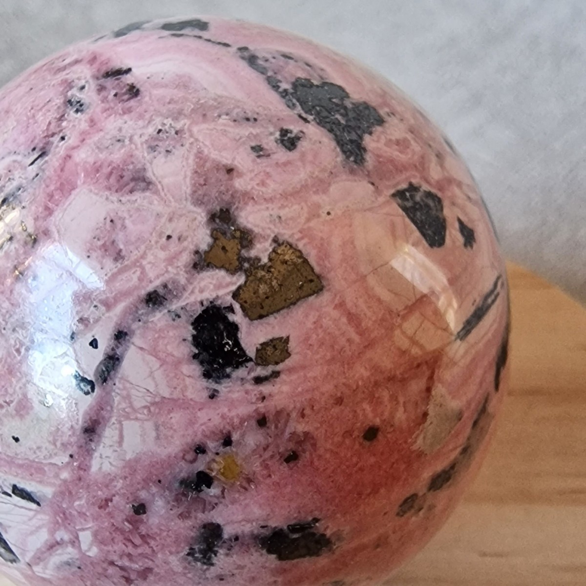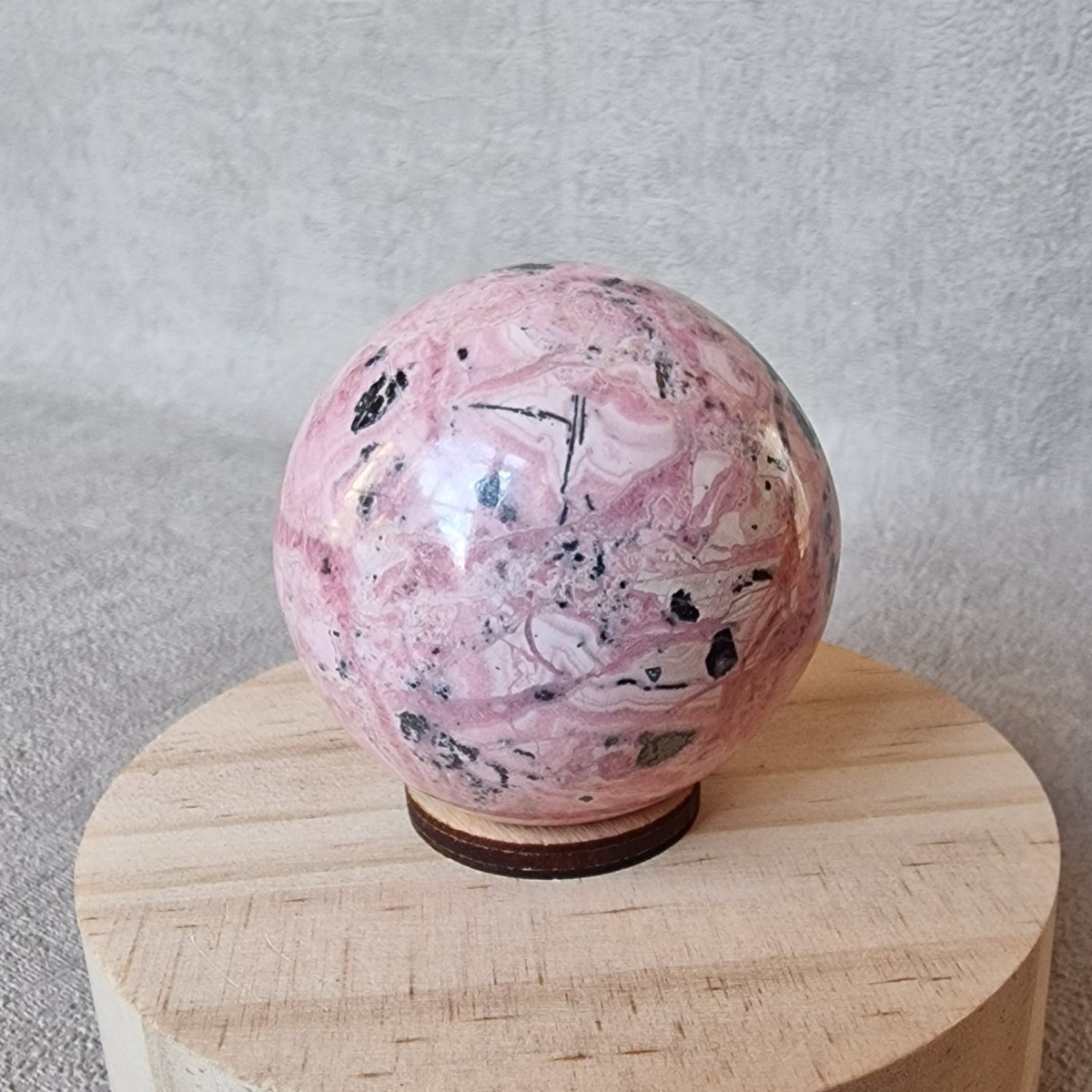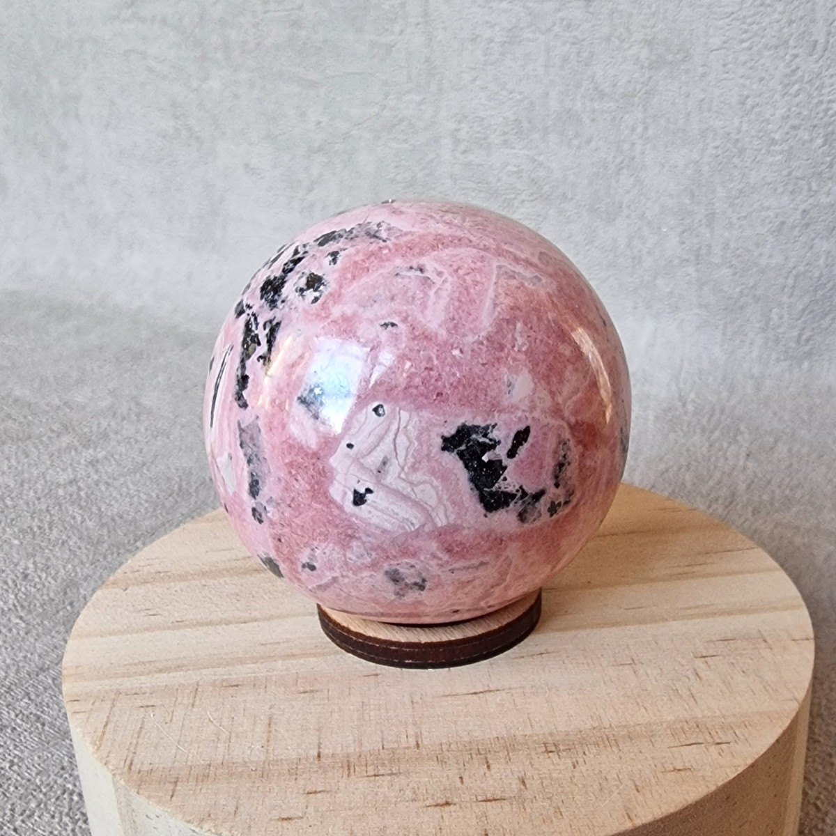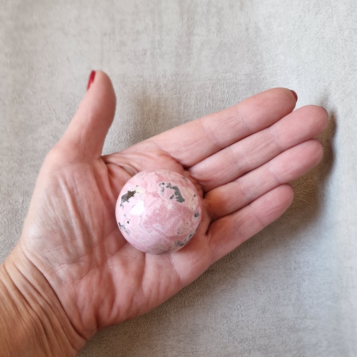 Sphère de rhodonite, +/- 4,4 cm, originaire du Pérou. Lithothérapie : placée au centre de la pièce de vie elle favorise une atmosphère apaisante et chaleureuse.(SP120-4)