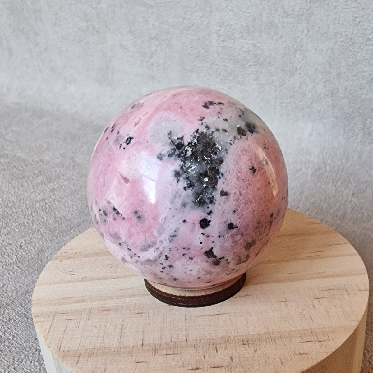 Sphère de rhodonite, +/- 4,5 cm, originaire du Pérou. Lithothérapie : placée au centre de la pièce de vie elle favorise une atmosphère apaisante et chaleureuse.(SP120-5)